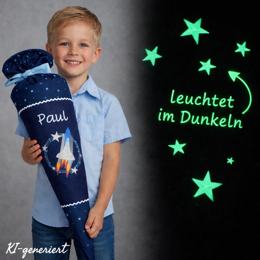Schultüte mit Rakete und Namen farblich auf den Ergobag KoBärnikus Schulranzen abgestimmt.