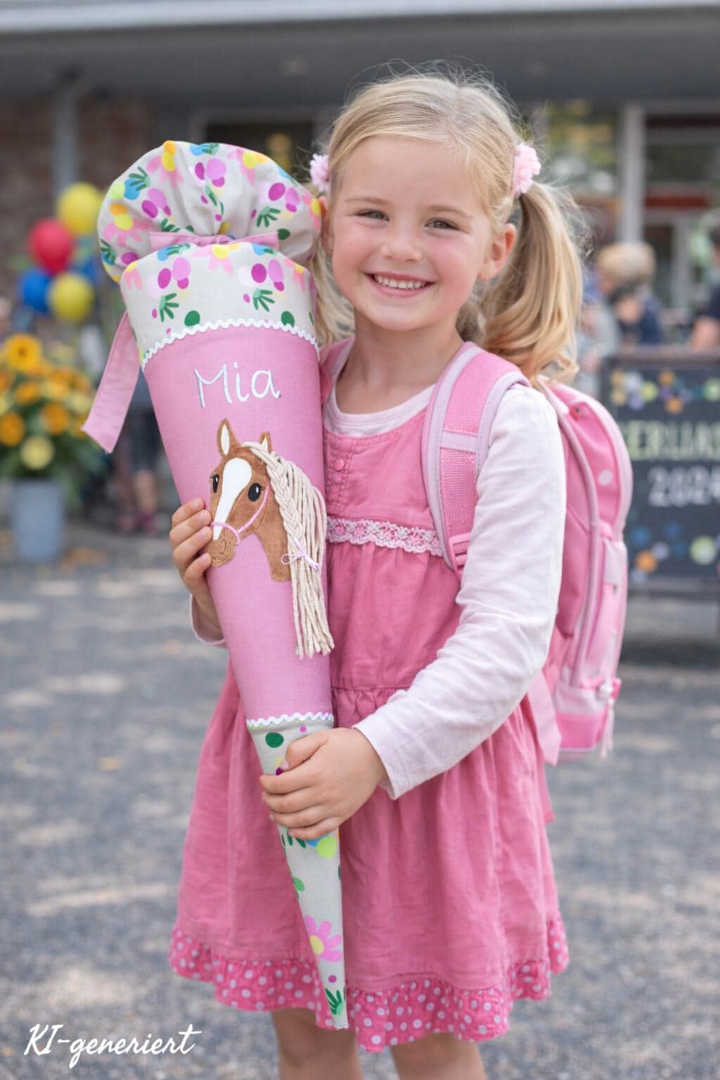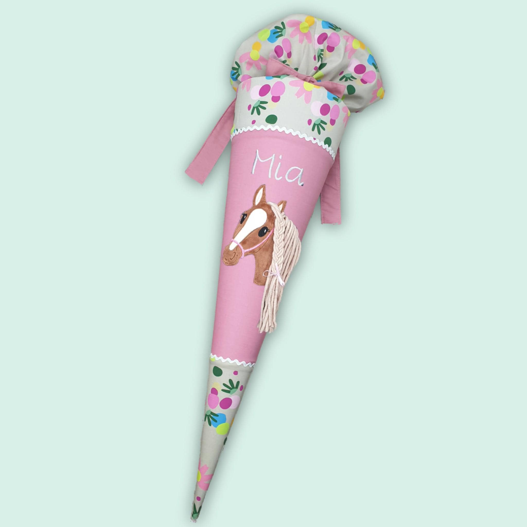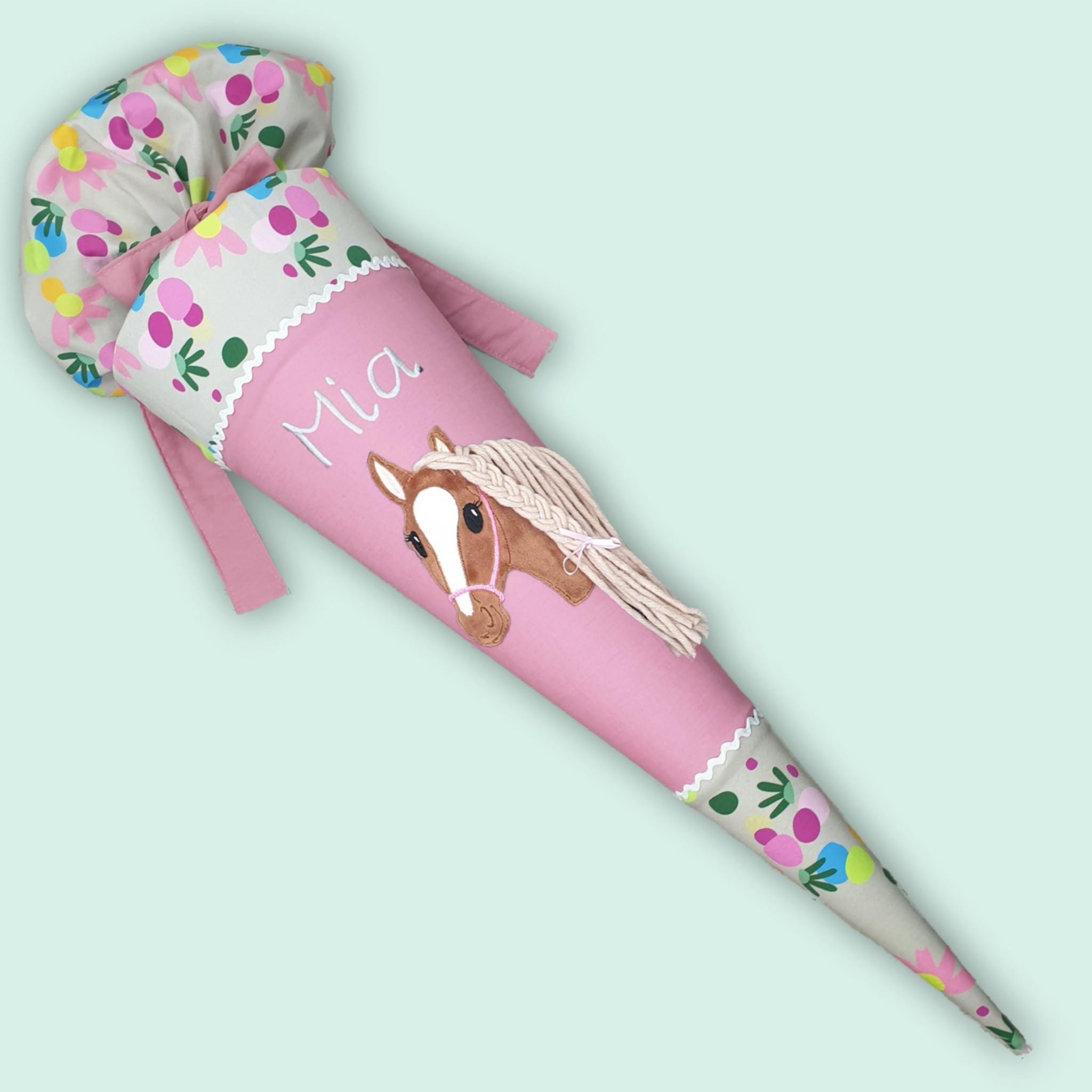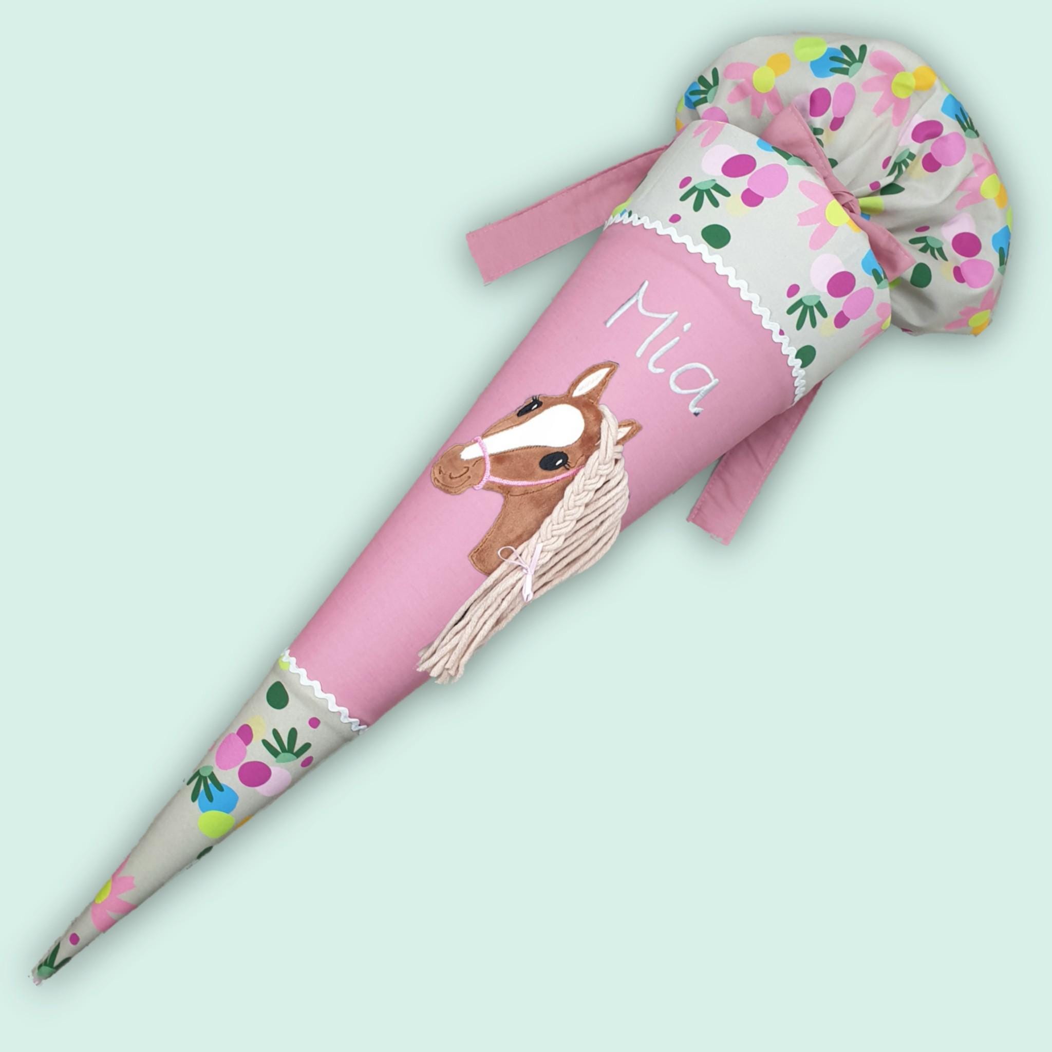 Schultüte mit Pferd und Namen farblich auf den Flower Powbär Schulranzen abgestimmt.