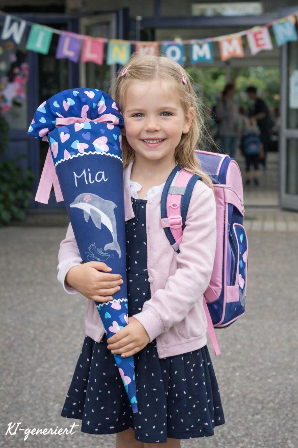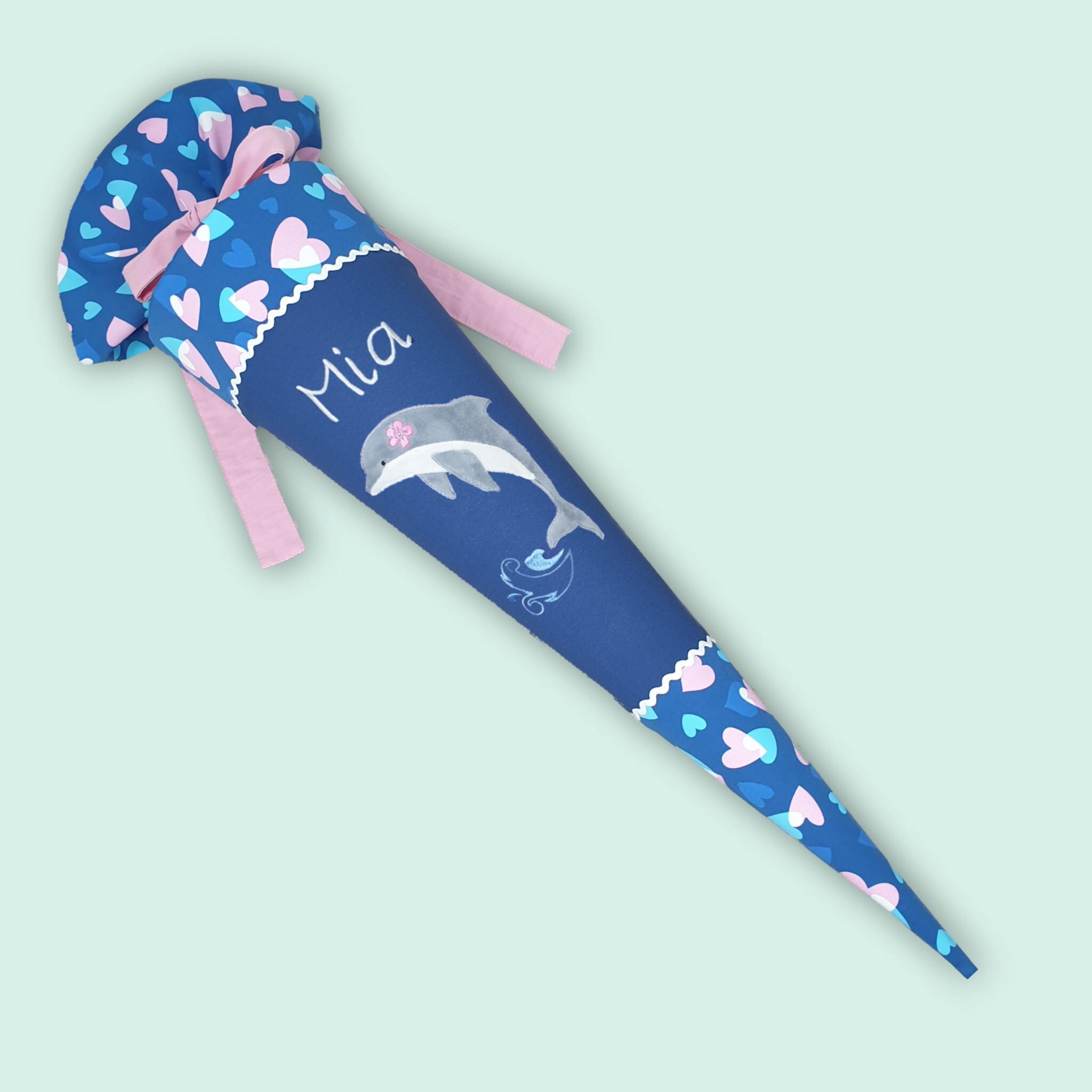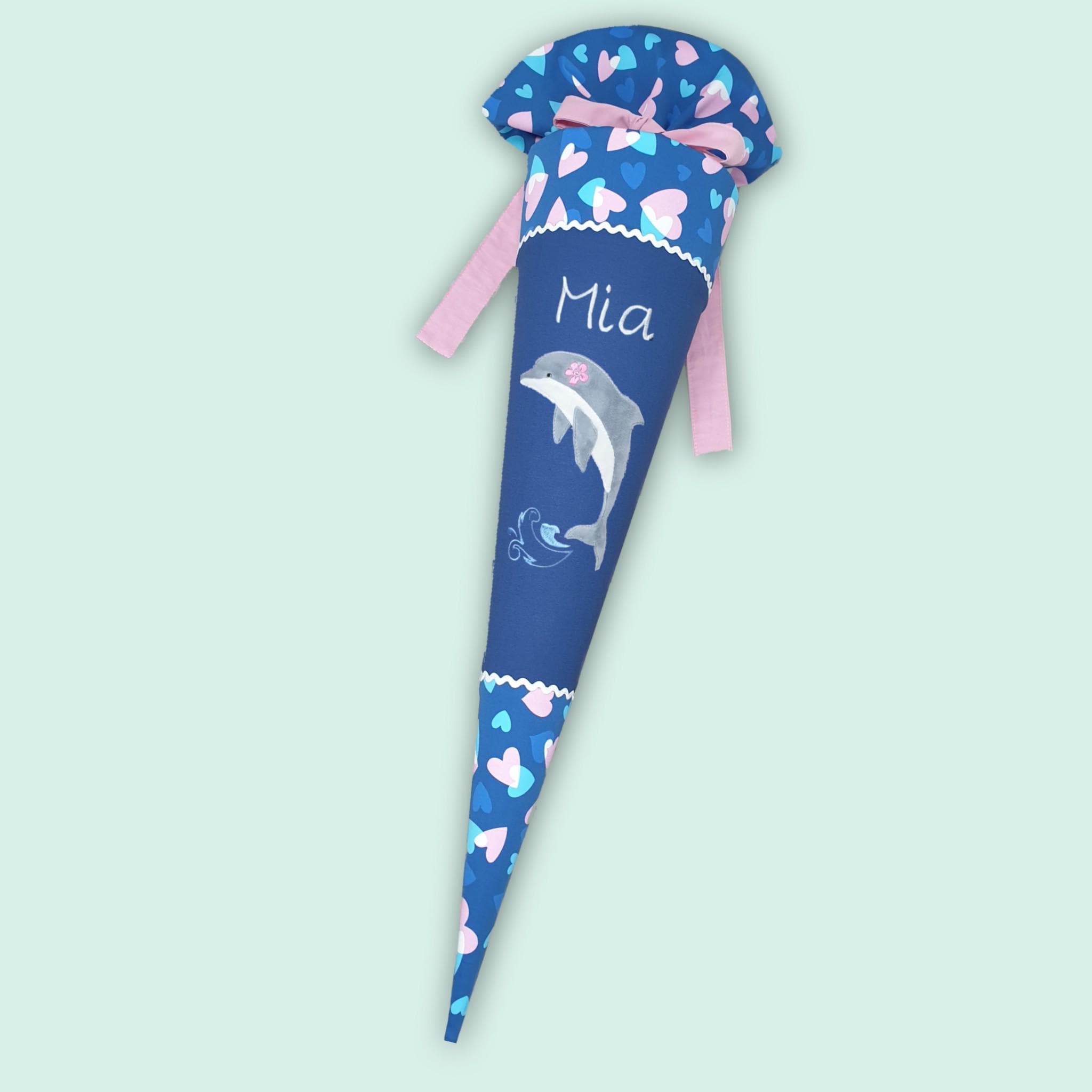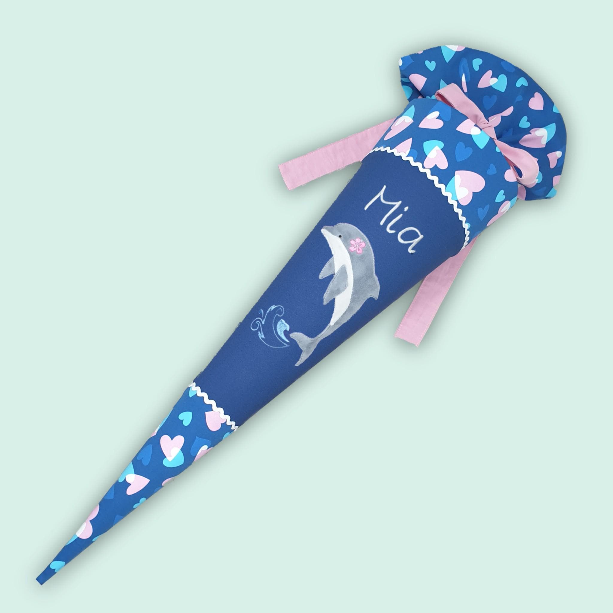 Schultüte mit Delfin und Namen farblich auf den Step by step Seashell Pearl Schulranzen abgestimmt.