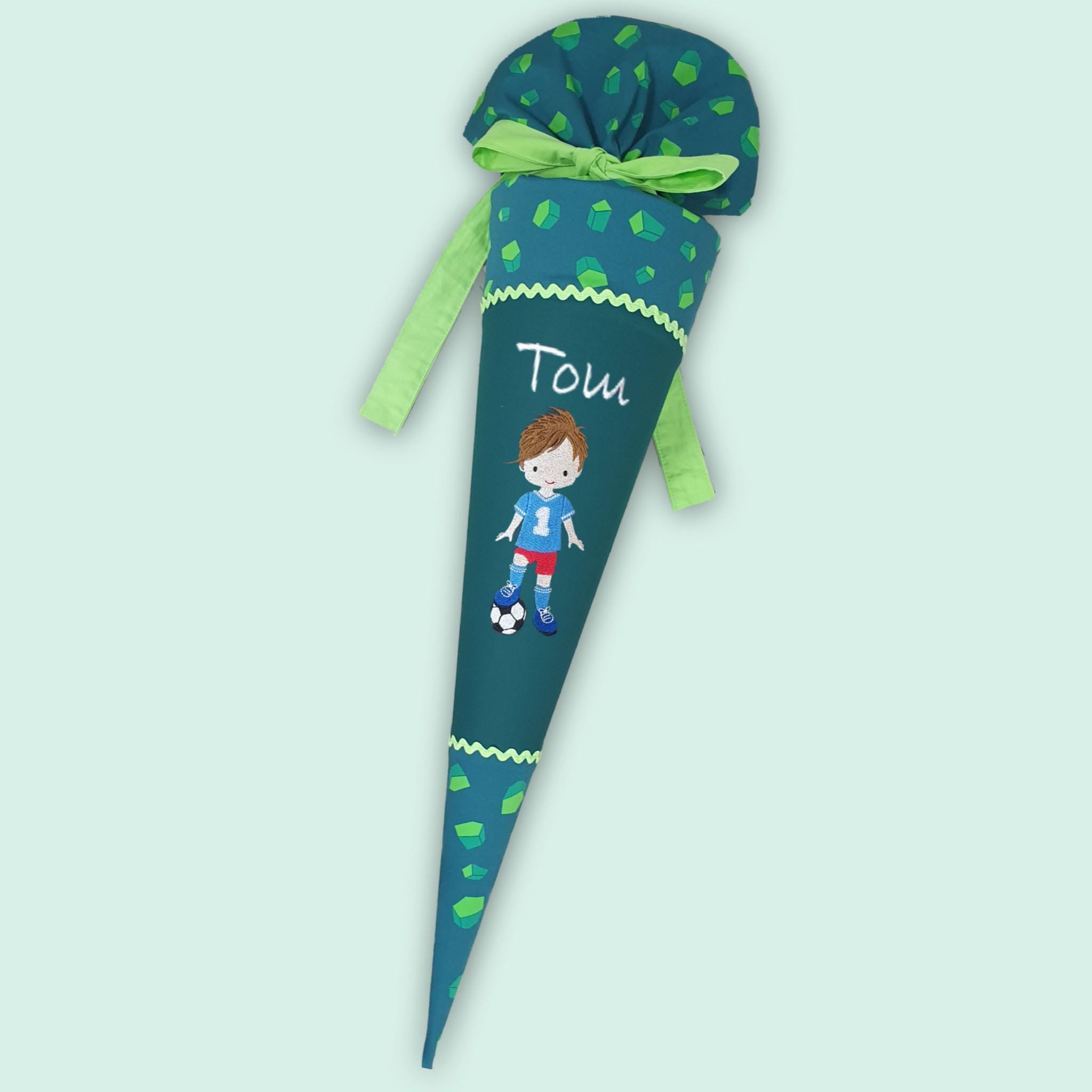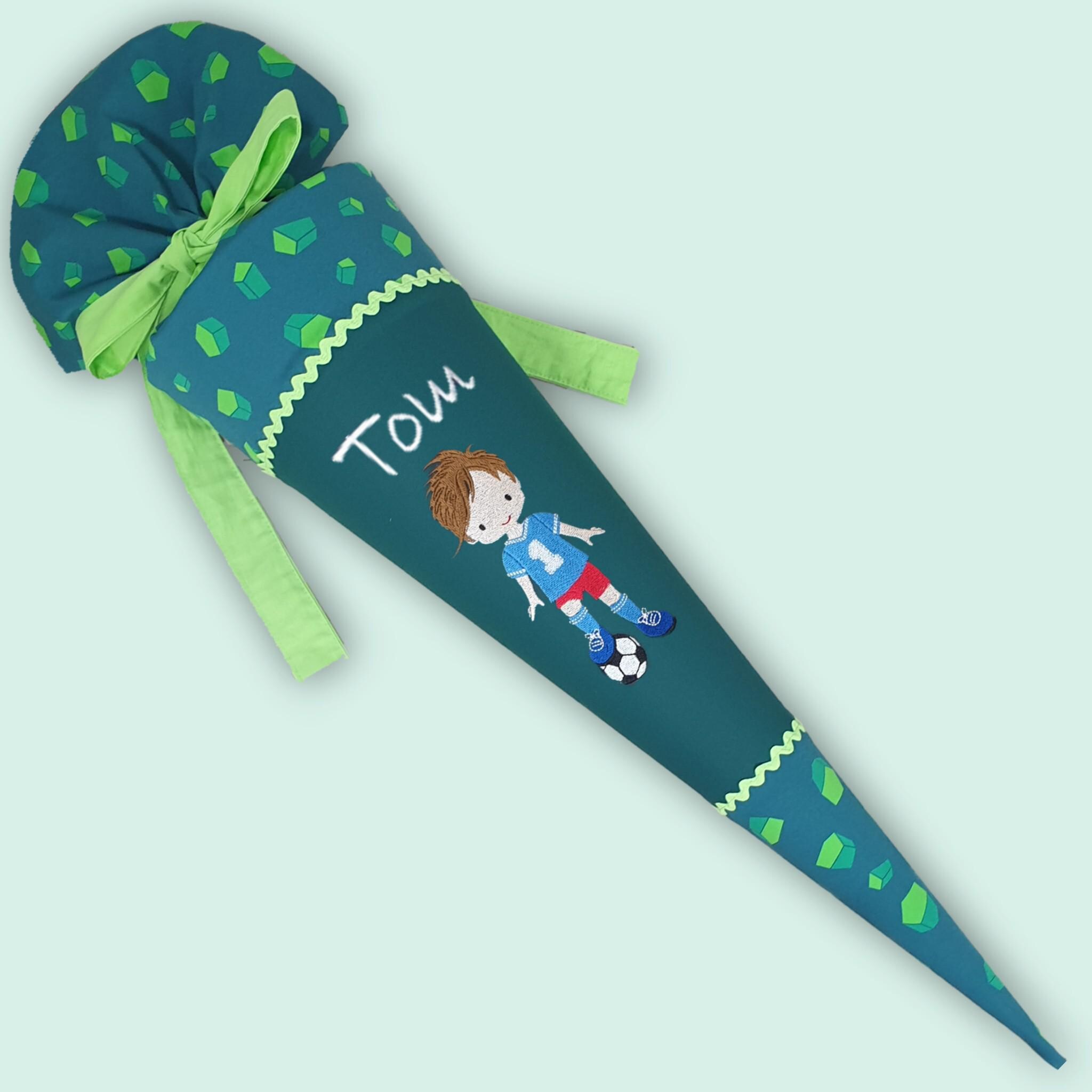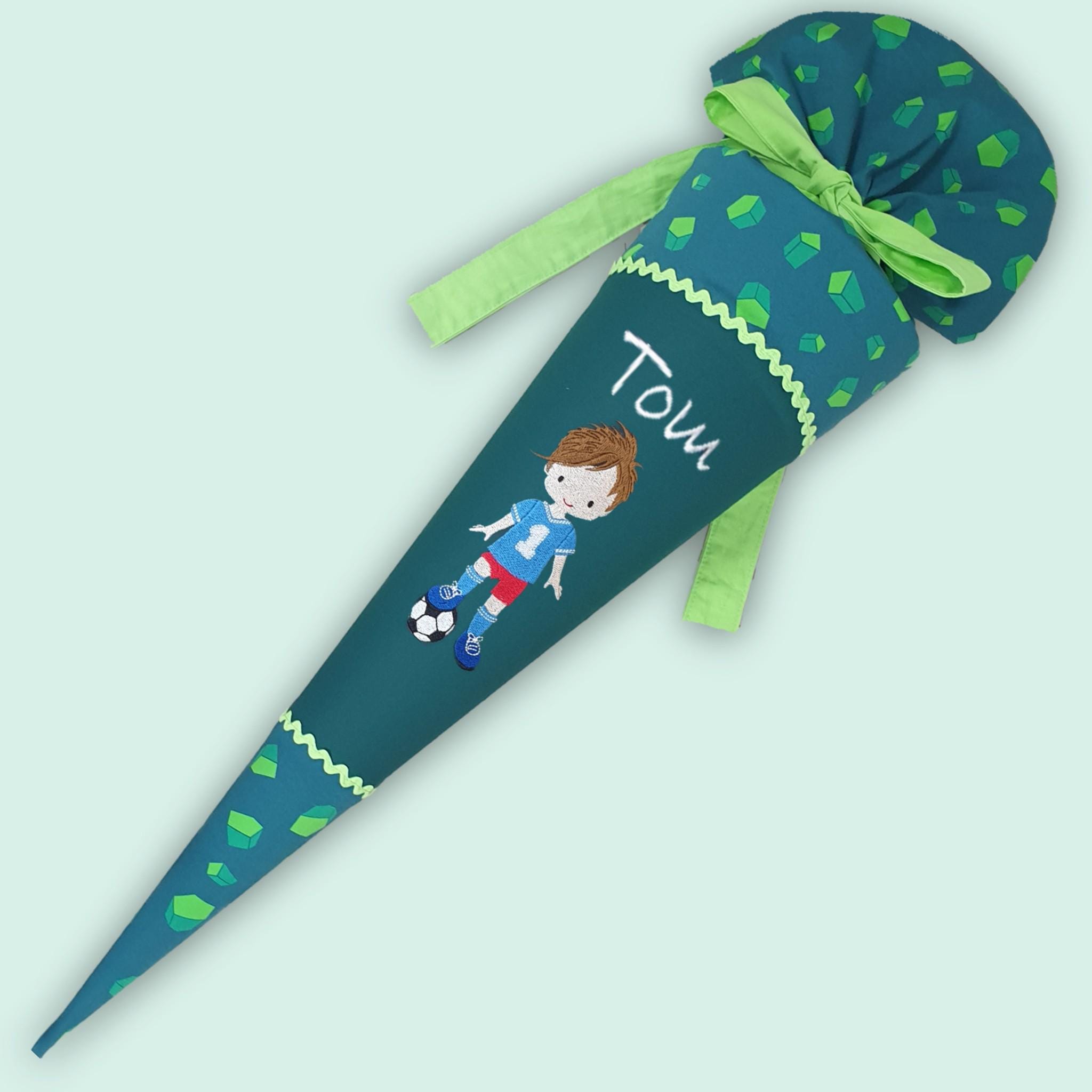 Schultüte mit Fussballer und Namen farblich auf den Dino Targo Schulranzen abgestimmt.