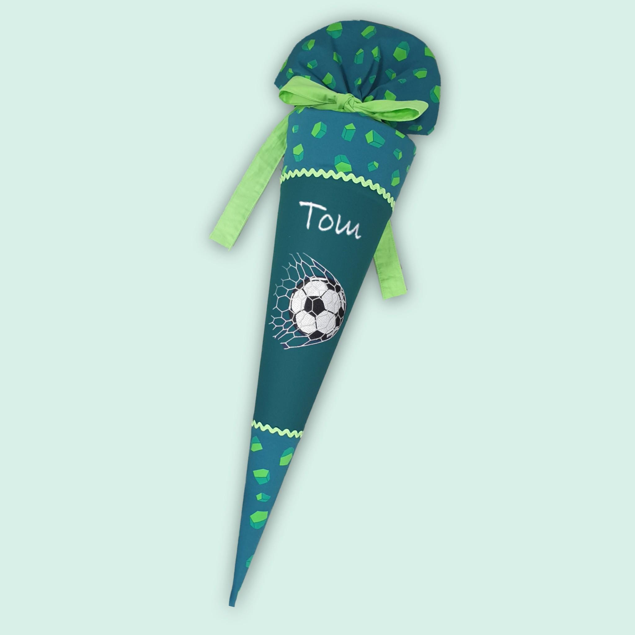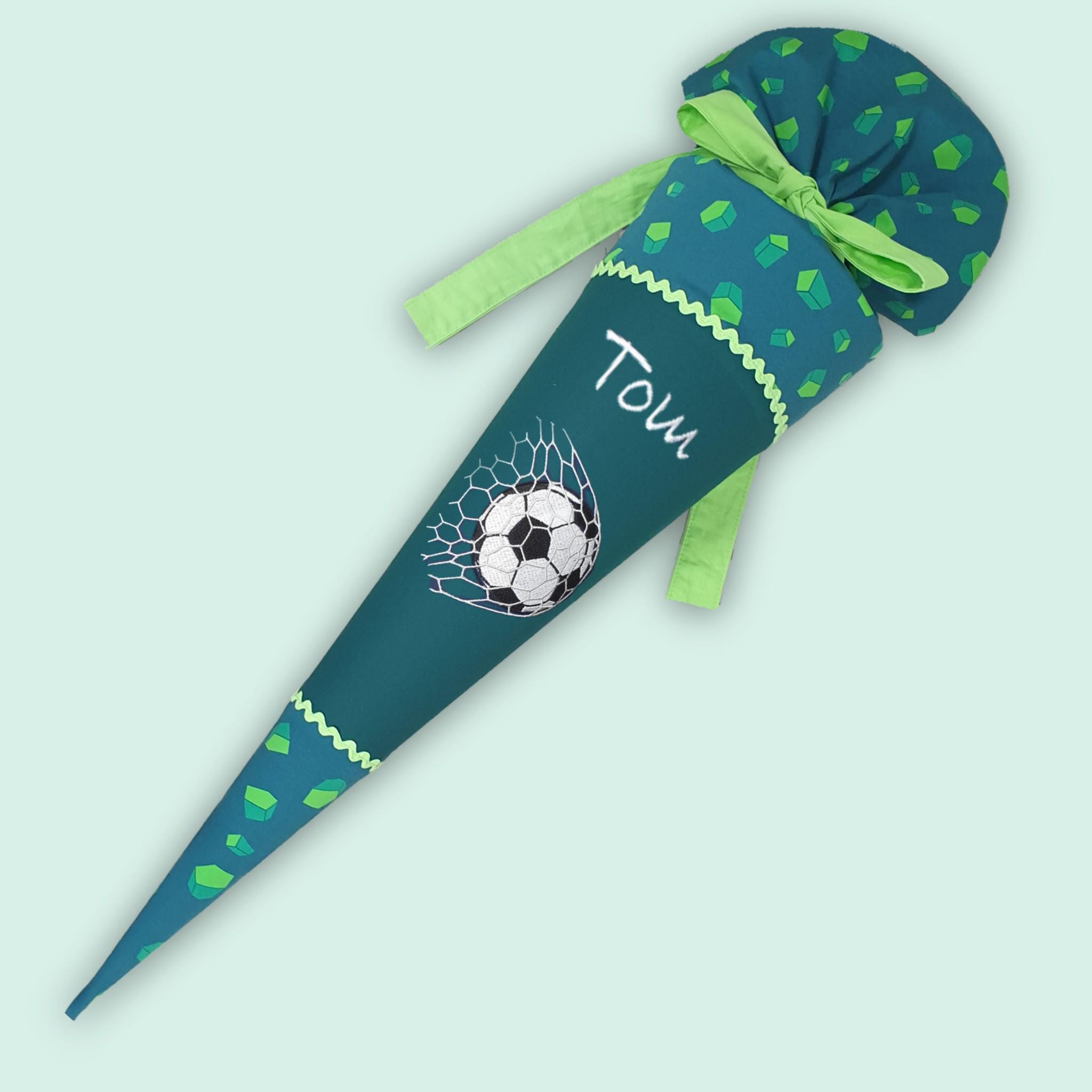Schultüte mit Fussball und Namen farblich auf den Dino Targo Schulranzen abgestimmt.