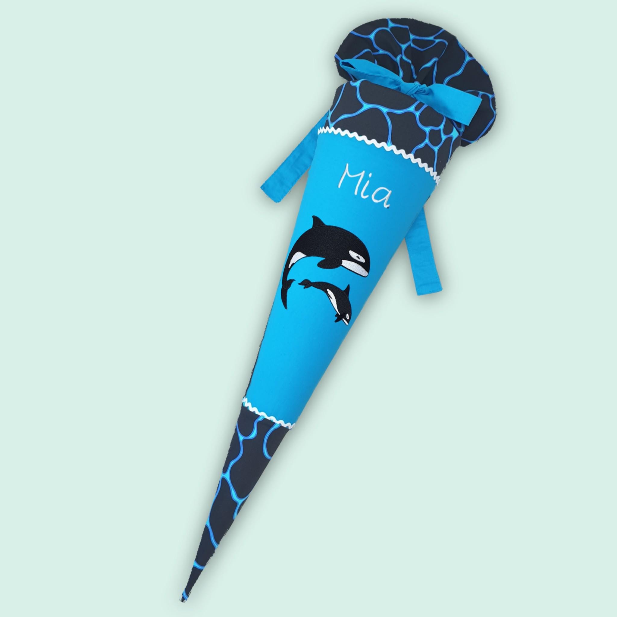 Schultüte mit Orca und Namen farblich auf den Bärassic Garden Schulranzen abgestimmt.