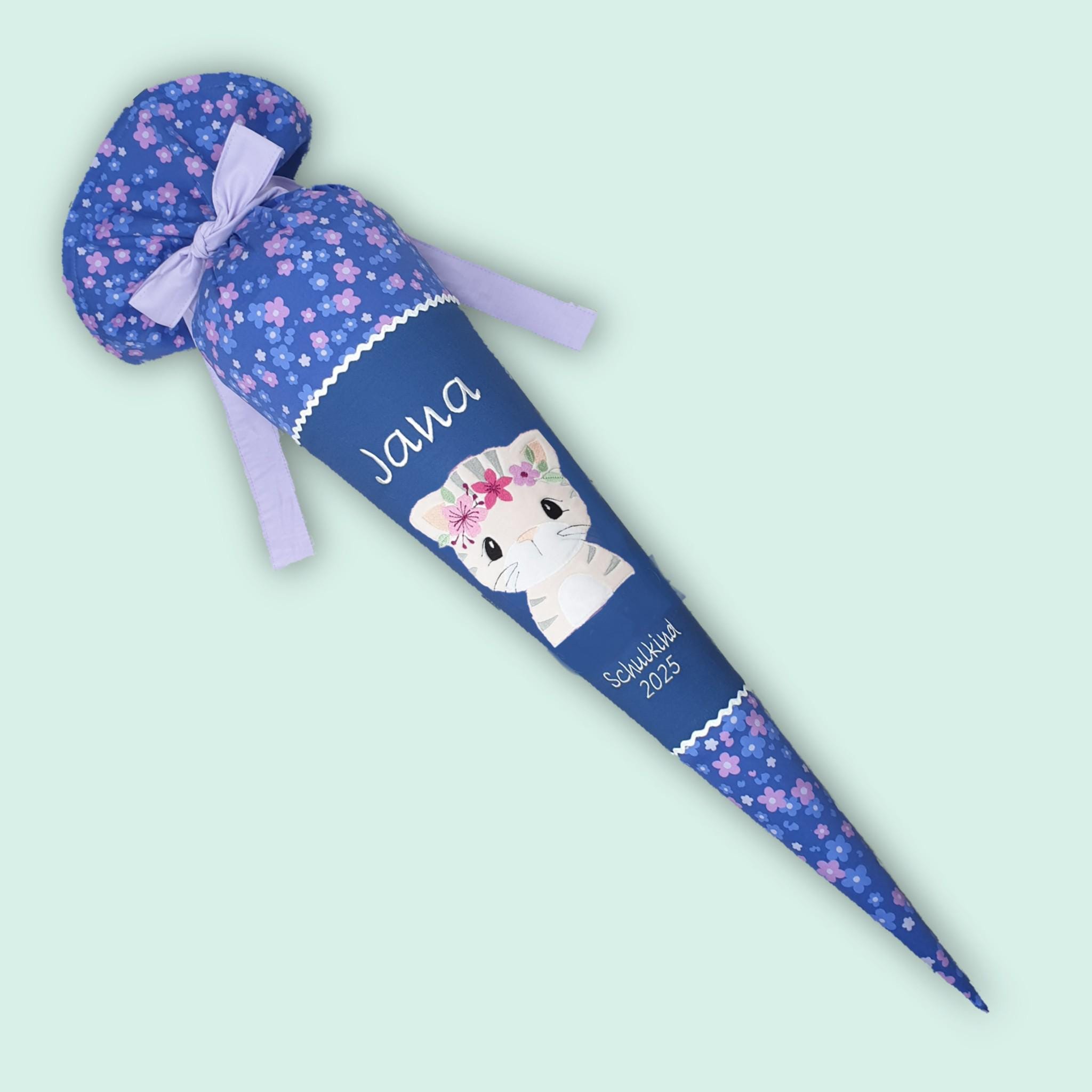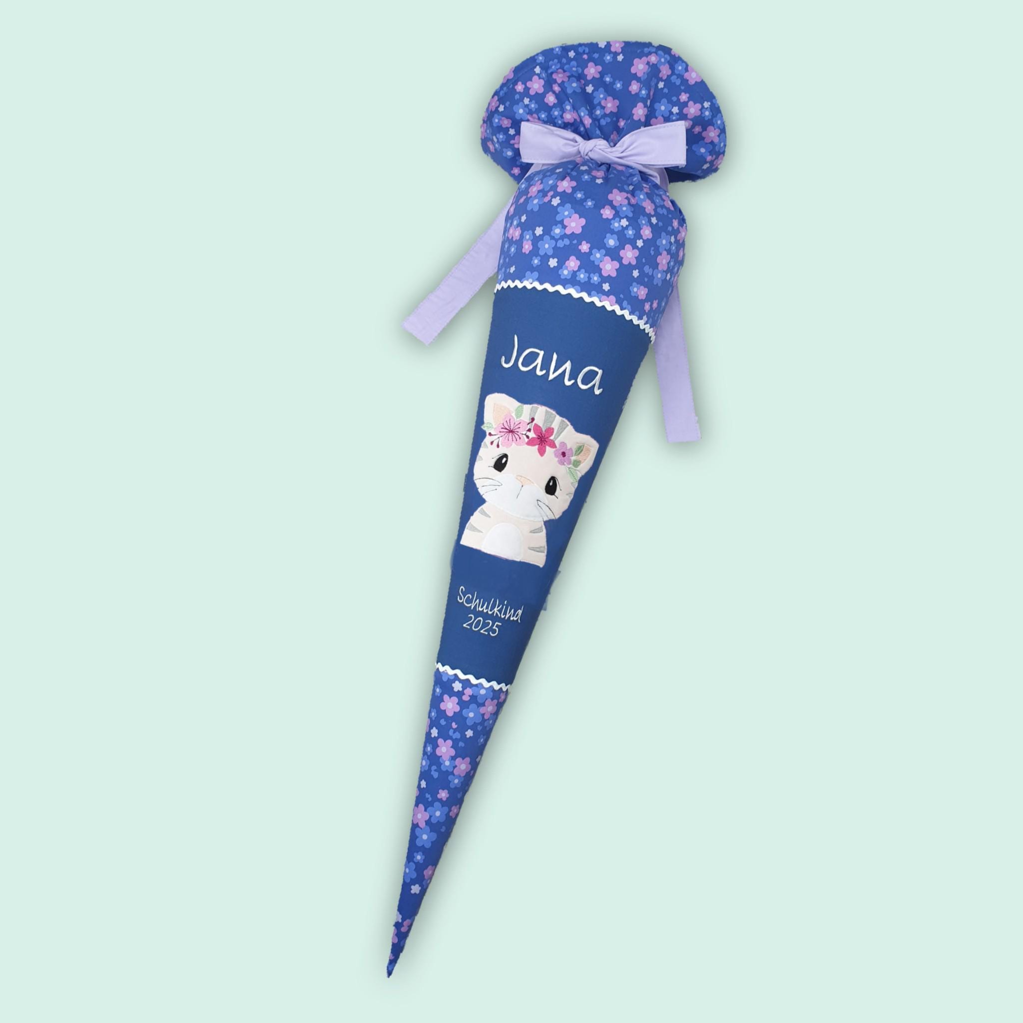 Jede Schultüte wird mit einem gestickten Motiv und dem Namen deines Kindes individuell gestaltet. Auf Wunsch fügen wir auch das Datum des ersten Schultages hinzu.