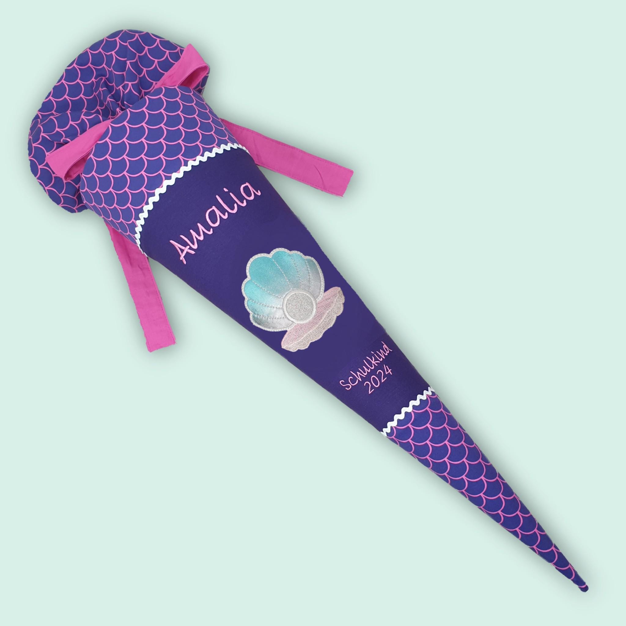 Schultüte mit Muschel und Namen farblich auf den Ergobag Perlentauchbär Schulranzen abgestimmt.