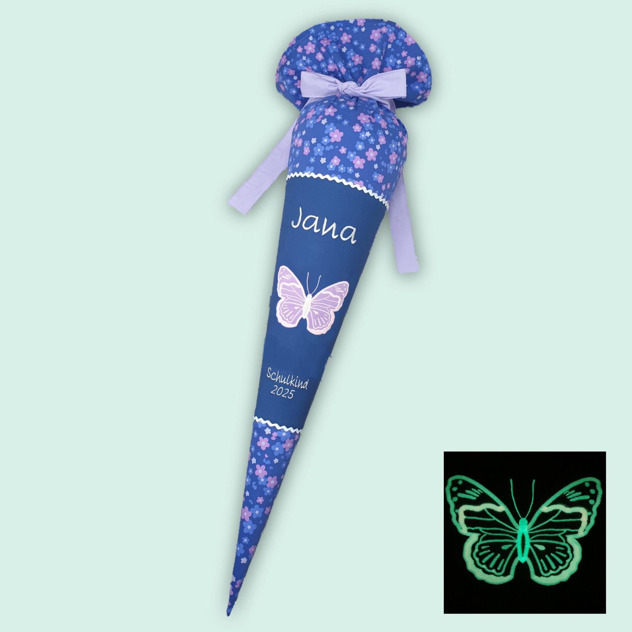 Schultüte mit Schmetterlinge (leuchten im Dunkeln) und Namen farblich auf den Step by step Butterfly Maja Schulranzen abgestimmt.