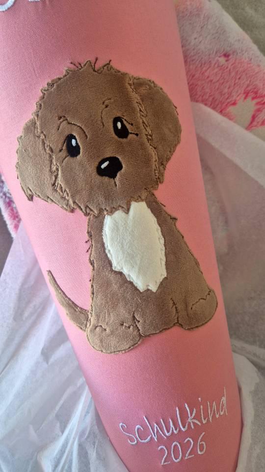 Schultüte mit Hund und Namen farblich auf den Flower Powbär Schulranzen abgestimmt.