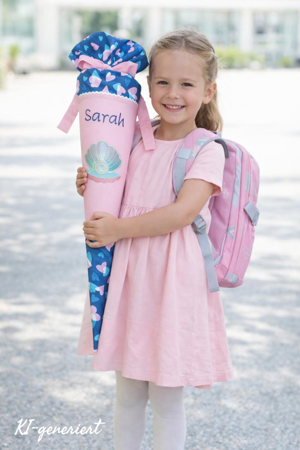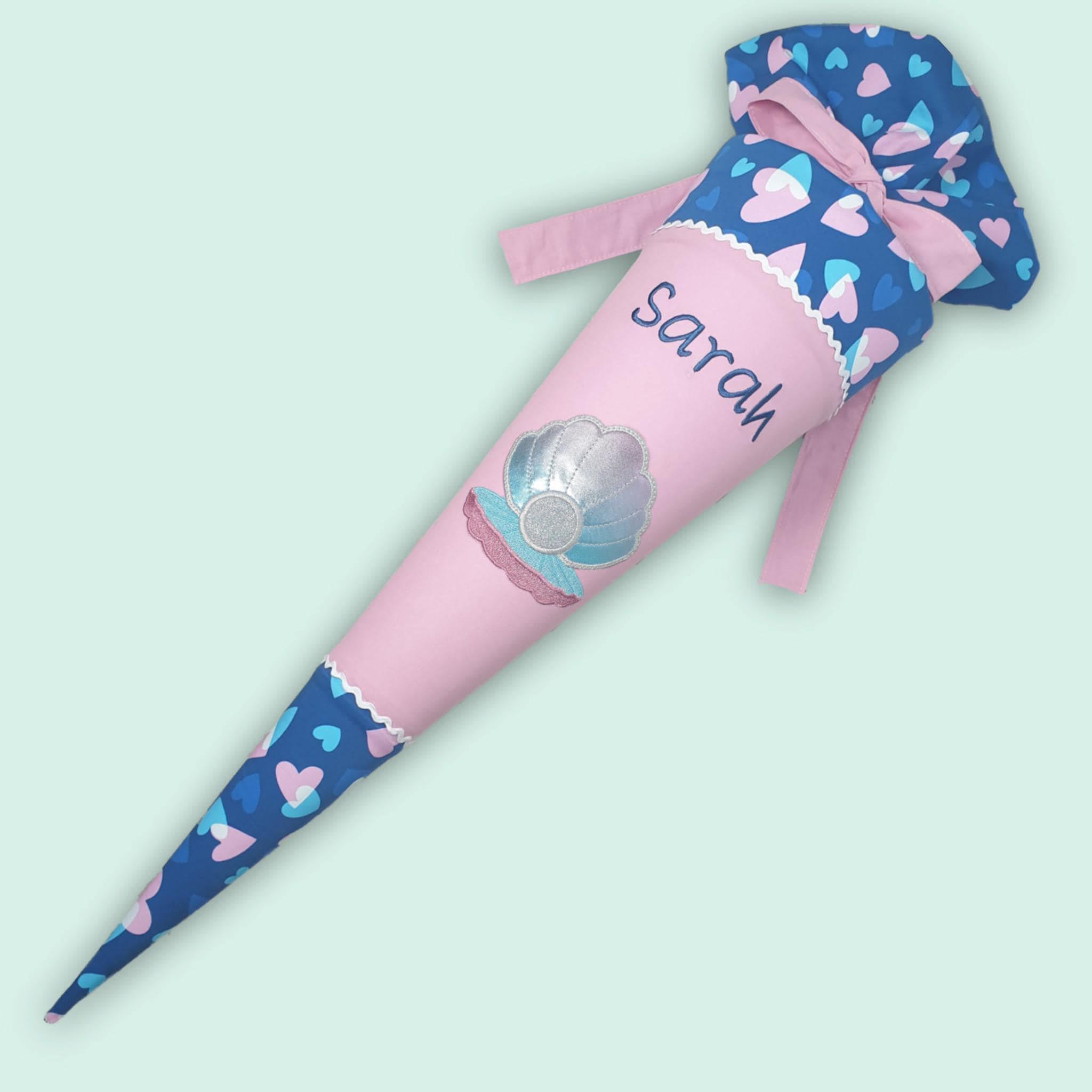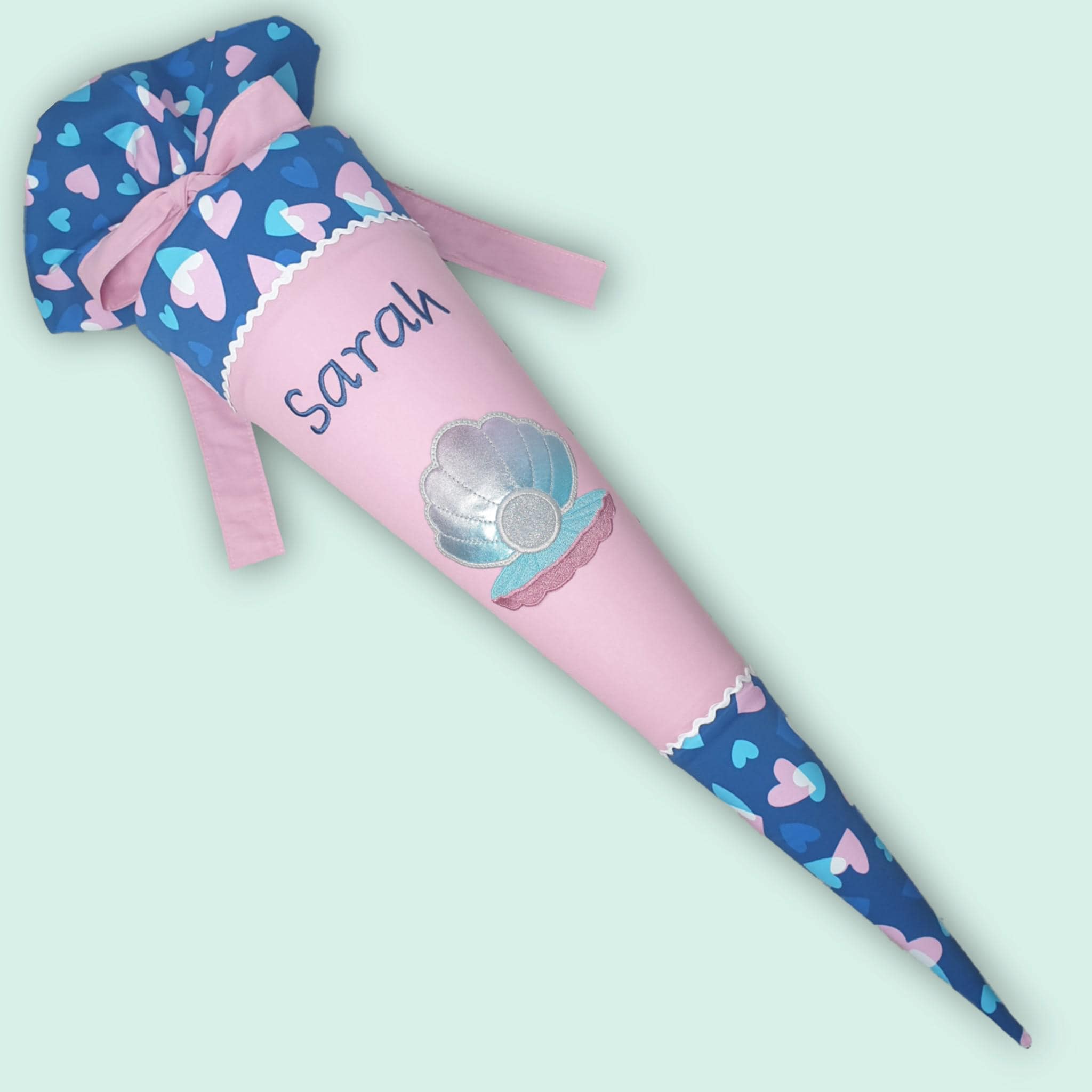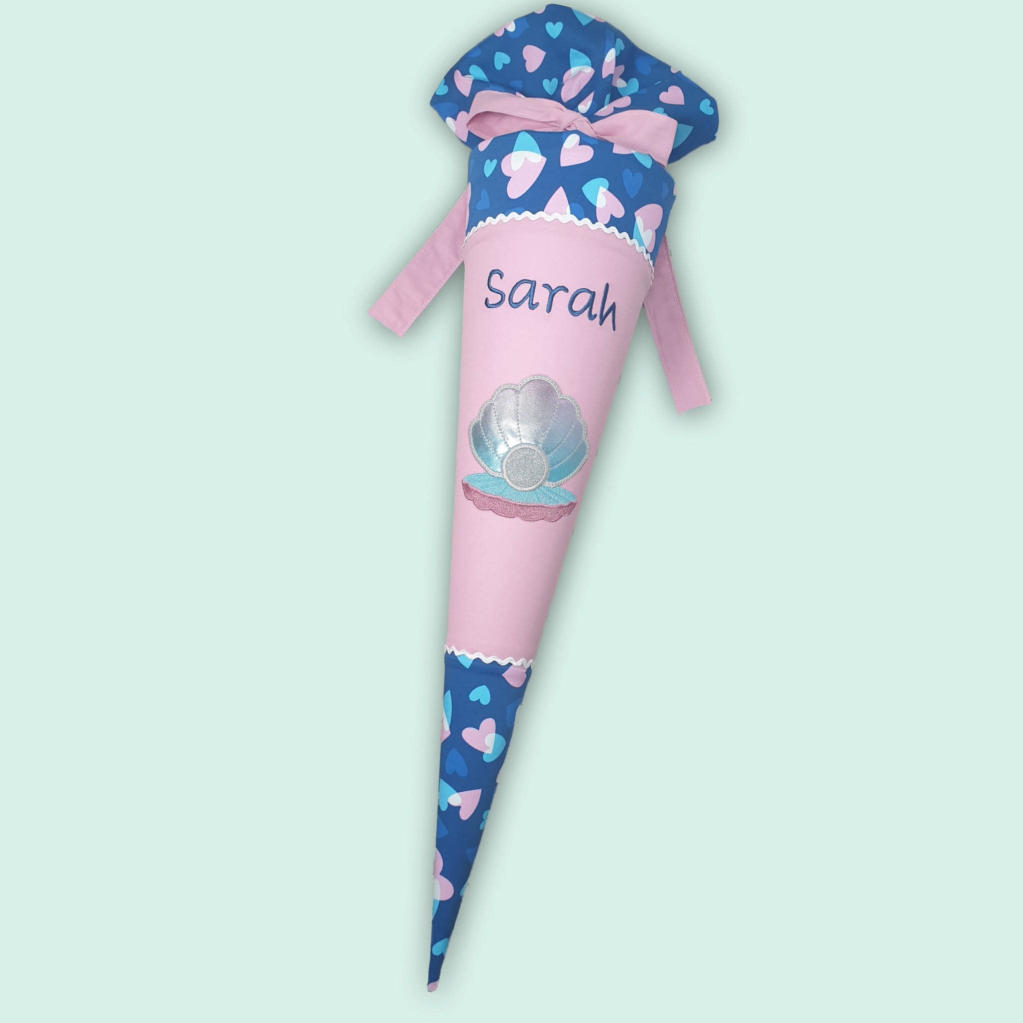Schultüte mit Muschel und Namen farblich auf den Step by step Seashell Pearl Schulranzen abgestimmt.