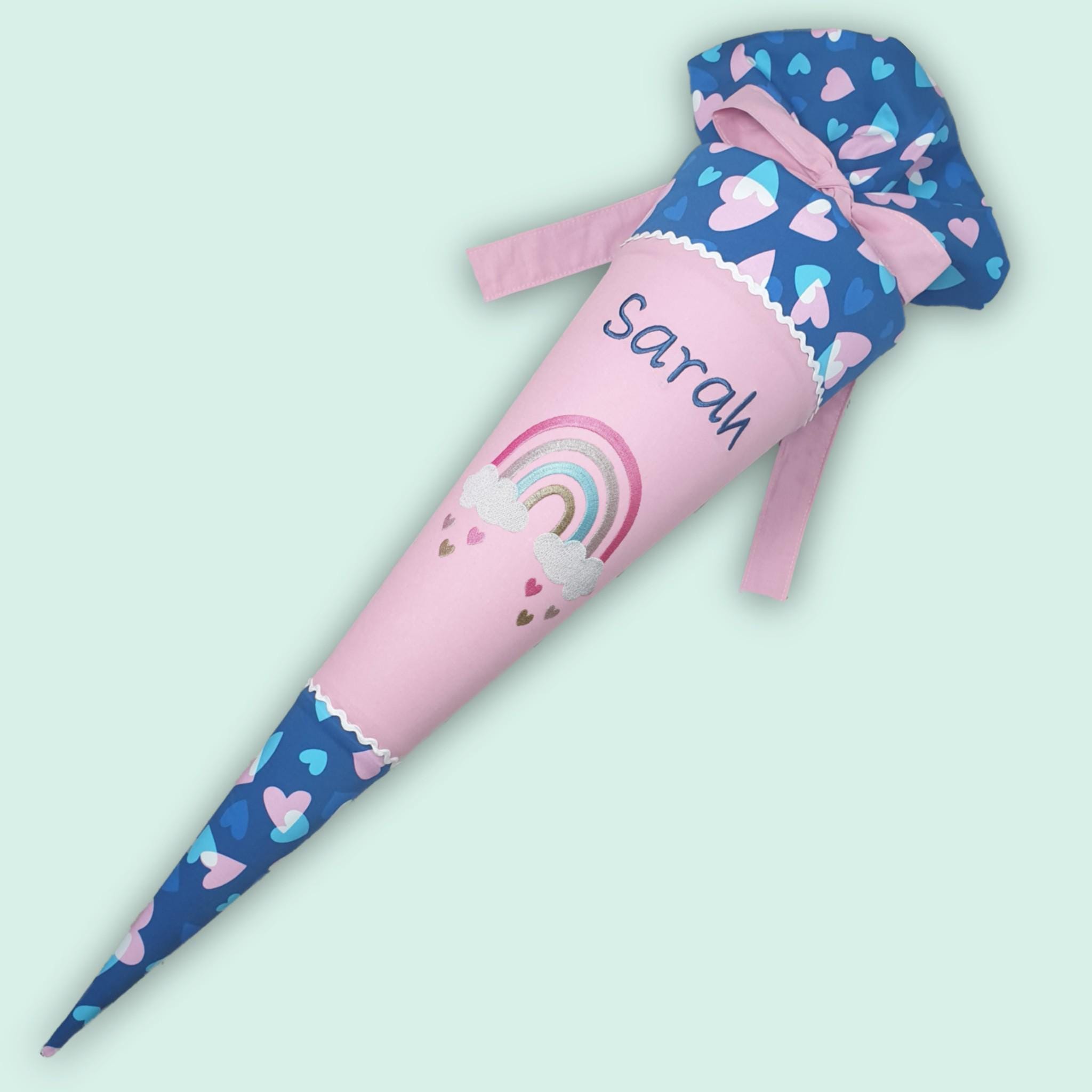 Schultüte mit Regenbogen und Namen farblich auf den Step by step Seashell Pearl Schulranzen abgestimmt.