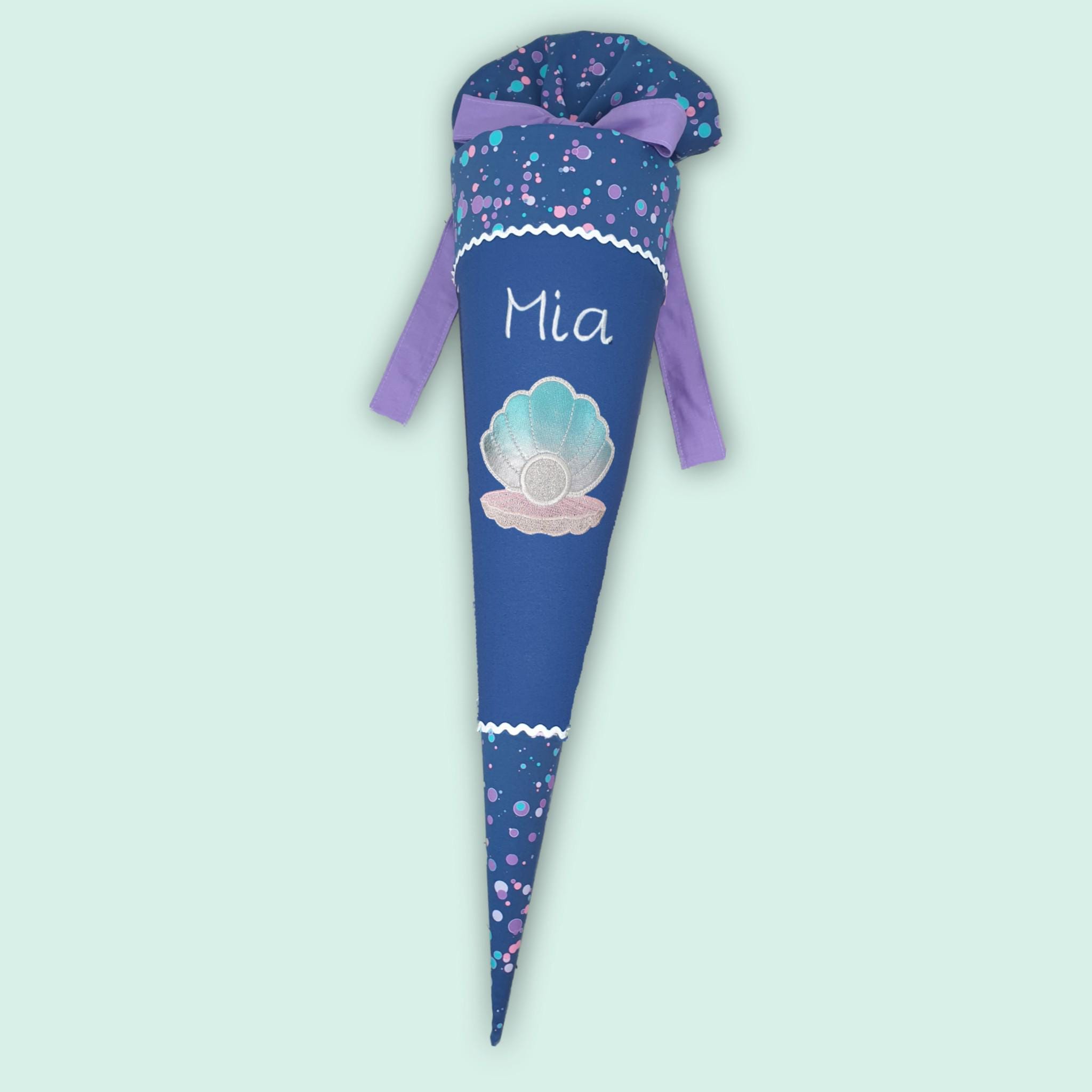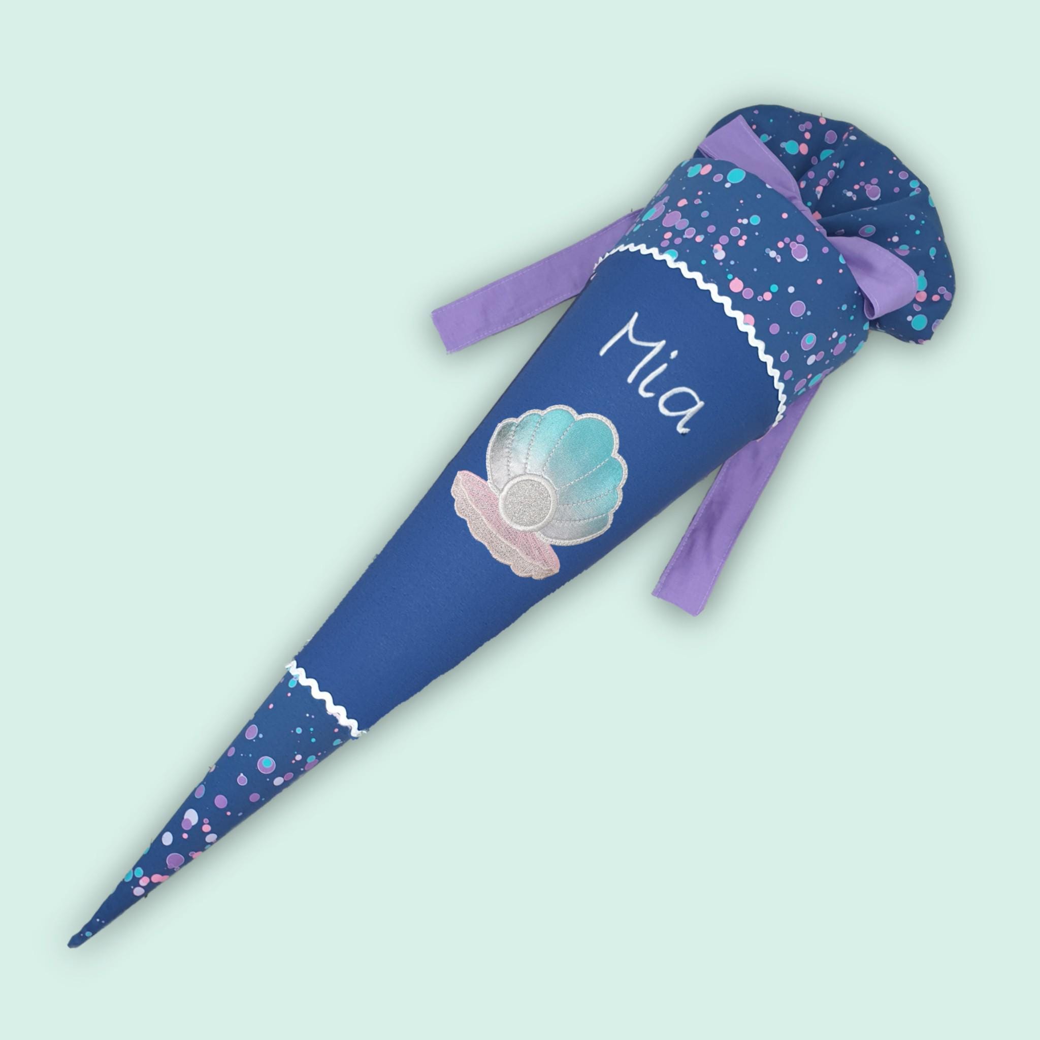 Schultüte mit Muschel und Namen farblich auf den DerDieDas Deep Ocean Schulranzen abgestimmt.