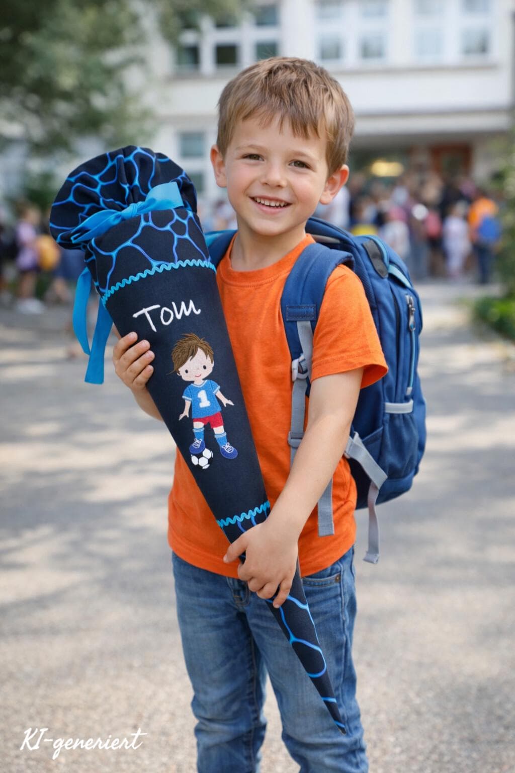 Jede Schultüte wird mit einem gestickten Motiv und dem Namen deines Kindes individuell gestaltet. Auf Wunsch fügen wir auch das Datum des ersten Schultages hinzu.