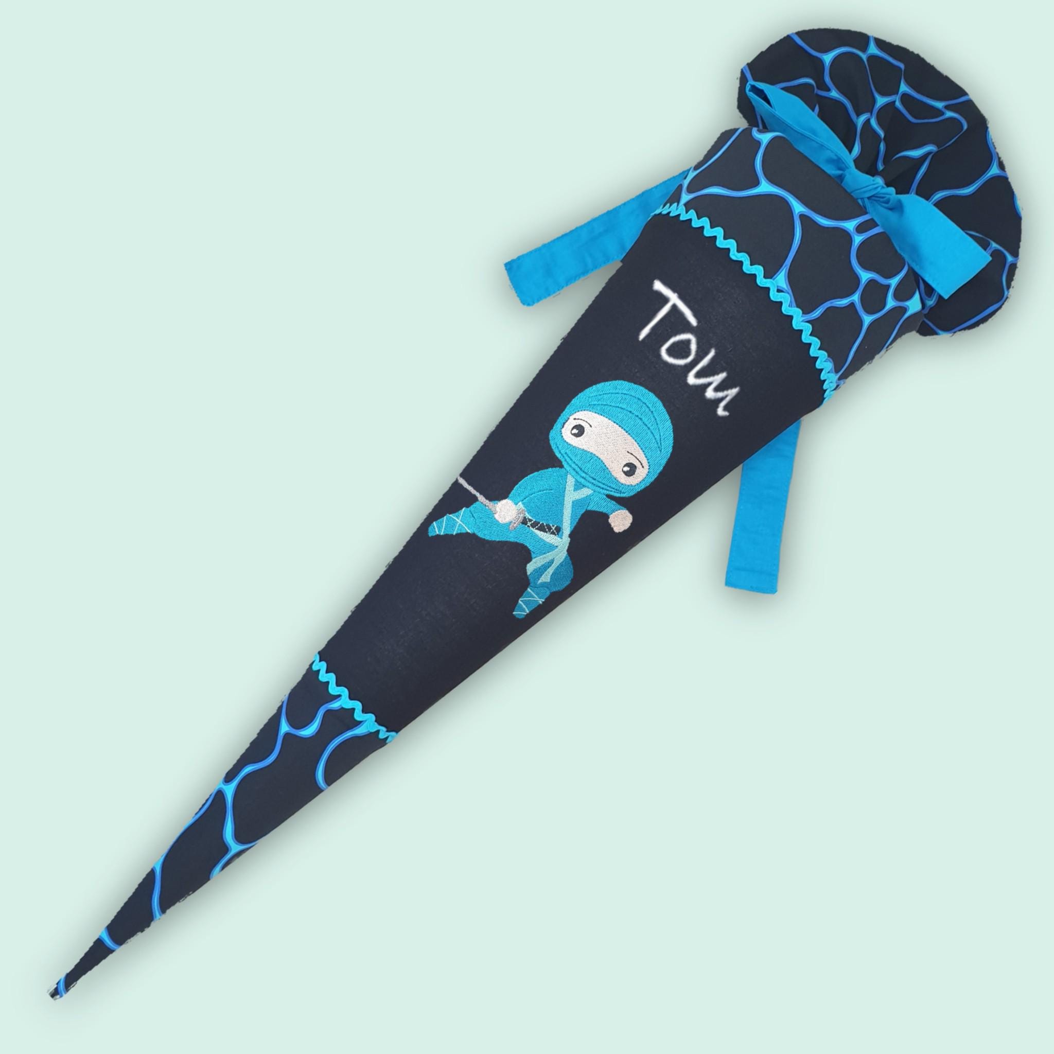 Schultüte mit Ninja und Namen farblich auf den Bärassic Garden Schulranzen abgestimmt.