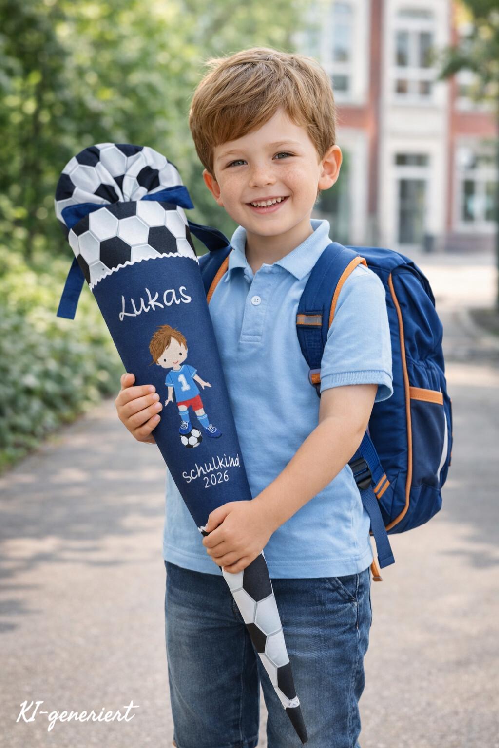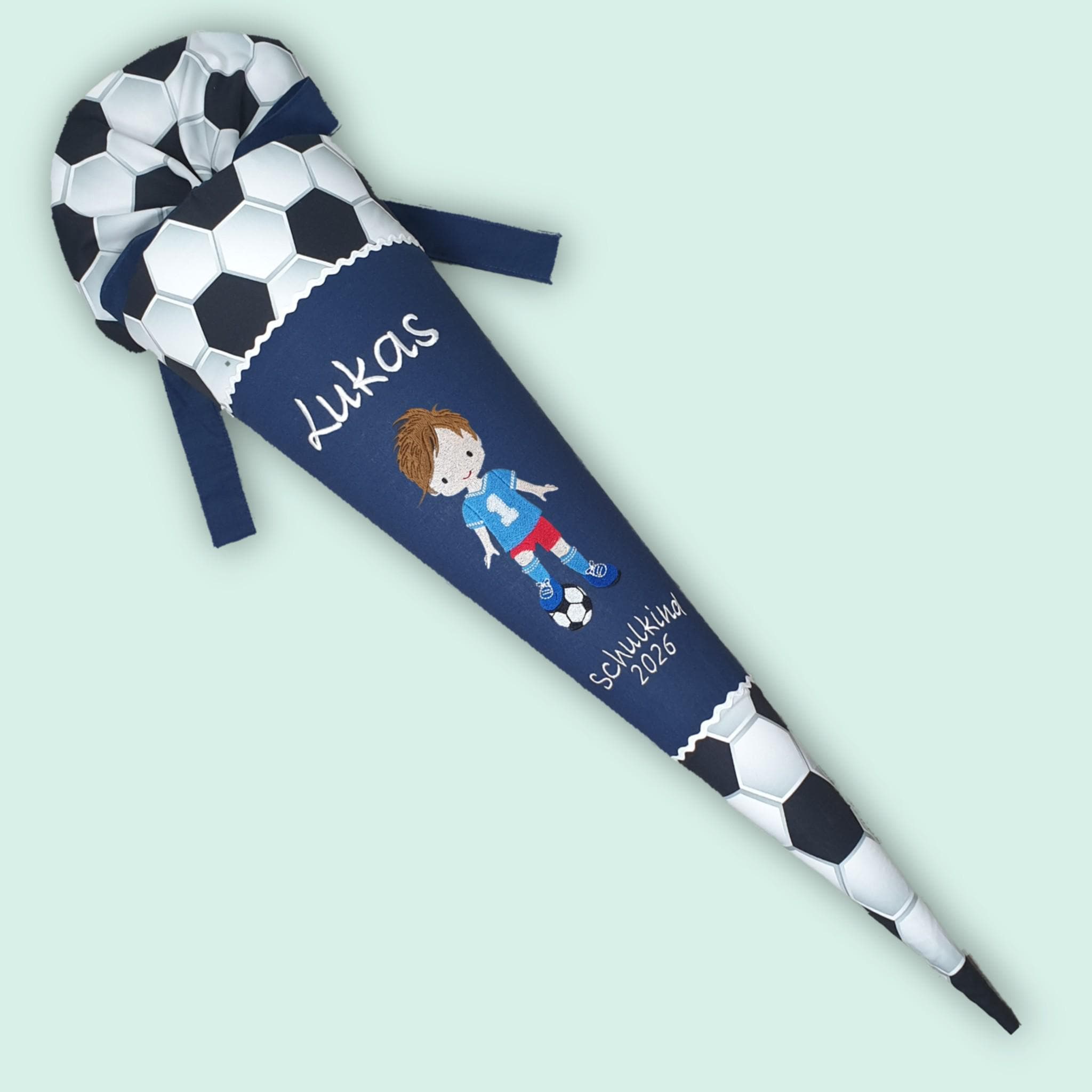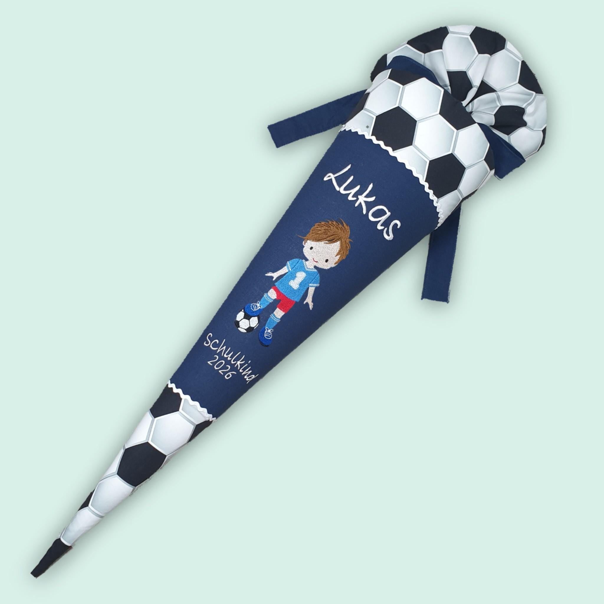 Schultüte mit Fussballer und Namen in der Farbe Dunkelblau.