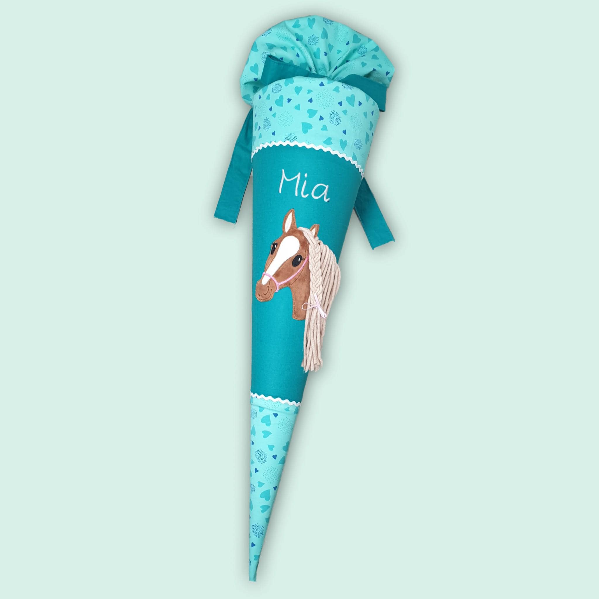 70 cm Schultüte oder 85 cm Schultüte mit Pferd und Namen farblich auf den Reitbärtraum Schulranzen abgestimmt.