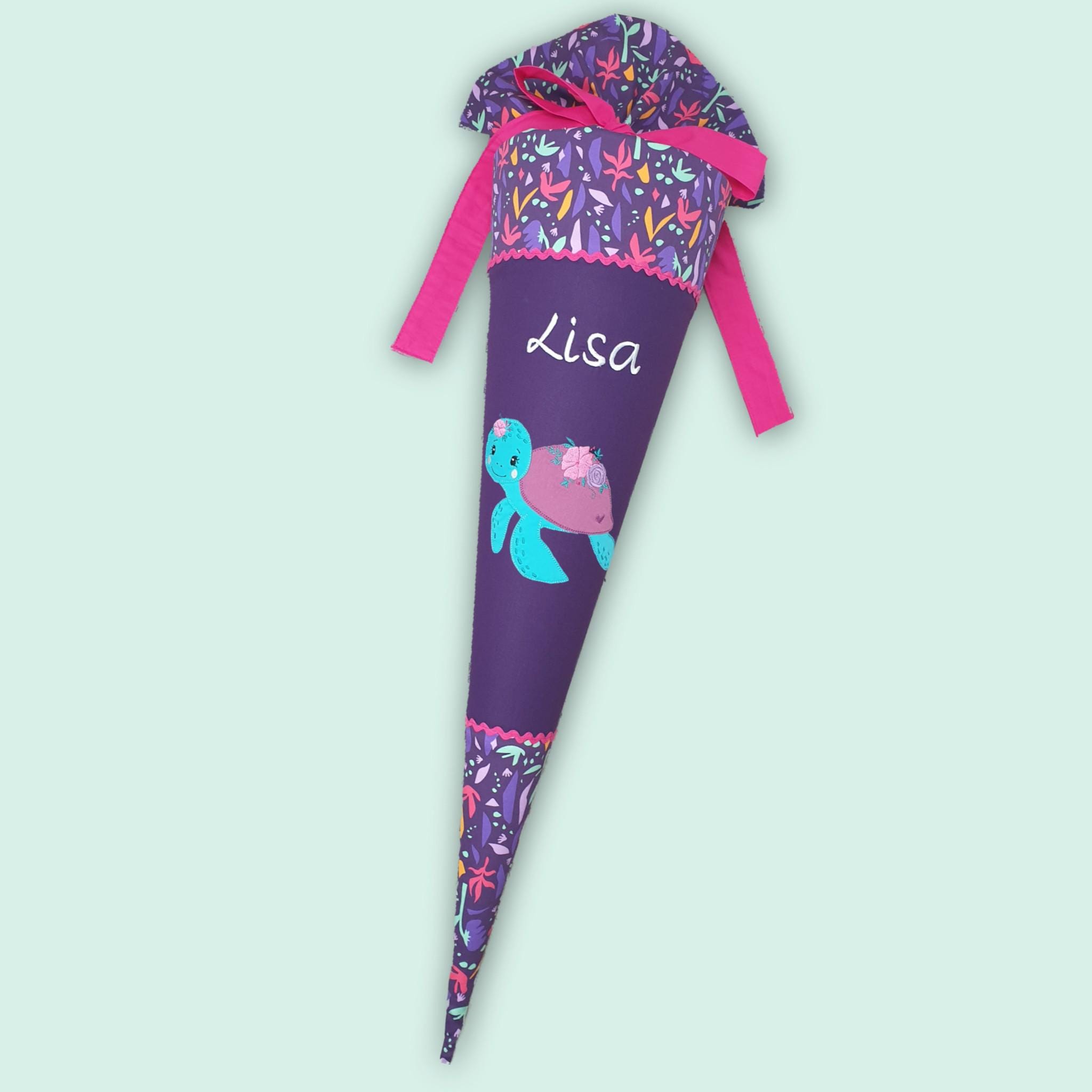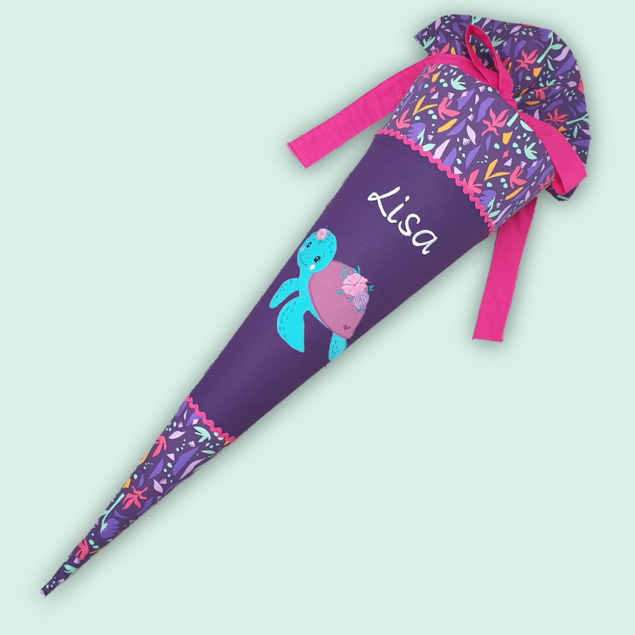 Schultüte mit Schildkröte und Namen farblich auf den Ambärzonas Schulranzen abgestimmt.