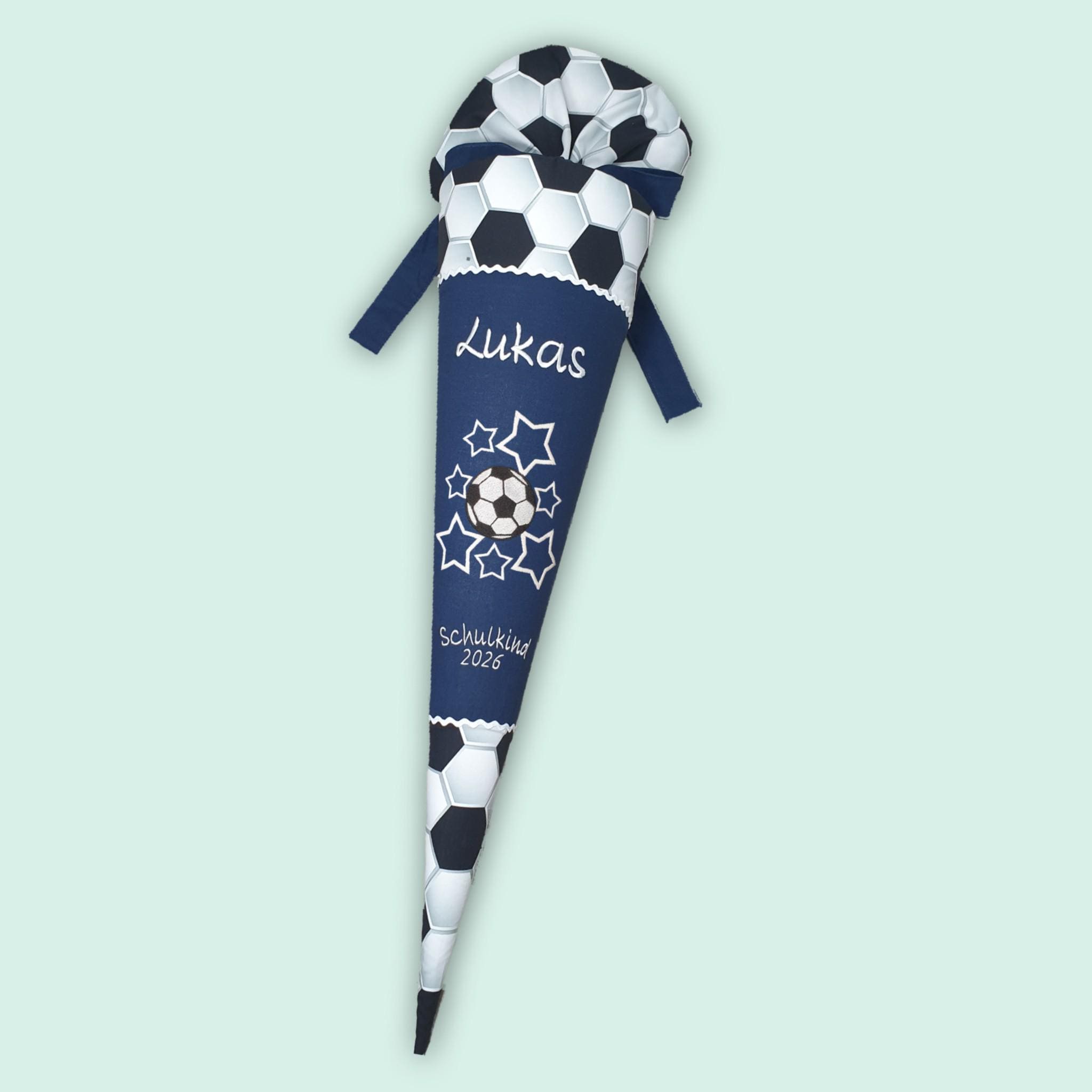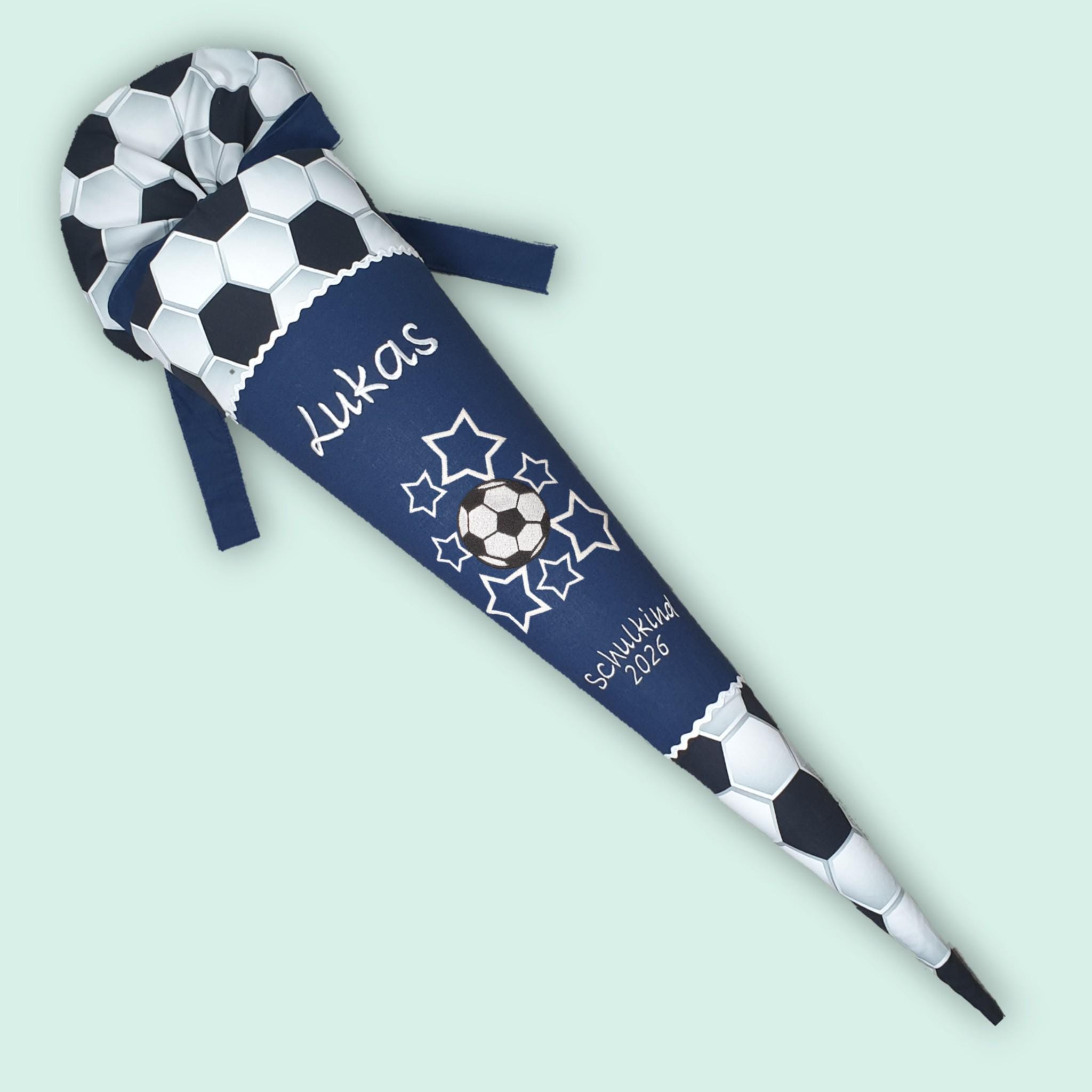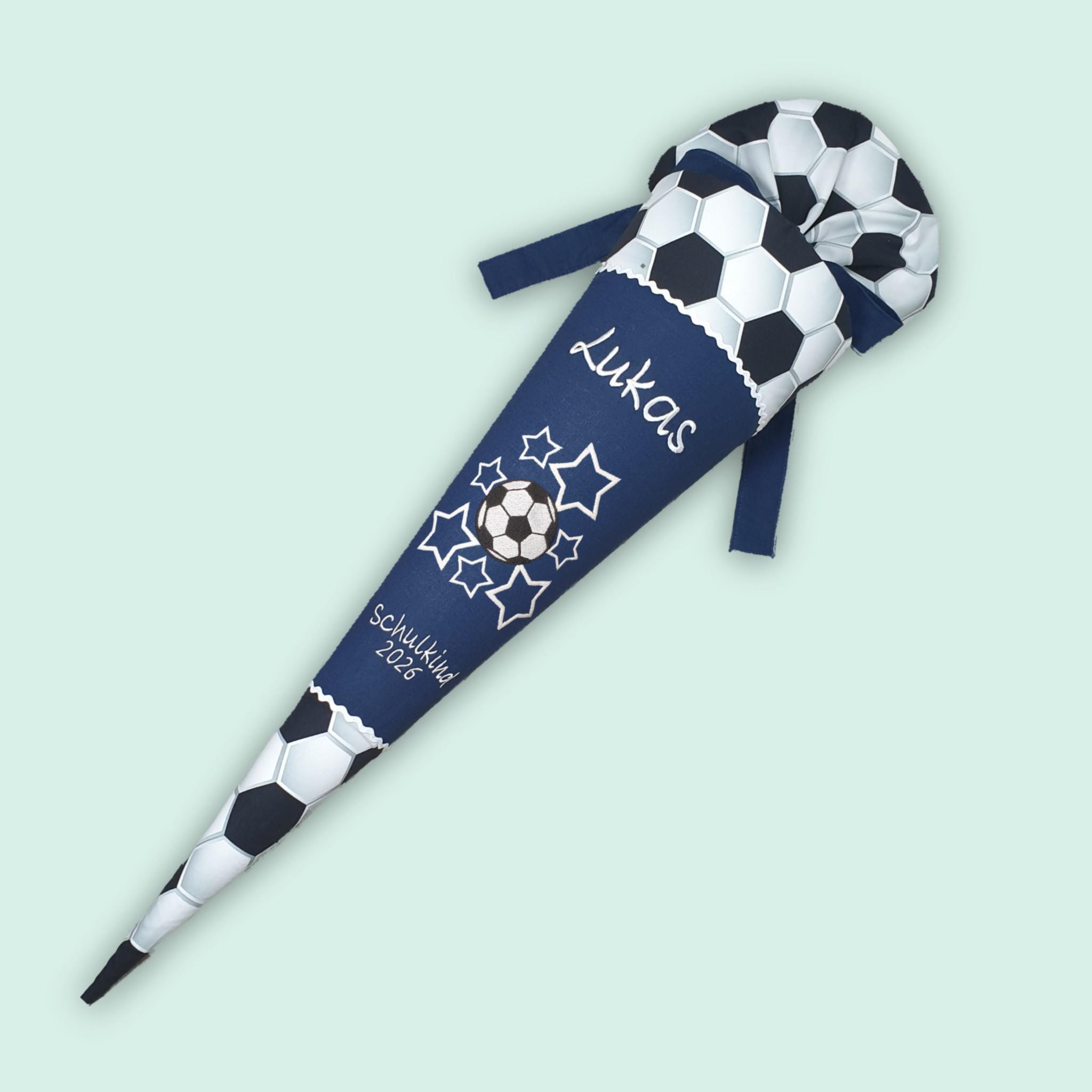 Schultüte mit Fussball und Namen in der Farbe Dunkelblau.