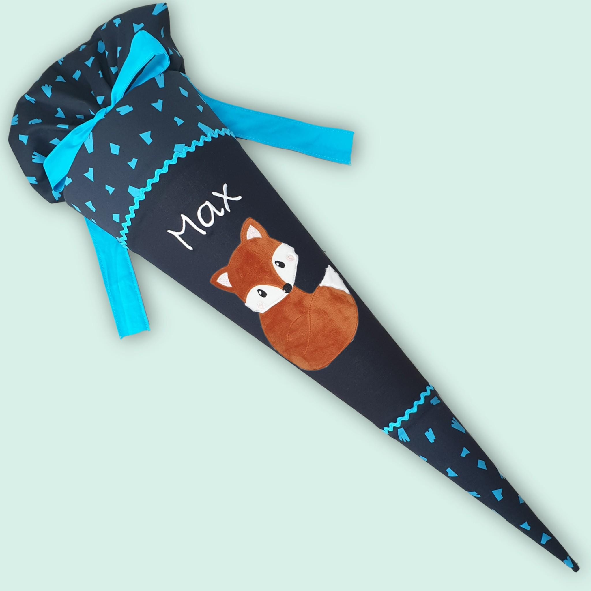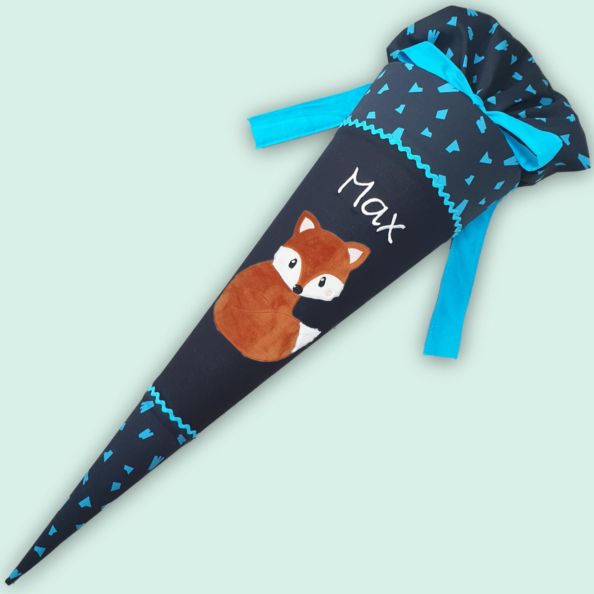 Schultüte mit Fuchs und Namen farblich auf den Verfolgbärjagd Schulranzen abgestimmt.
