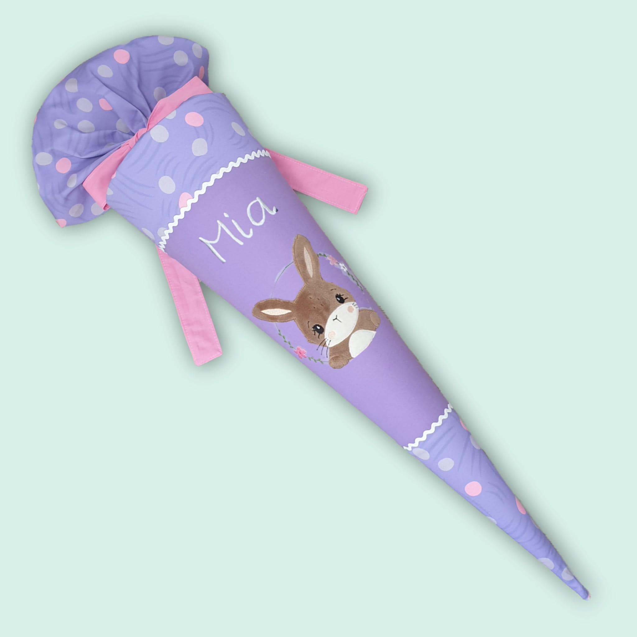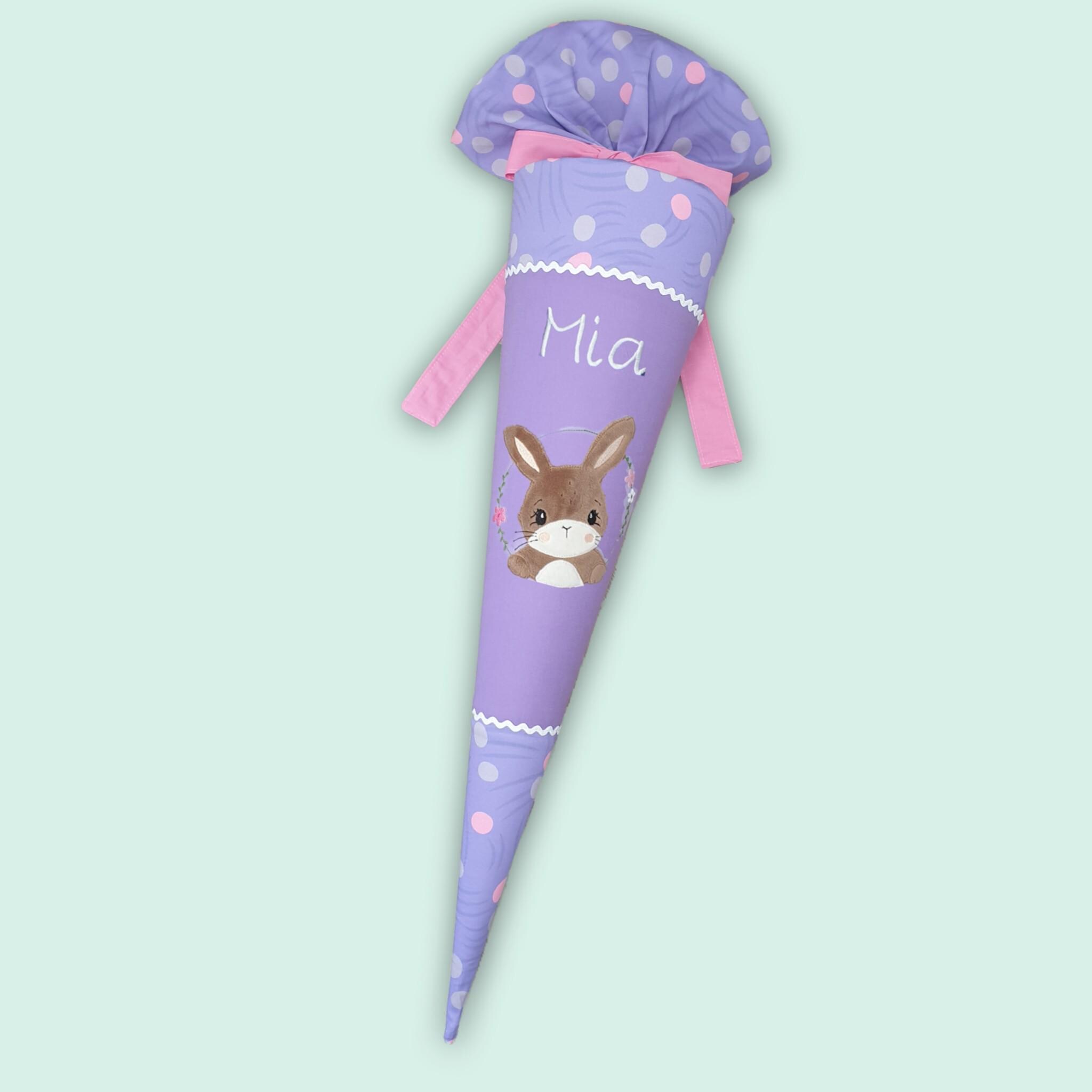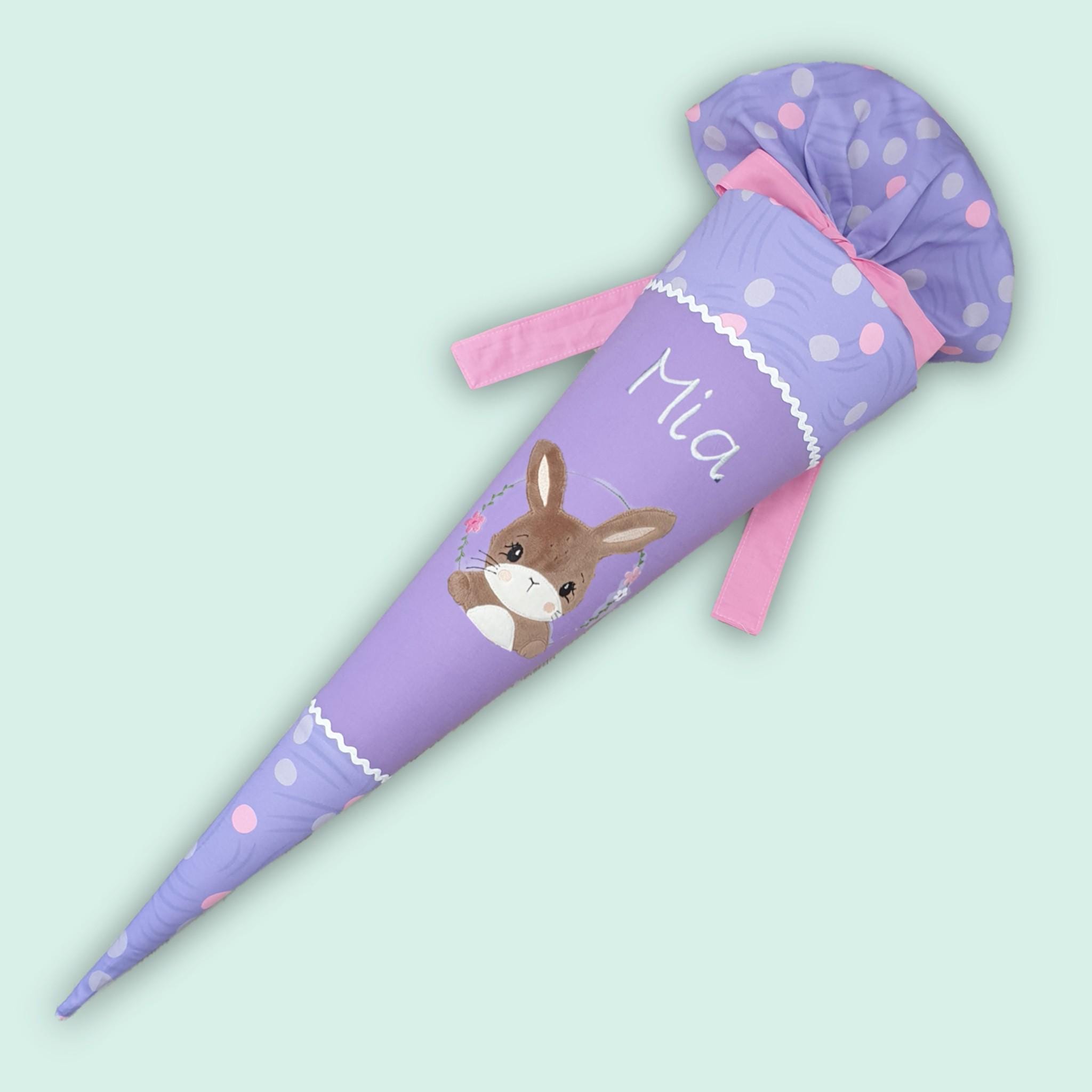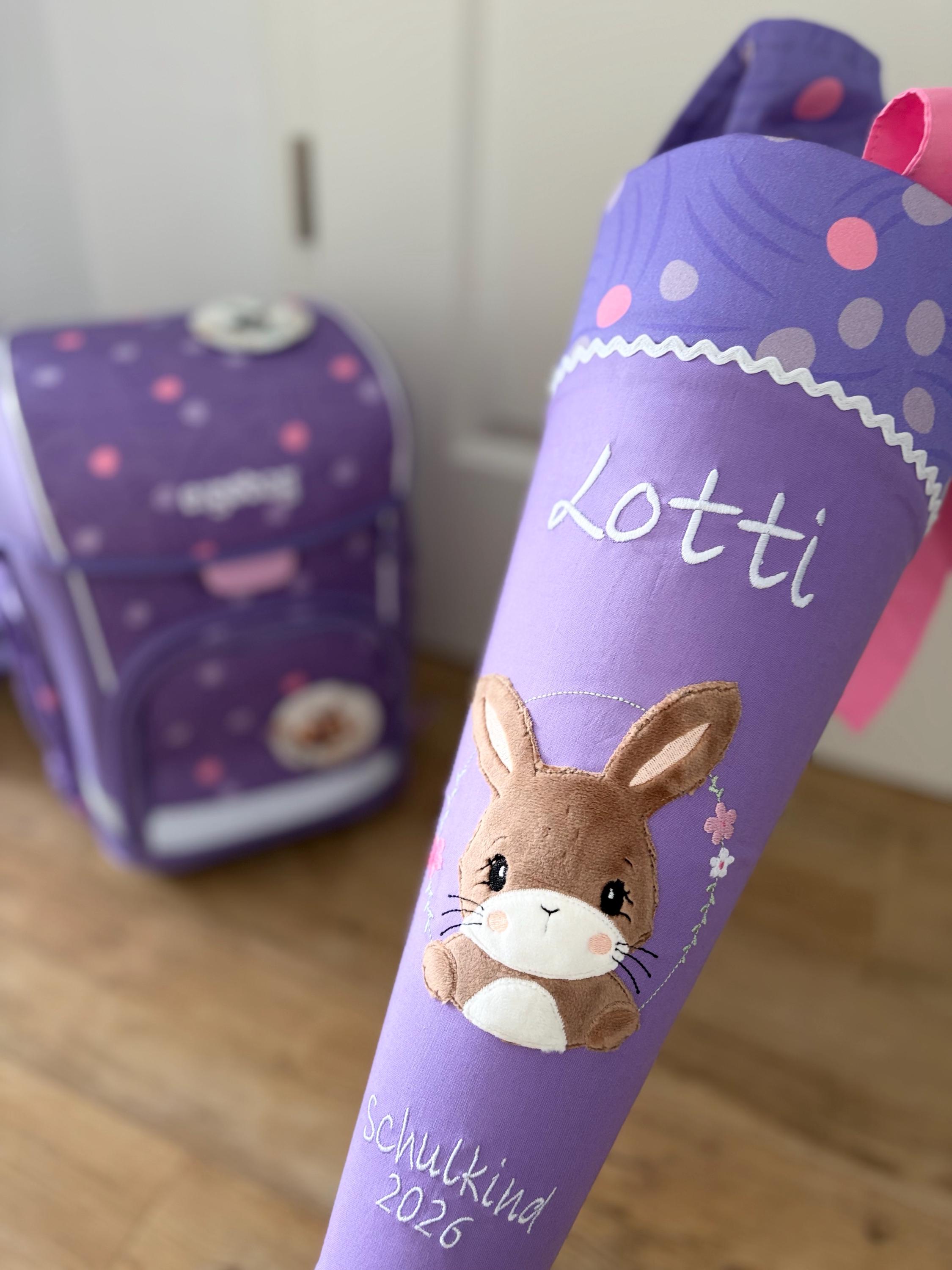 70 cm Schultüte oder 85 cm Schultüte mit Hase und Namen farblich auf den Ponybäradies Schulranzen abgestimmt.