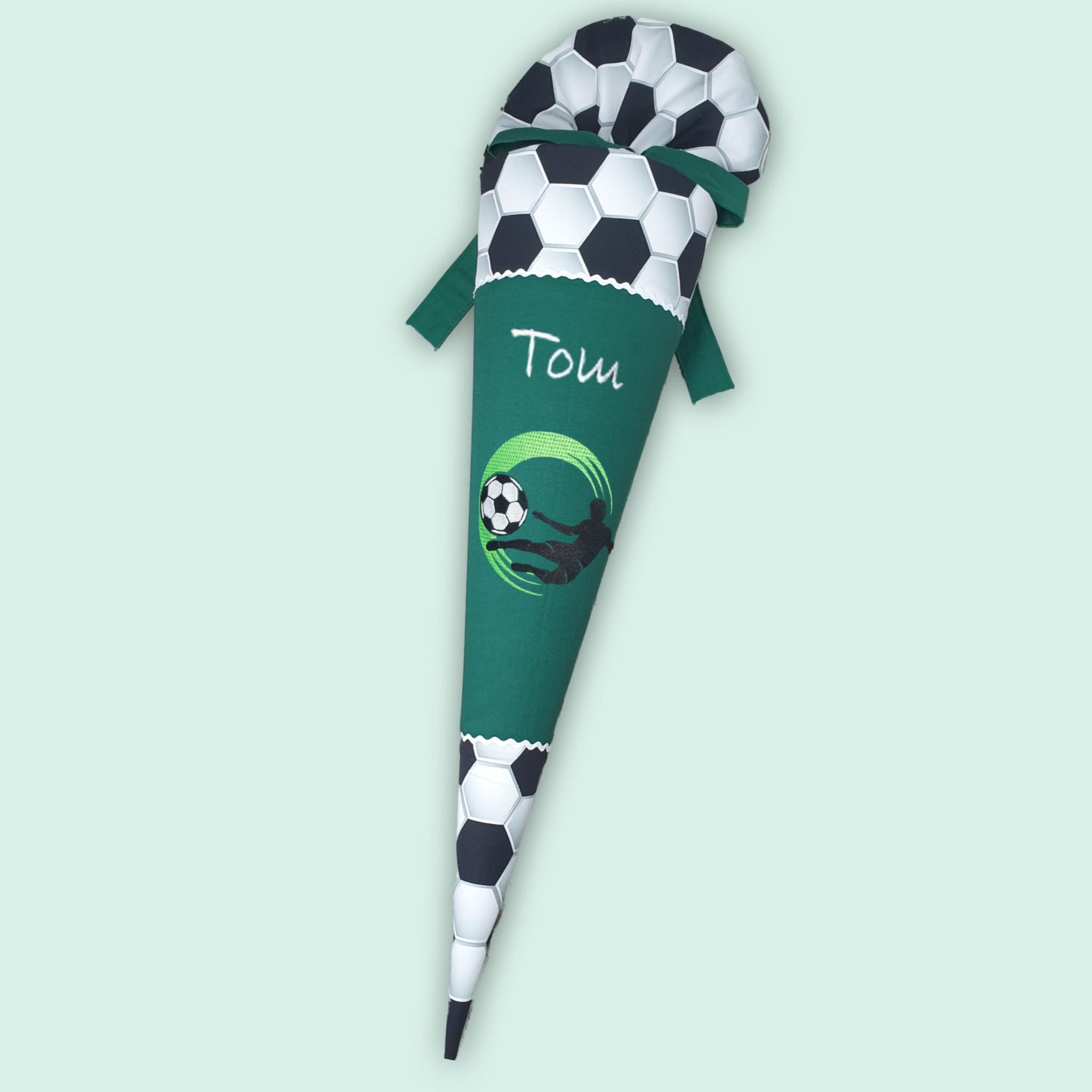 Schultüte mit Fussball und Namen in der Farbe Dunkelgrün.