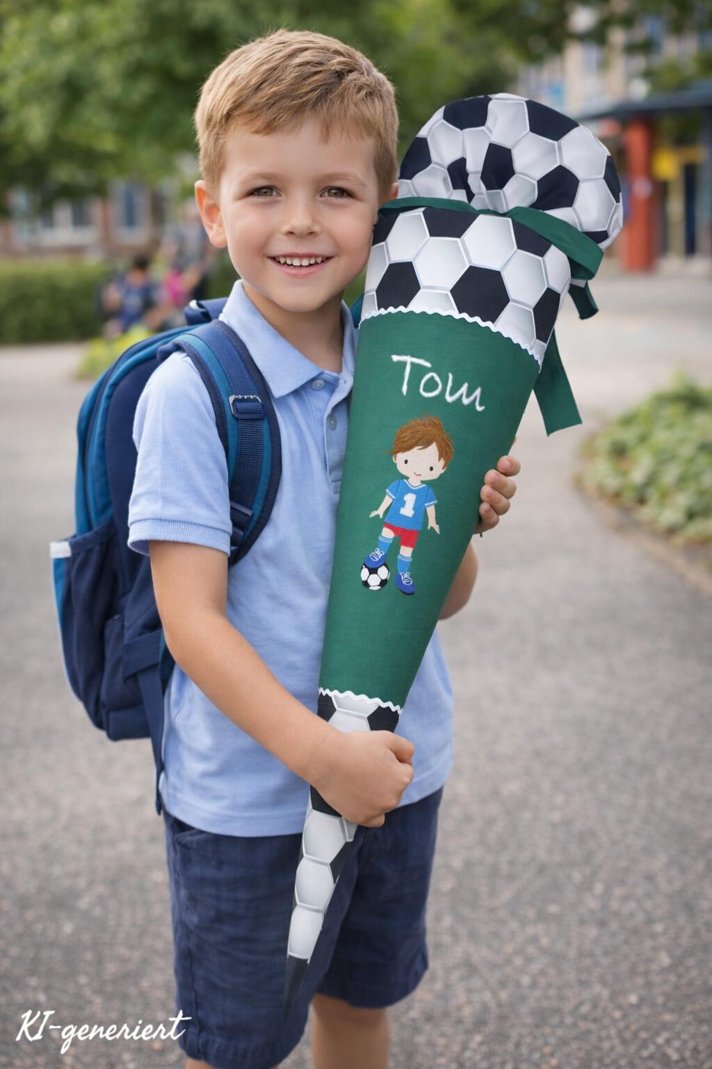 Schultüte mit Fussball und Namen in der Farbe Dunkelgrün.