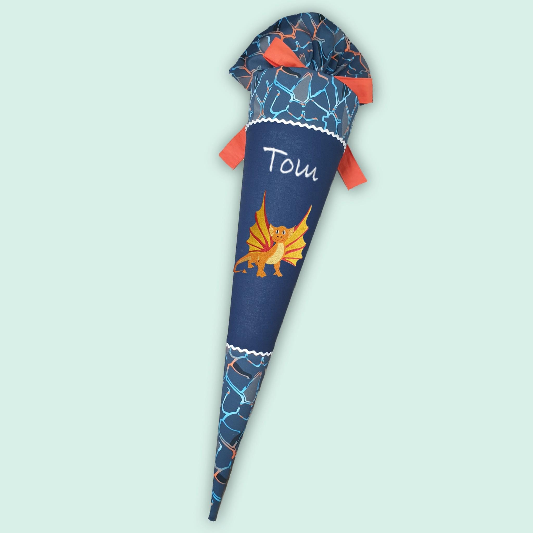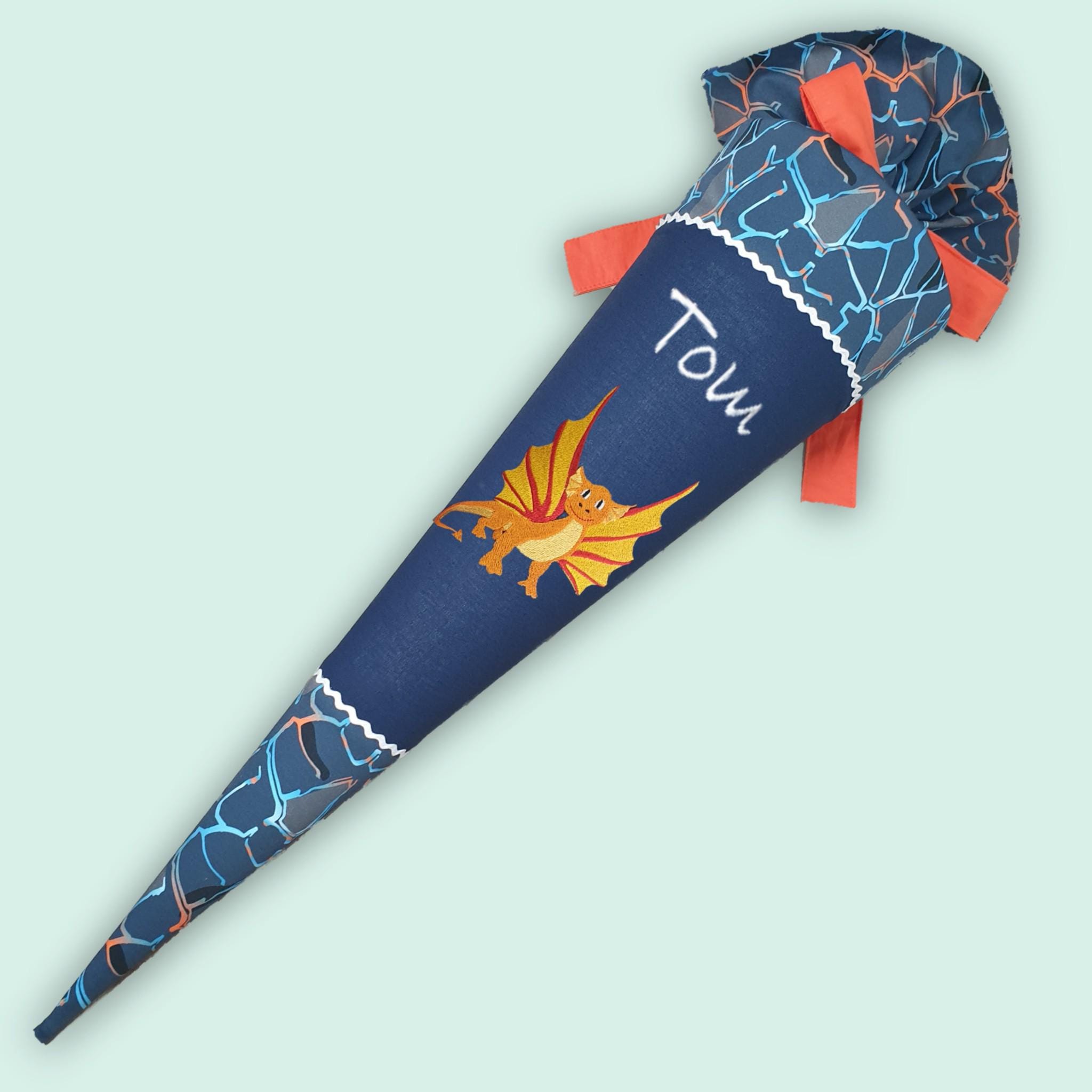 Schultüte mit Drachen und Namen farblich auf den Eldrador Lava Dragon Schulranzen abgestimmt.