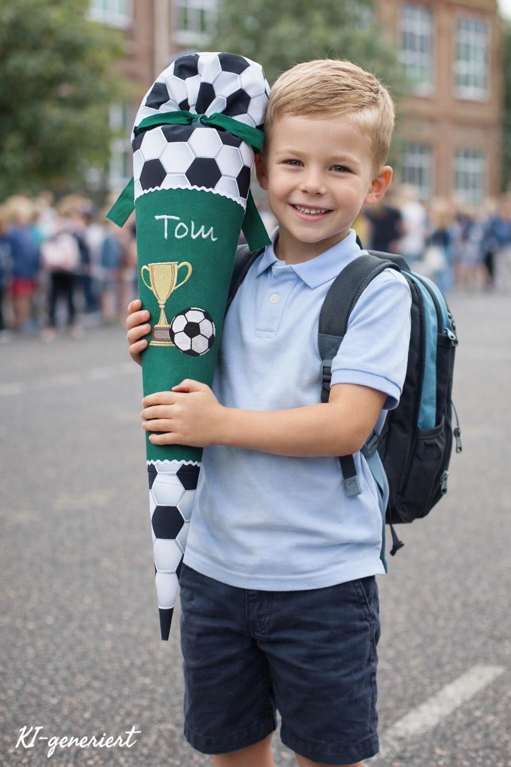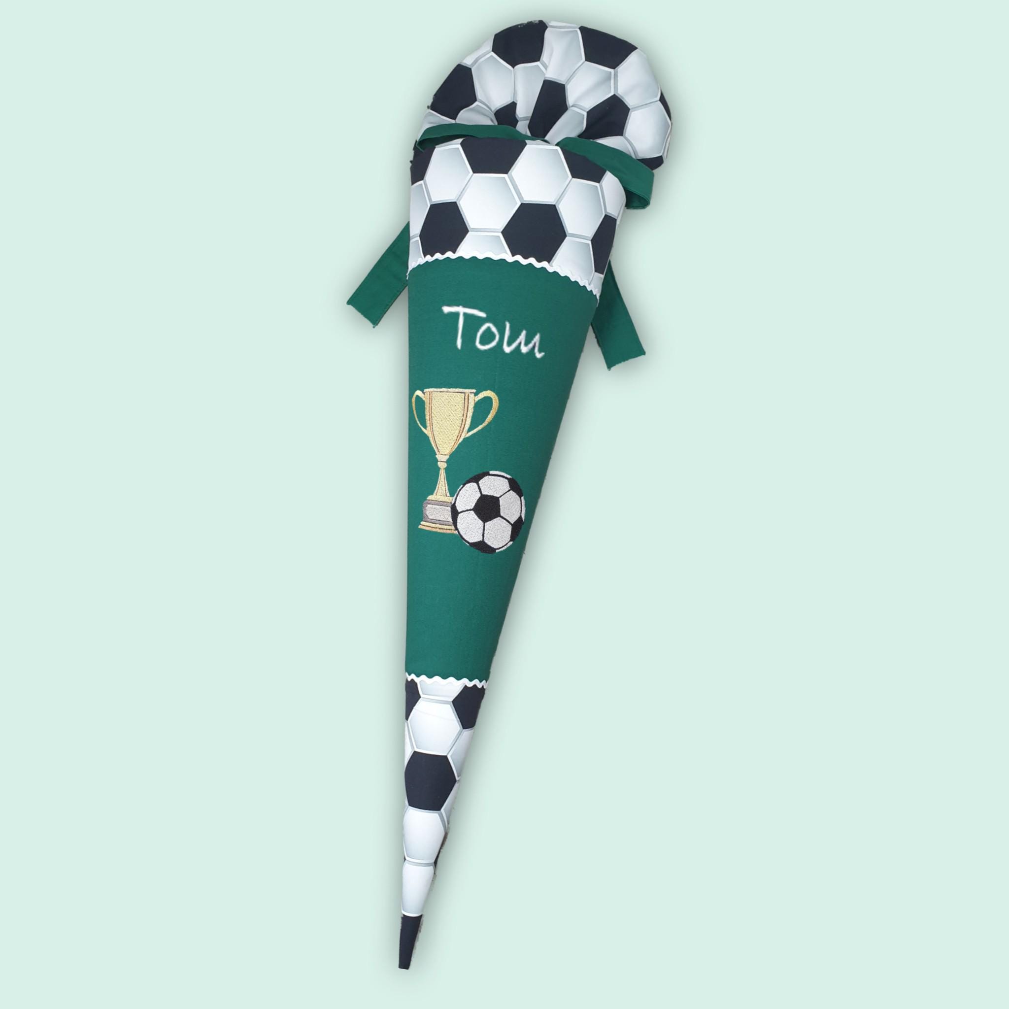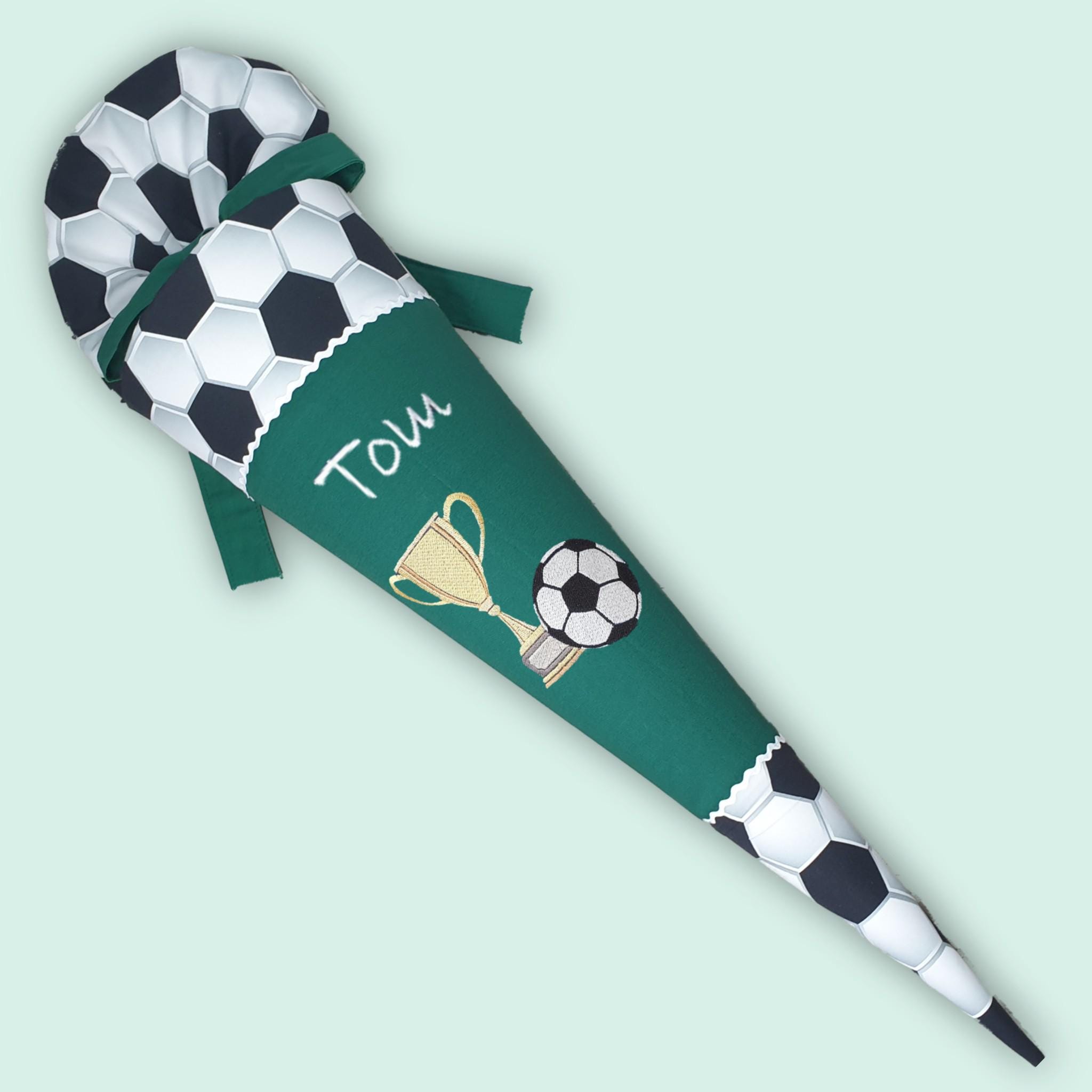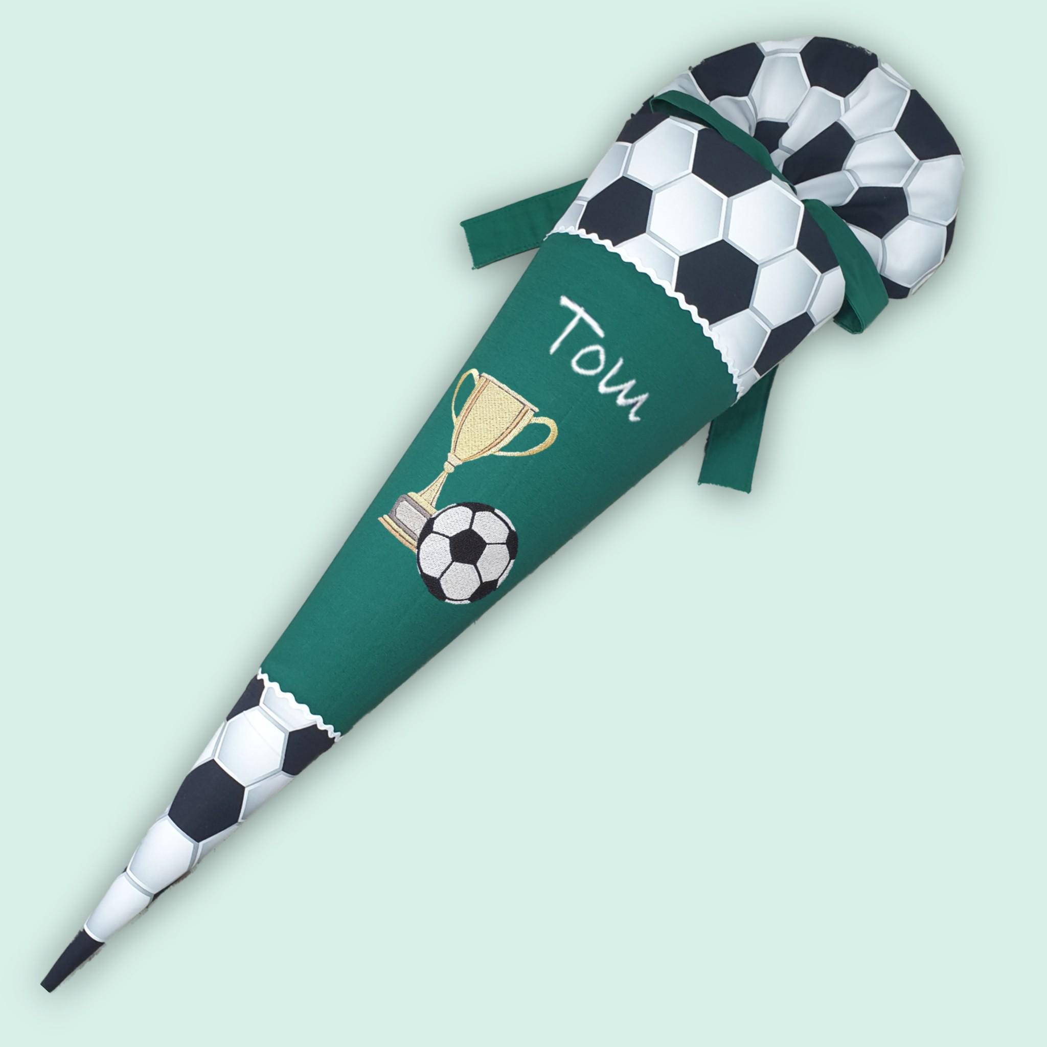 Schultüte mit Fussball Pokal und Namen in der Farbe Dunkelgrün