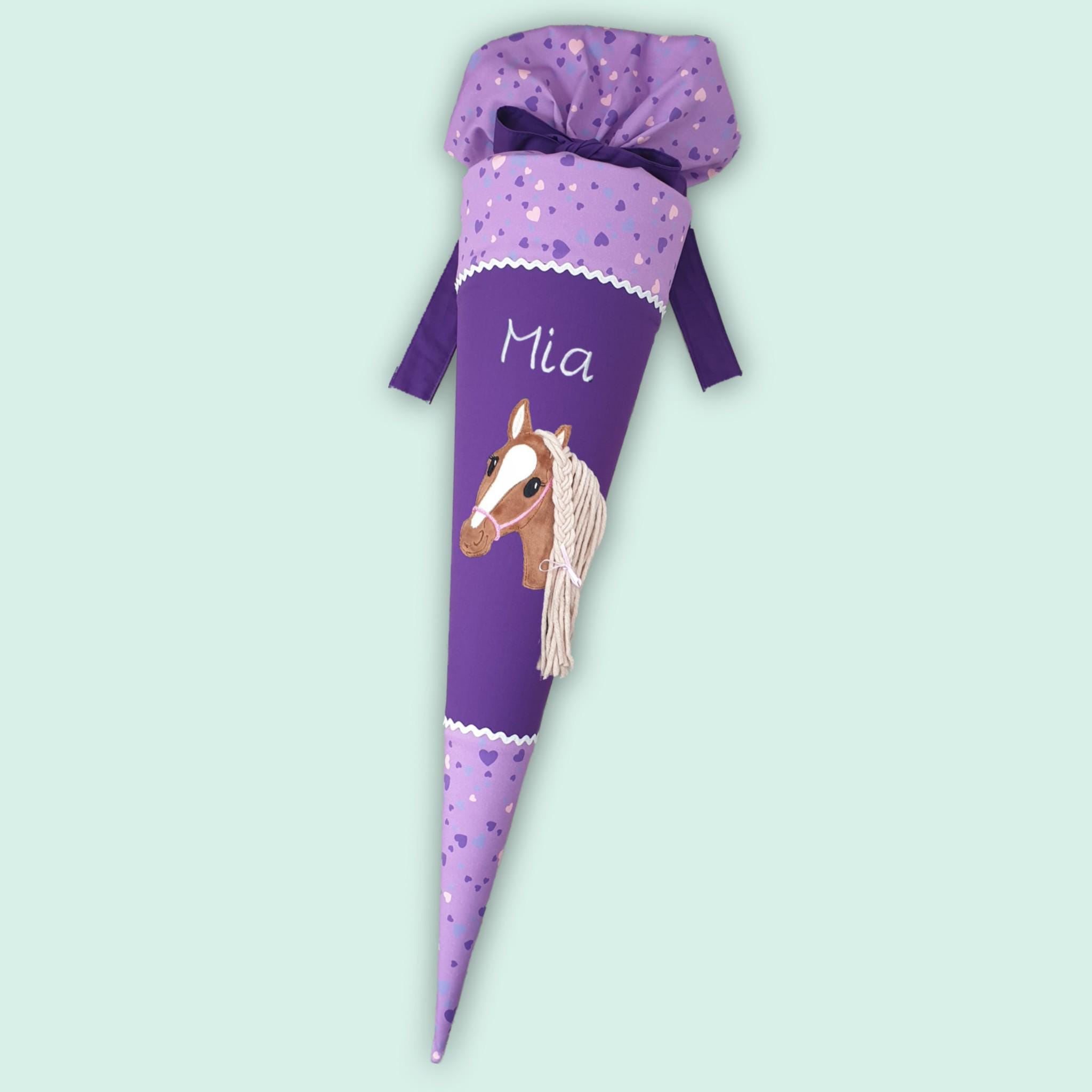 Schultüte mit Pferd und Namen farblich auf den Step by step Horse Club abgestimmt.