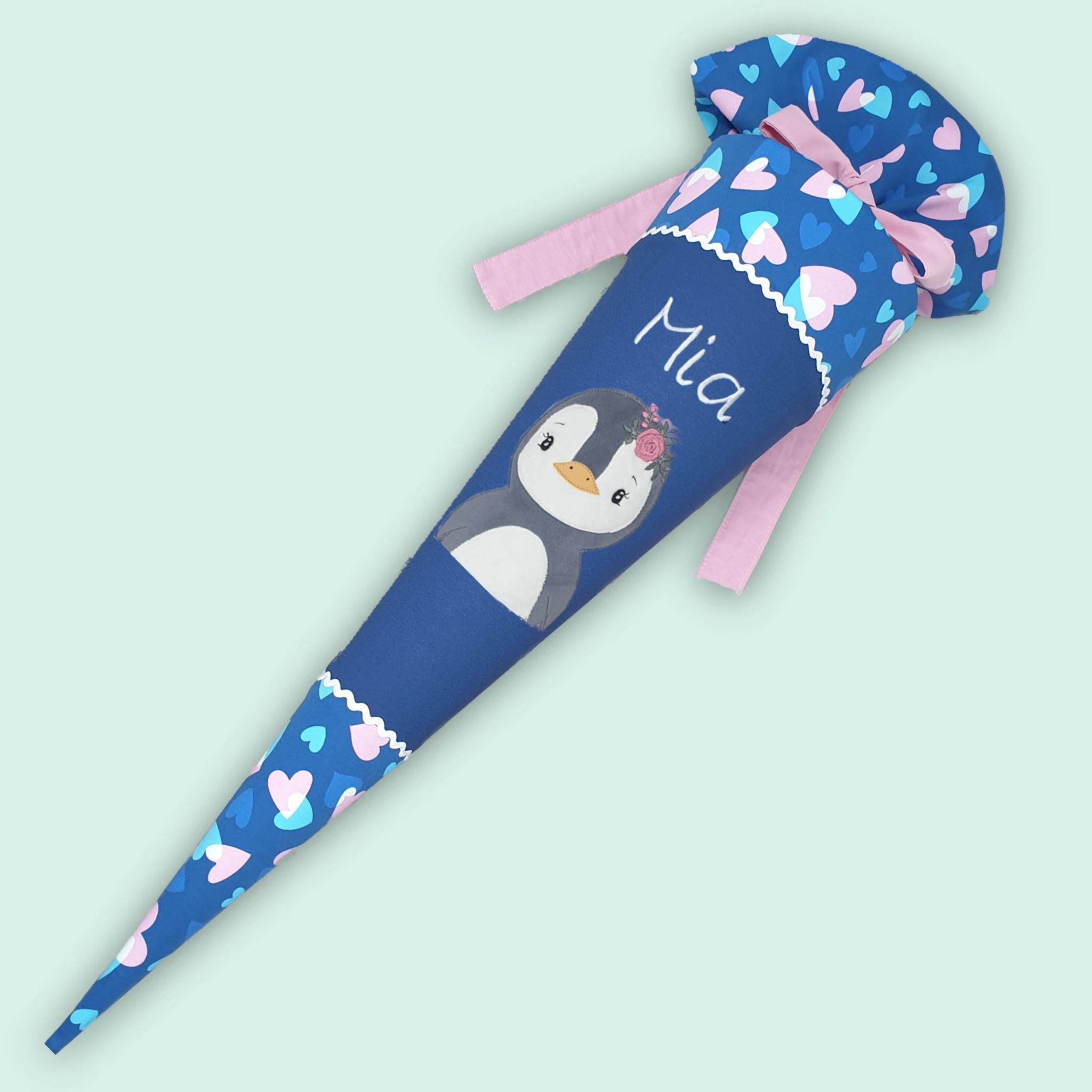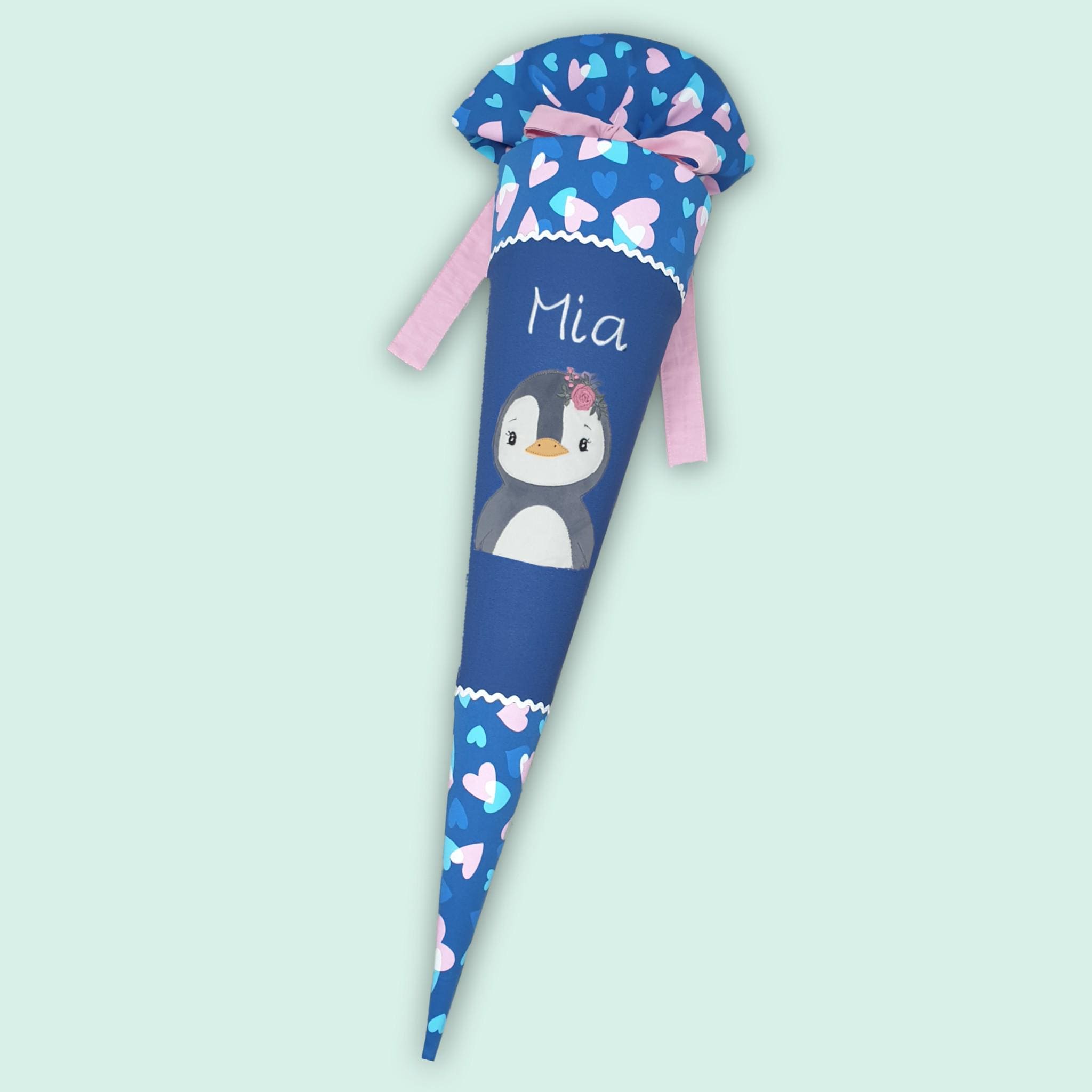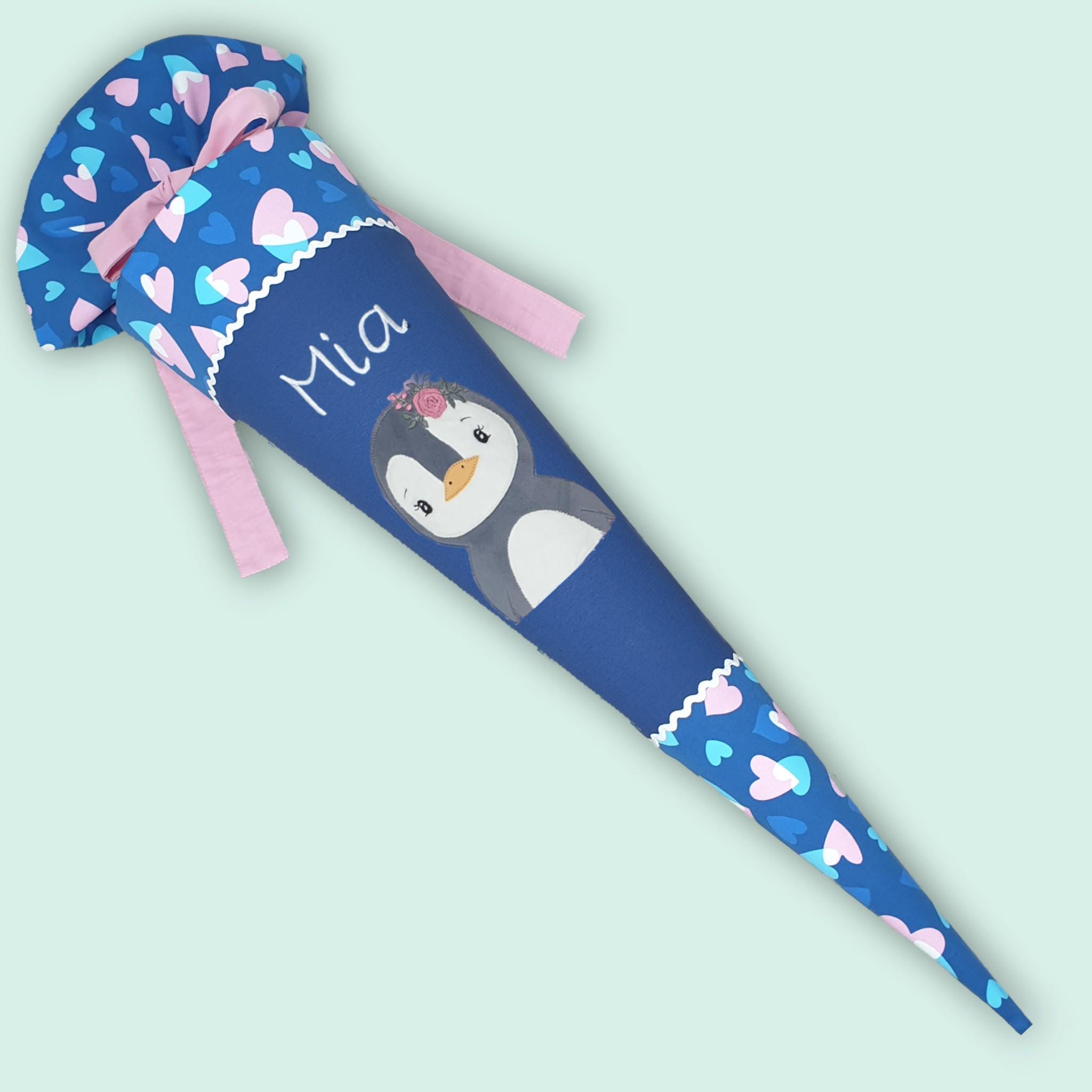 Schultüte mit Pinguin und Namen farblich auf den Step by step Seashell Pearl Schulranzen abgestimmt.