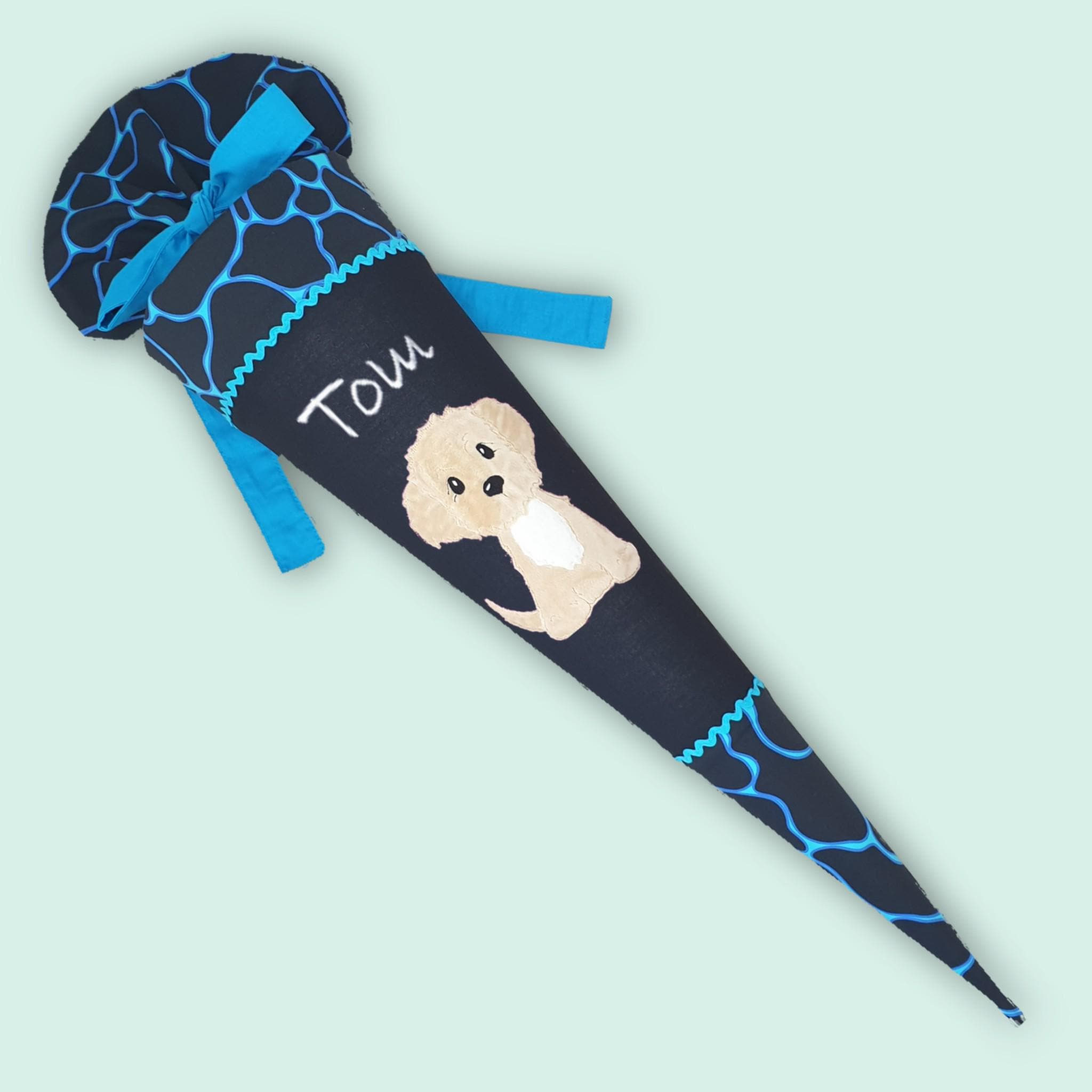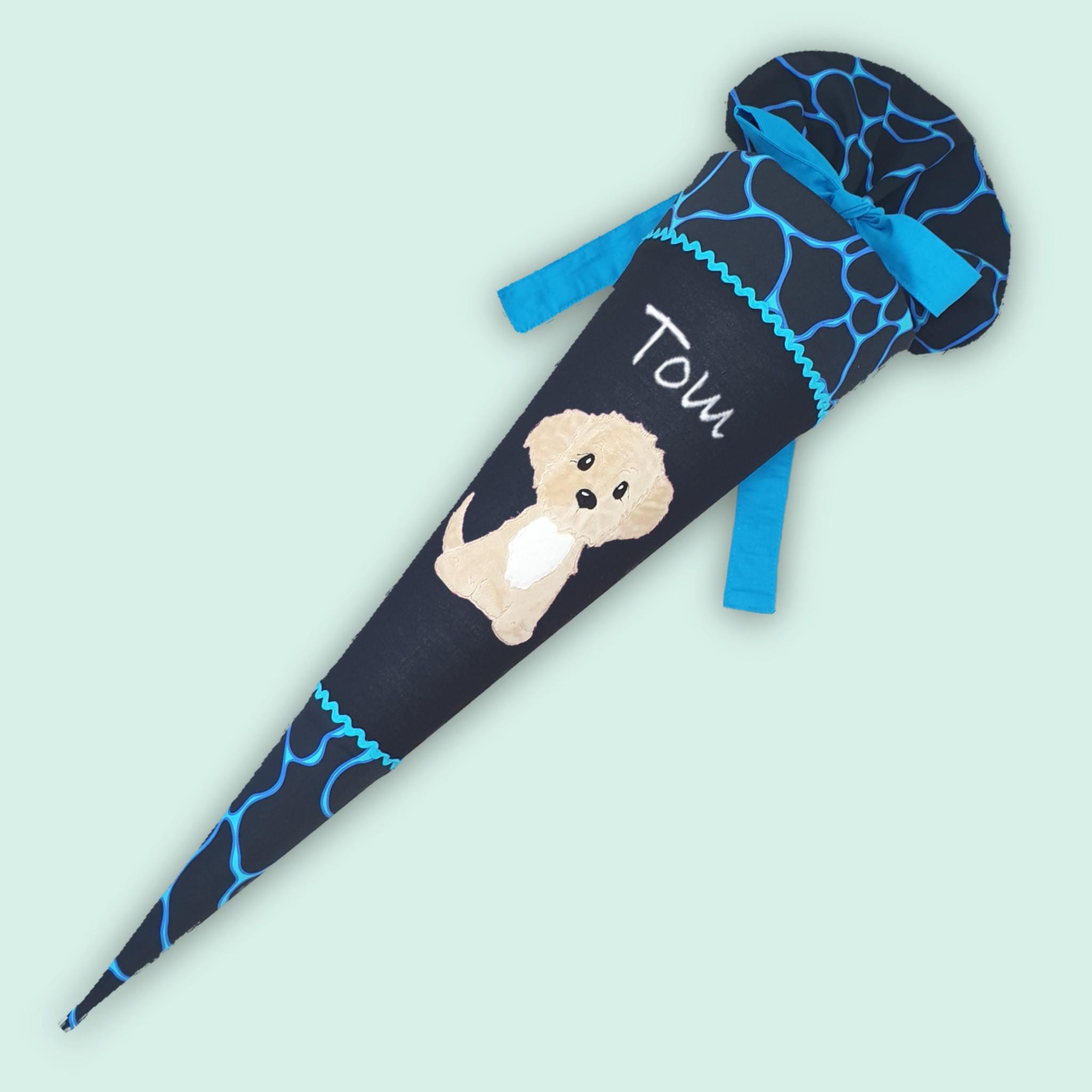 Schultüte mit Hund und Namen farblich auf den Bärassic Garden Schulranzen abgestimmt.