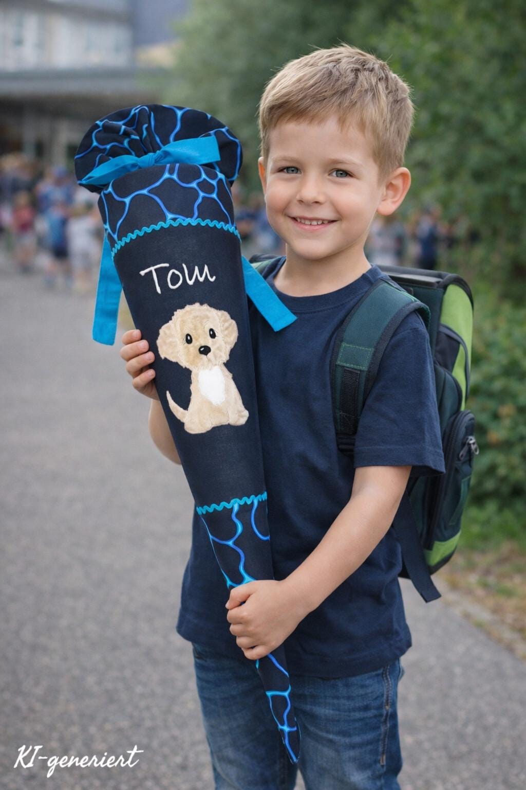 Jede Schultüte wird mit einem gestickten Motiv und dem Namen deines Kindes individuell gestaltet. Auf Wunsch fügen wir auch das Datum des ersten Schultages hinzu.