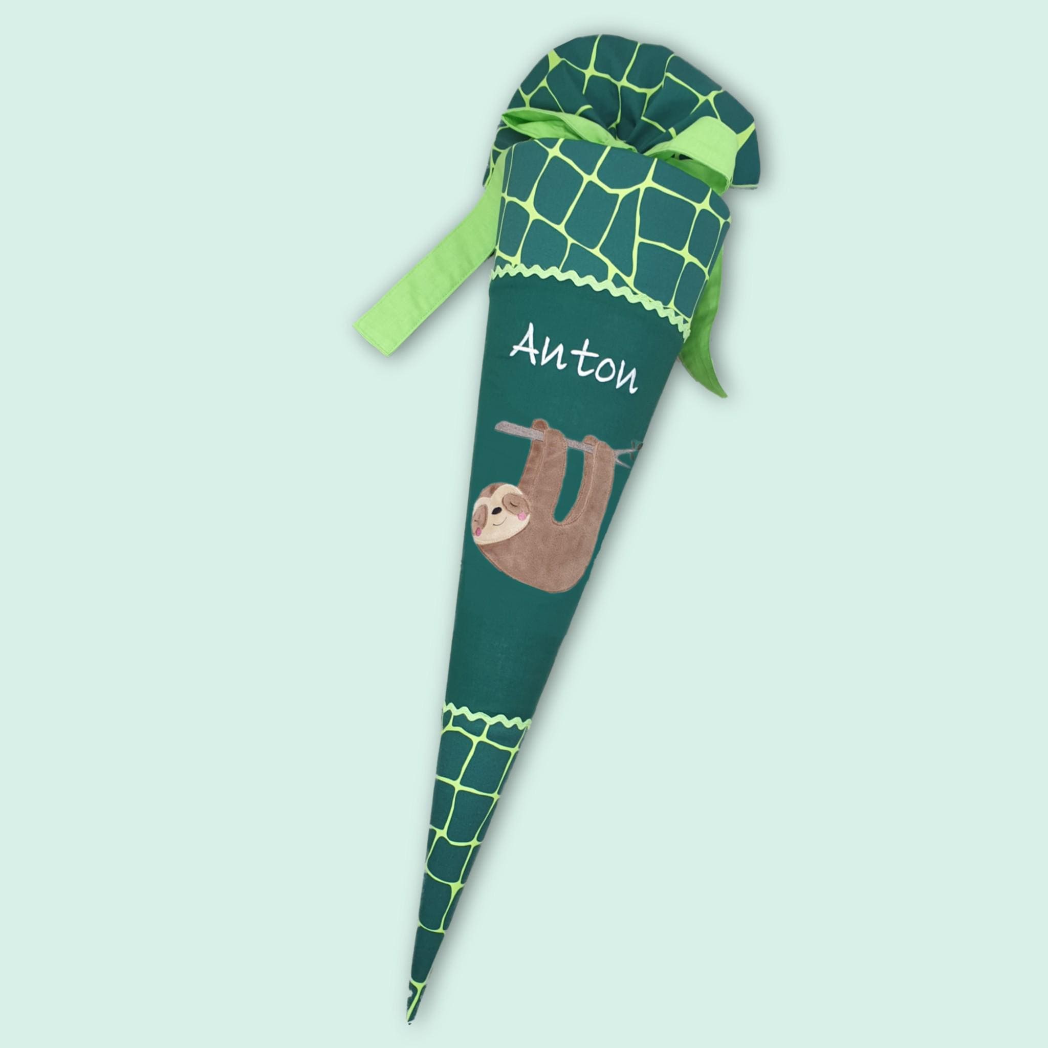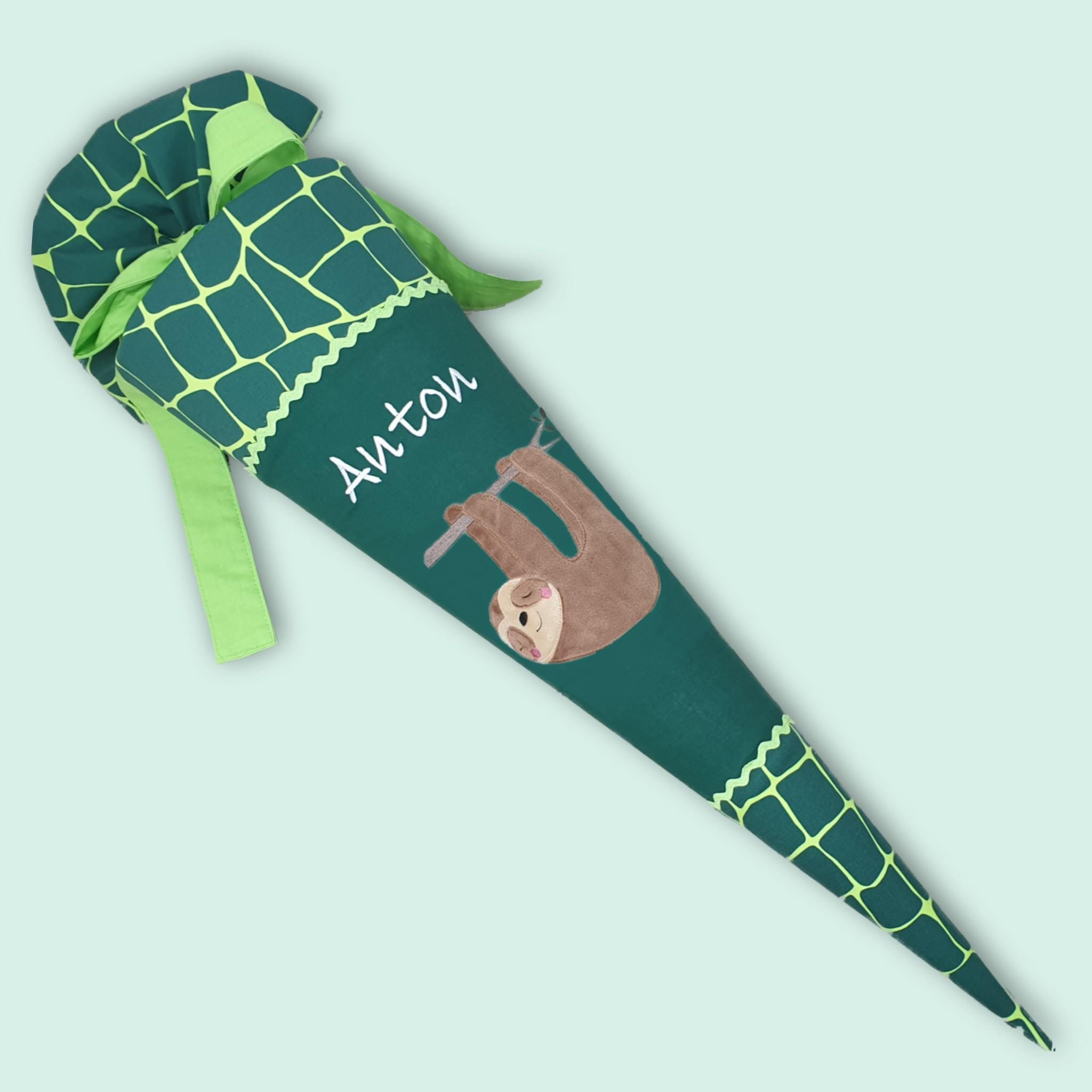 Schultüte mit Faultier und Namen farblich auf den Ergobag BärRex Schulranzen abgestimmt.