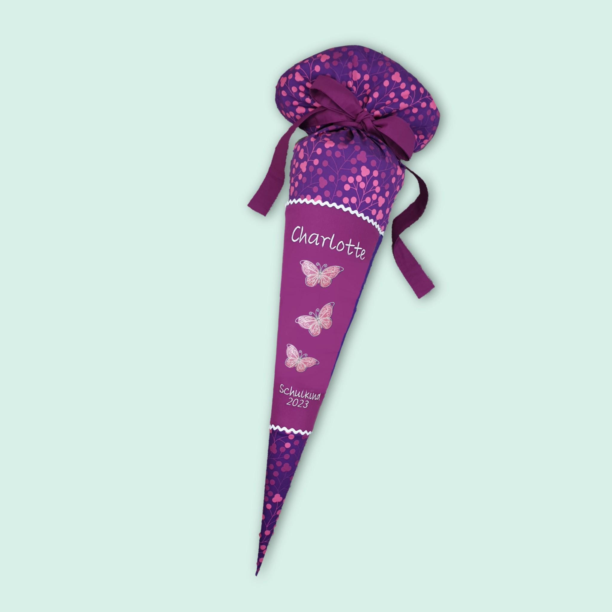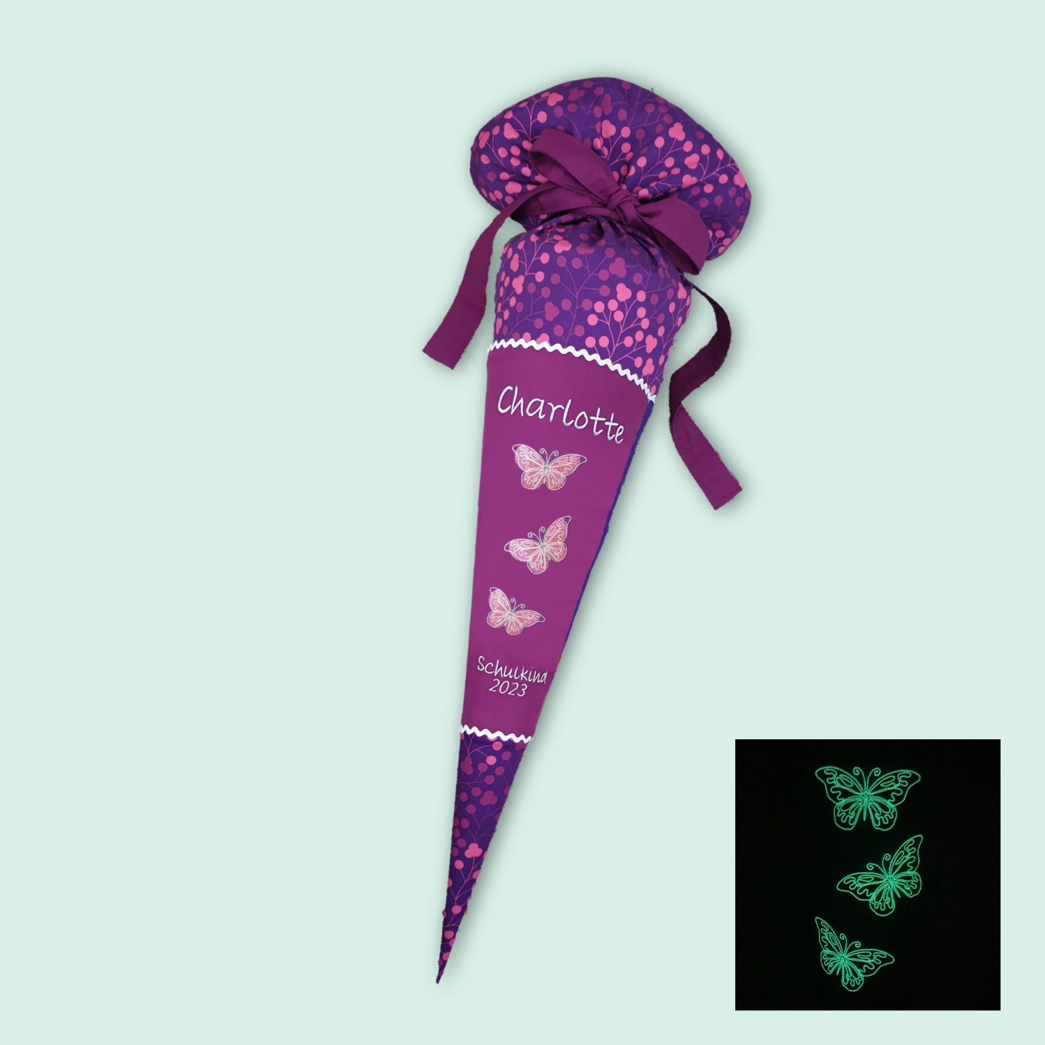 Schultüte mit Schmetterlingen und Namen farblich auf den Step by step Butterfly Night Schulranzen abgestimmt.