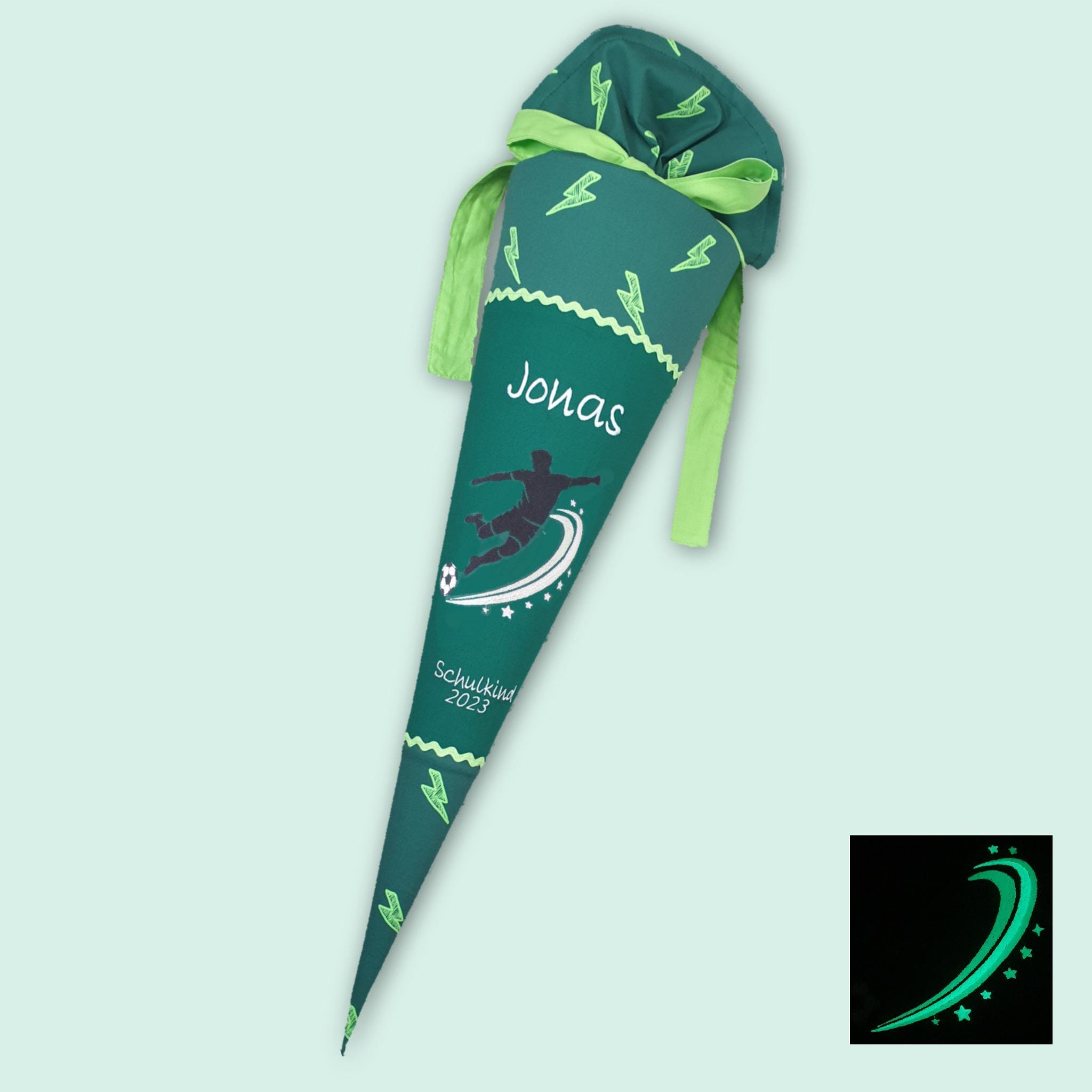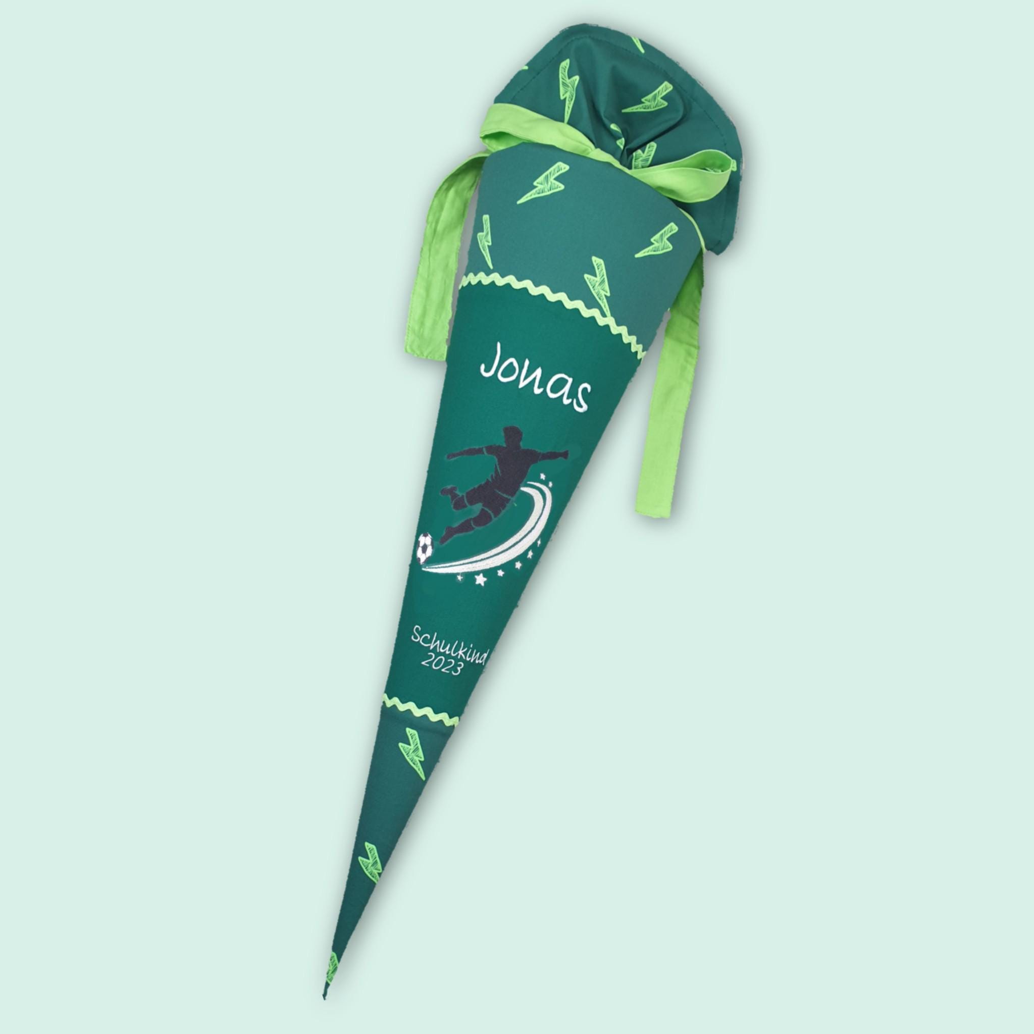 Schultüte mit Fusball und Namen farblich auf den Ergobag Bärtastisch Schulranzen abgestimmt.