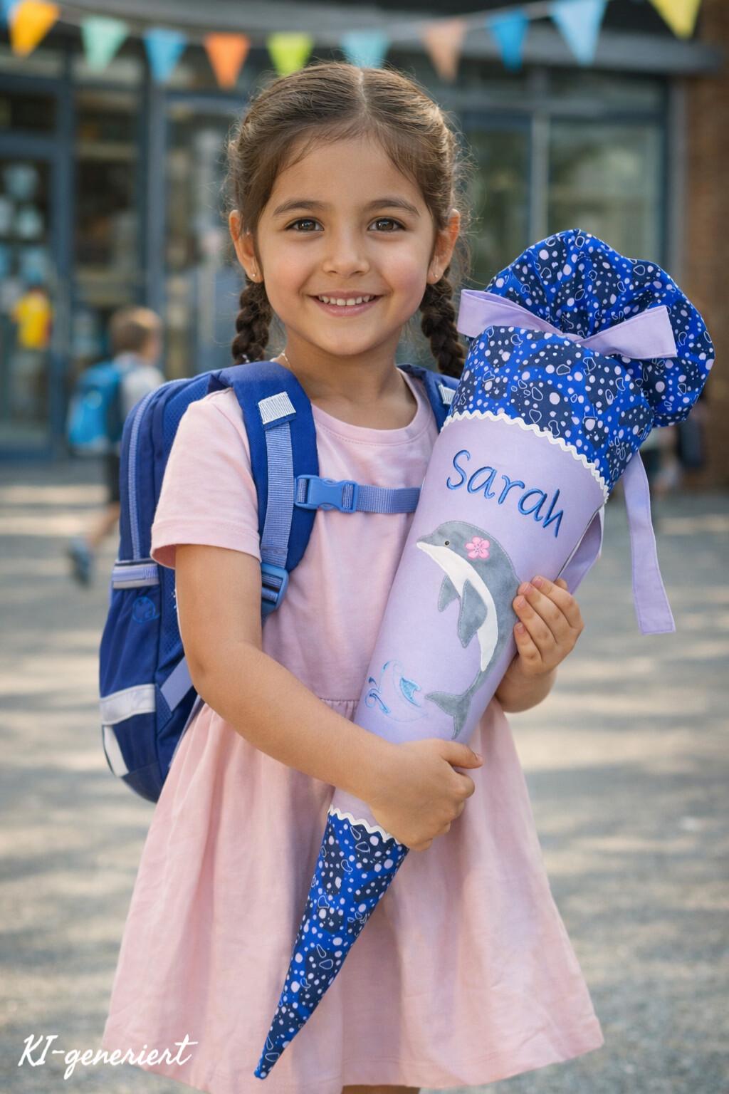 70 cm Schultüte oder 85 cm Schultüte mit Delfin und Namen farblich auf den Ozeanbärwohner Schulranzen abgestimmt.