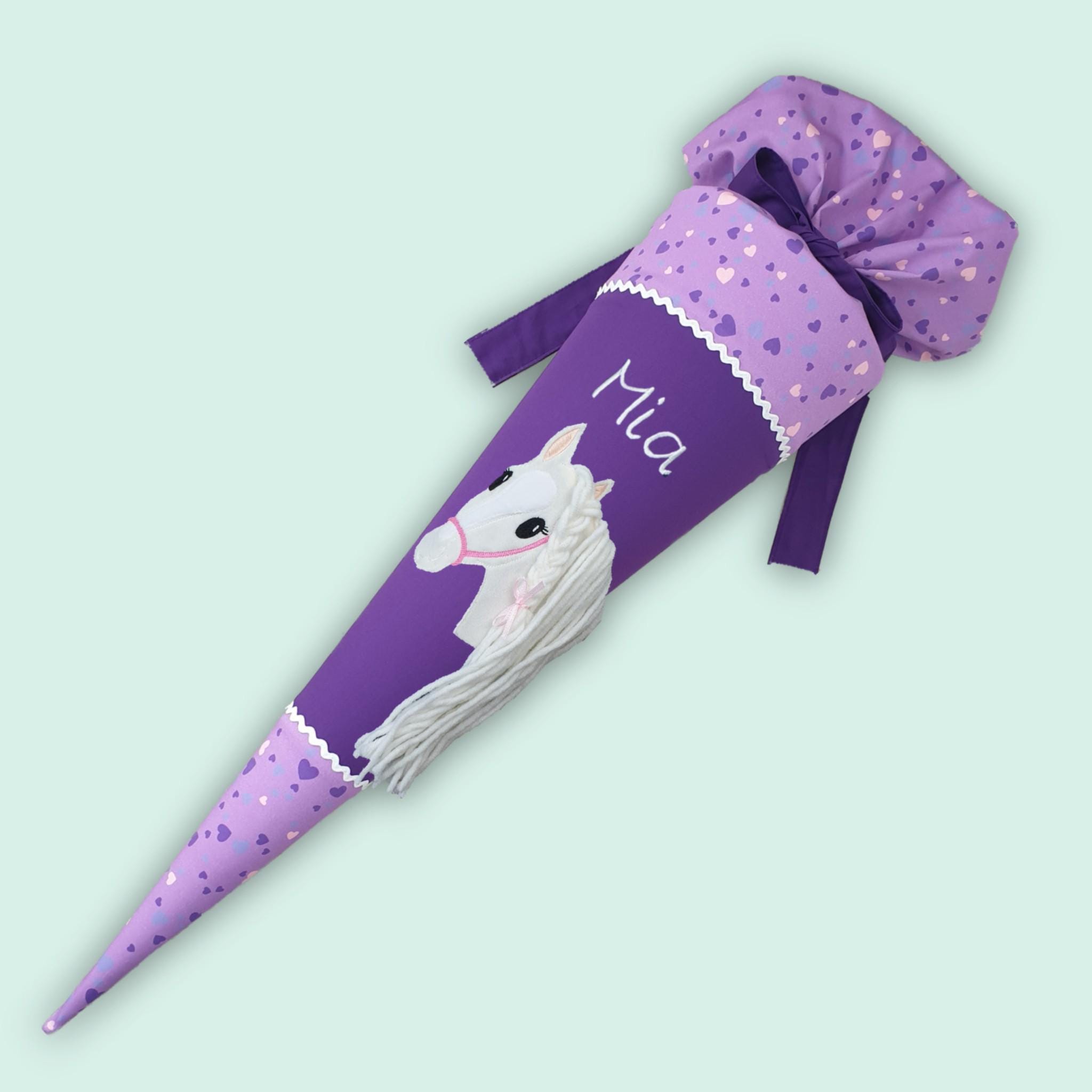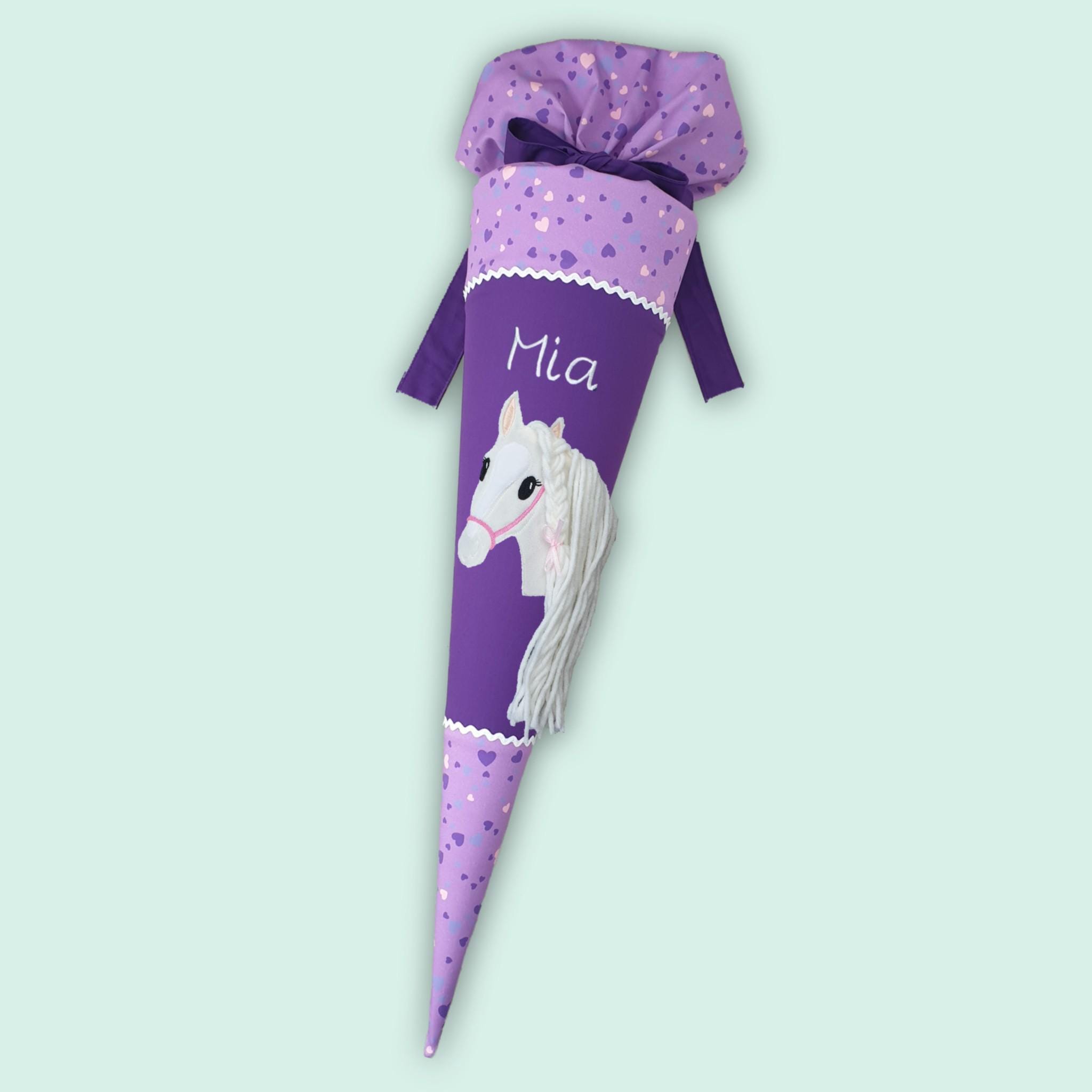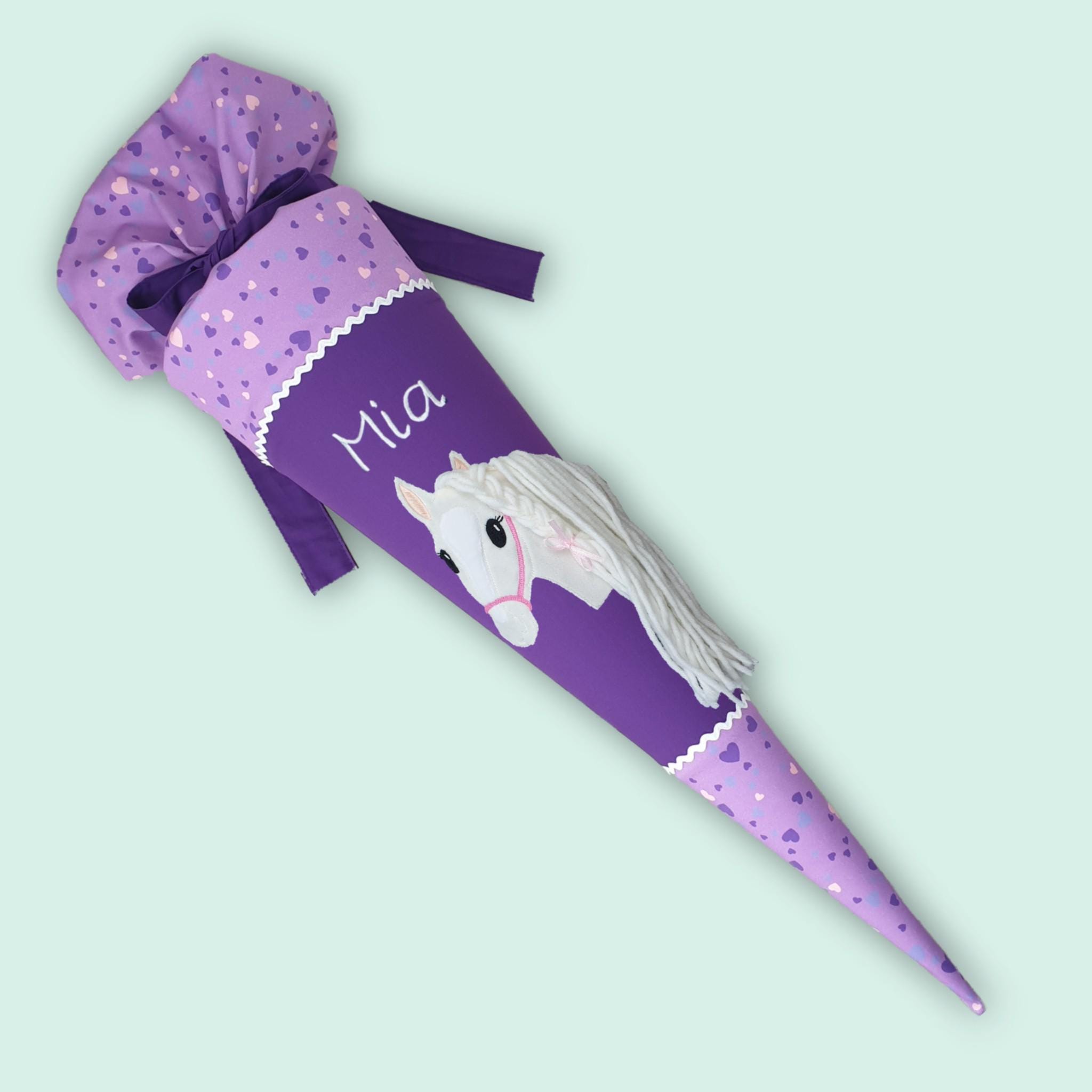 Schultüte mit Pferd und Namen farblich auf den Step by step Horse Club abgestimmt.
