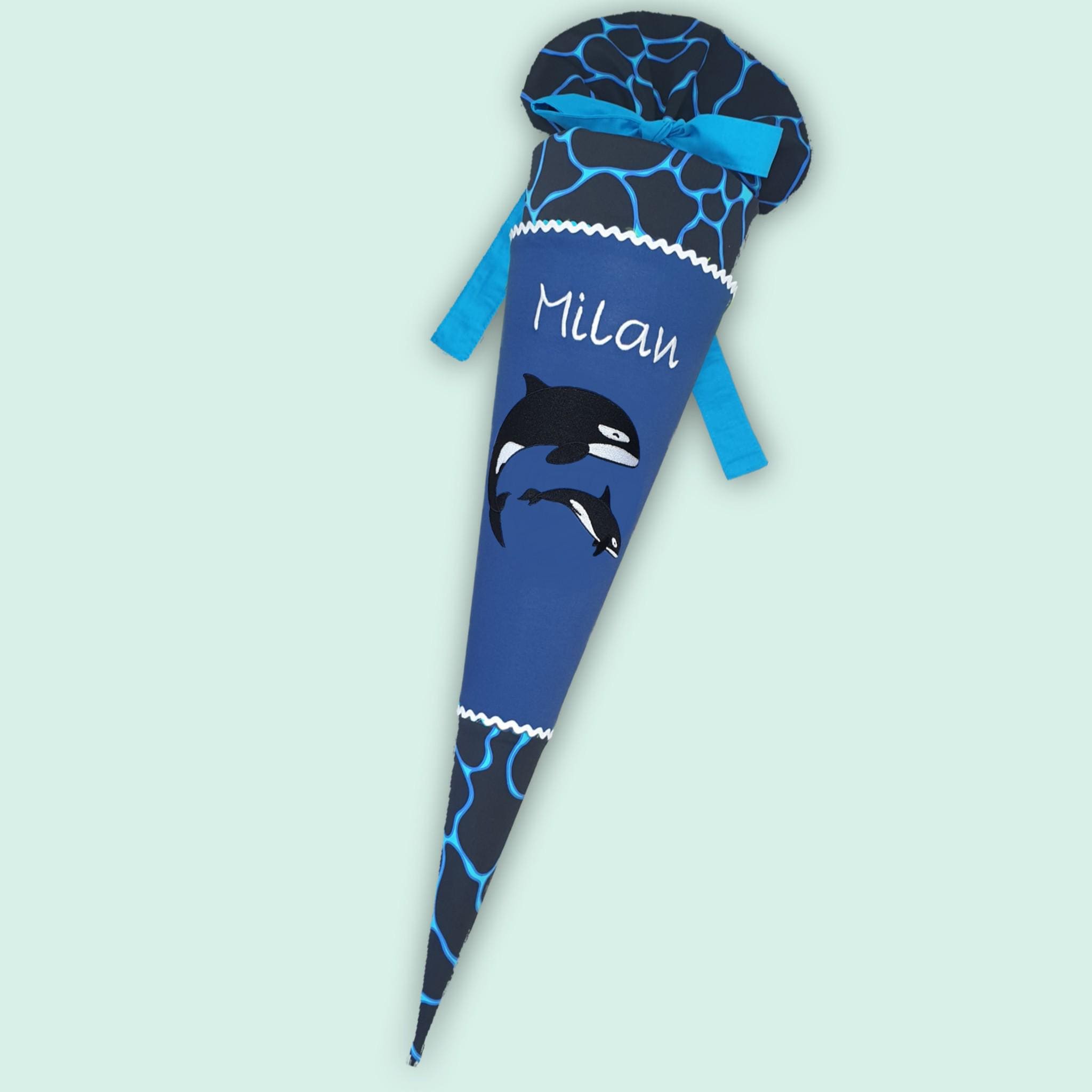 Schultüte mit Orca und Namen farblich auf den Bärassic Garden Schulranzen abgestimmt.
