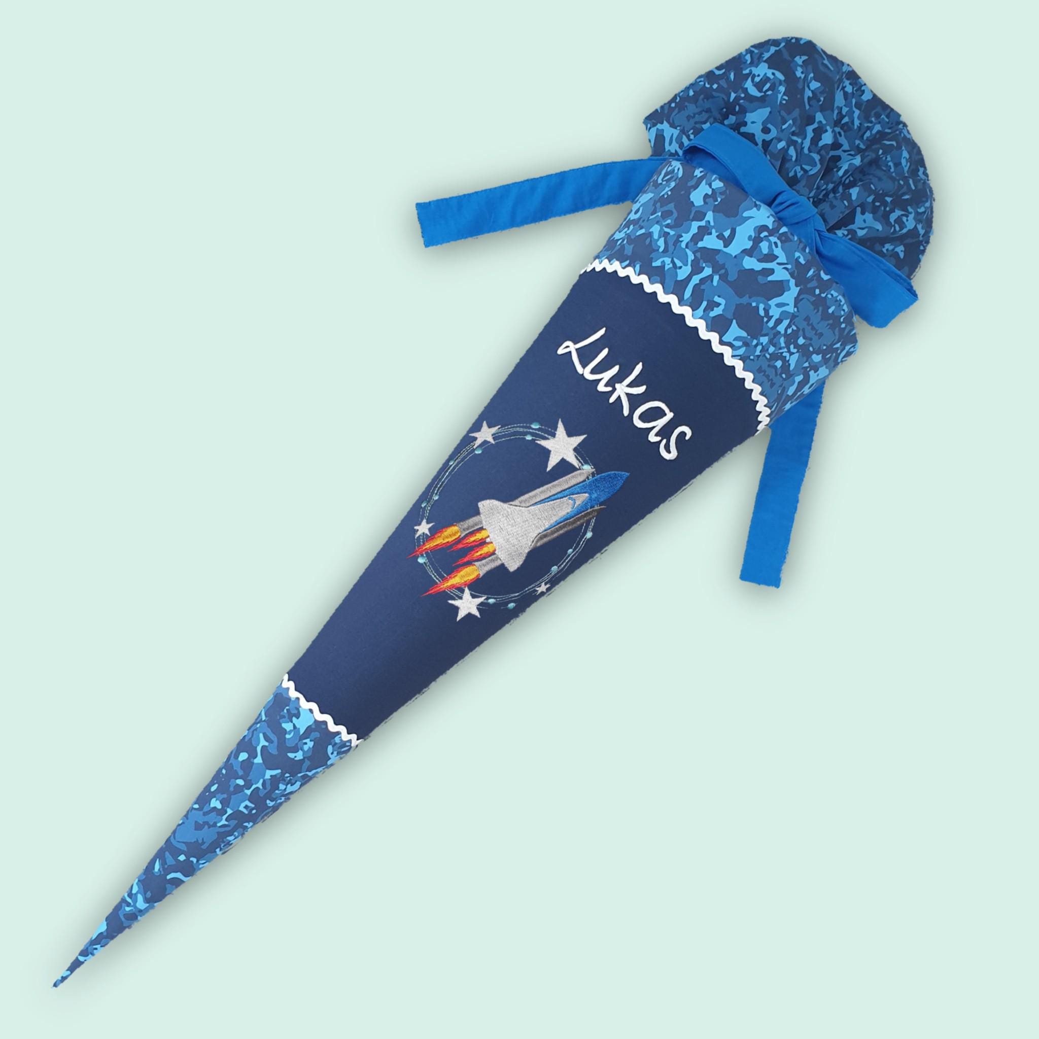 Schultüte mit Rakete und Namen farblich auf den Manta Rio Schulranzen abgestimmt.