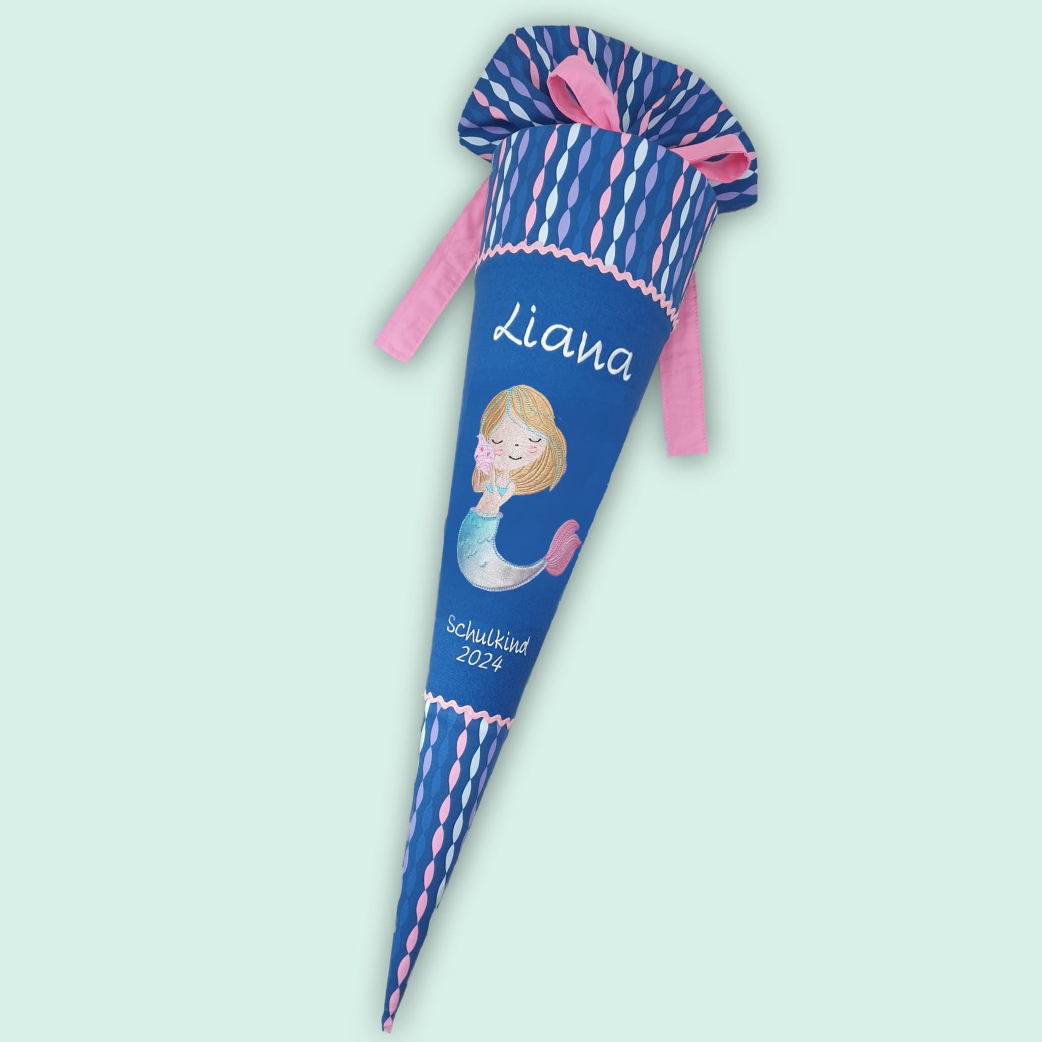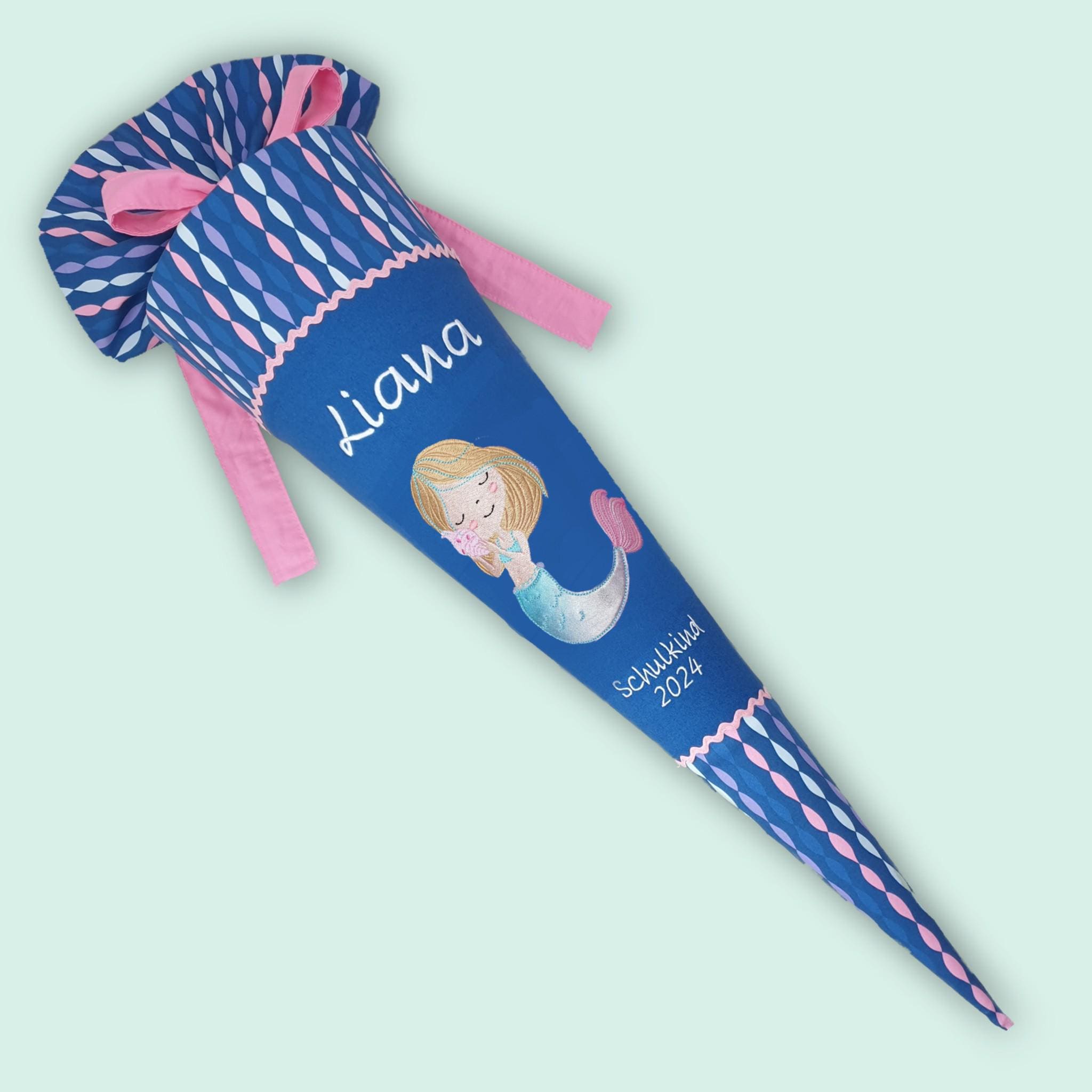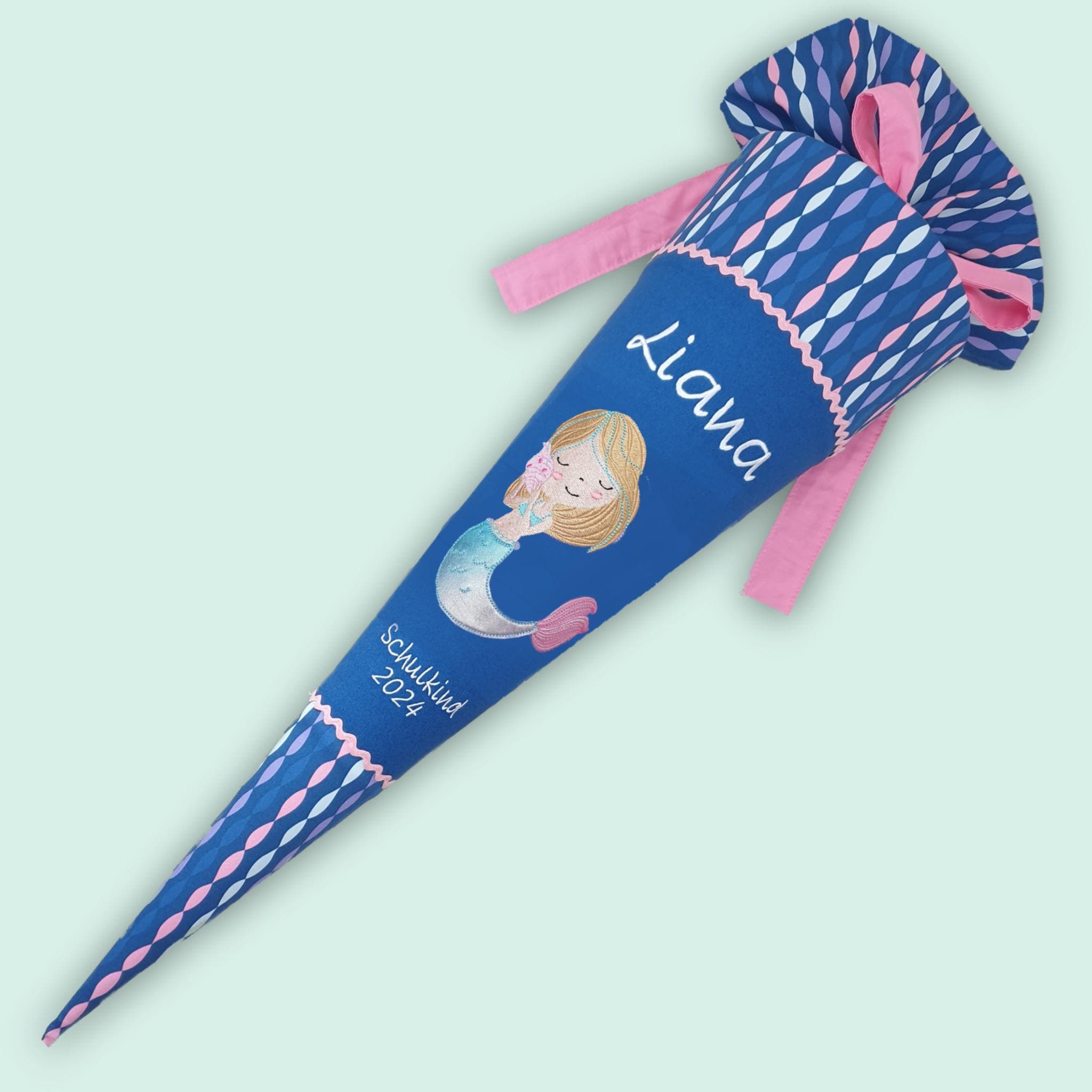 Schultüte mit Meerjungfrau und Namen farblich auf den Step by step Mermaid Schulranzen abgestimmt.