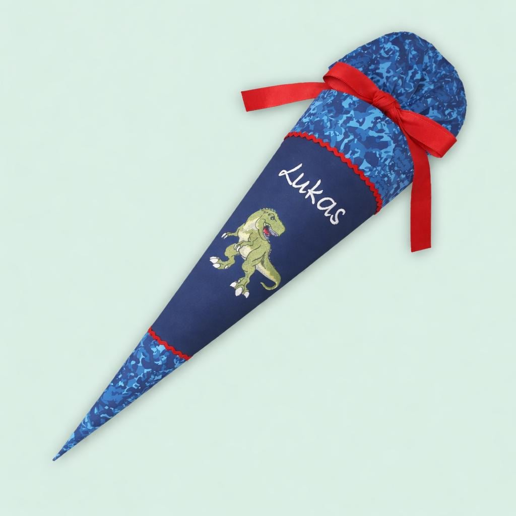Schultüte mit Dino und Namen farblich auf den Manta Rio Schulranzen abgestimmt.
