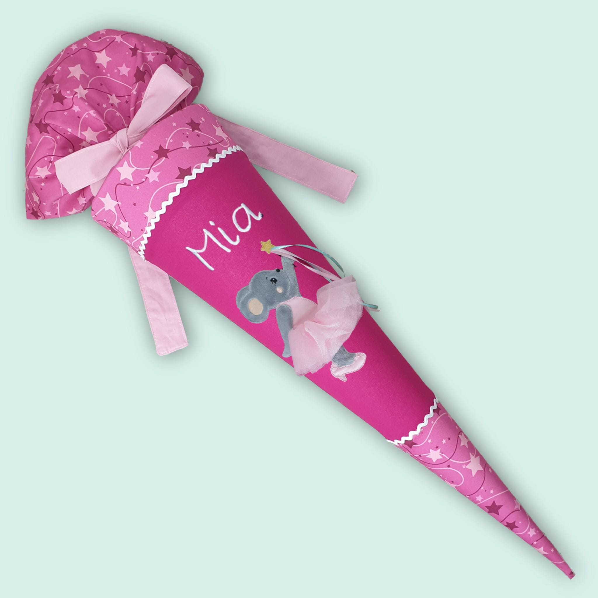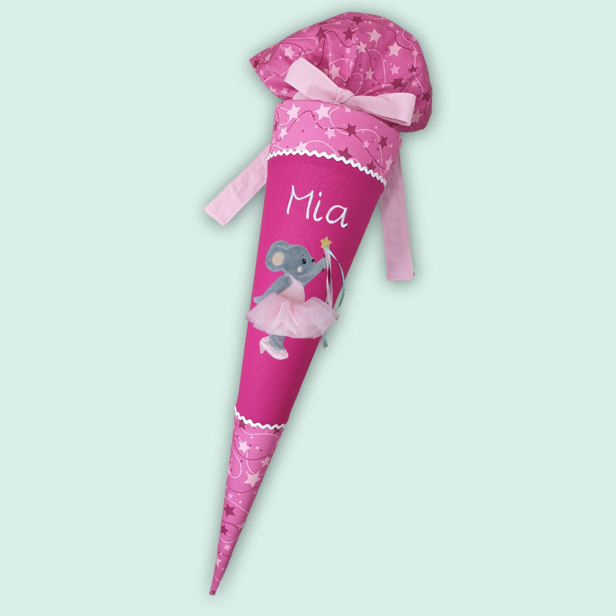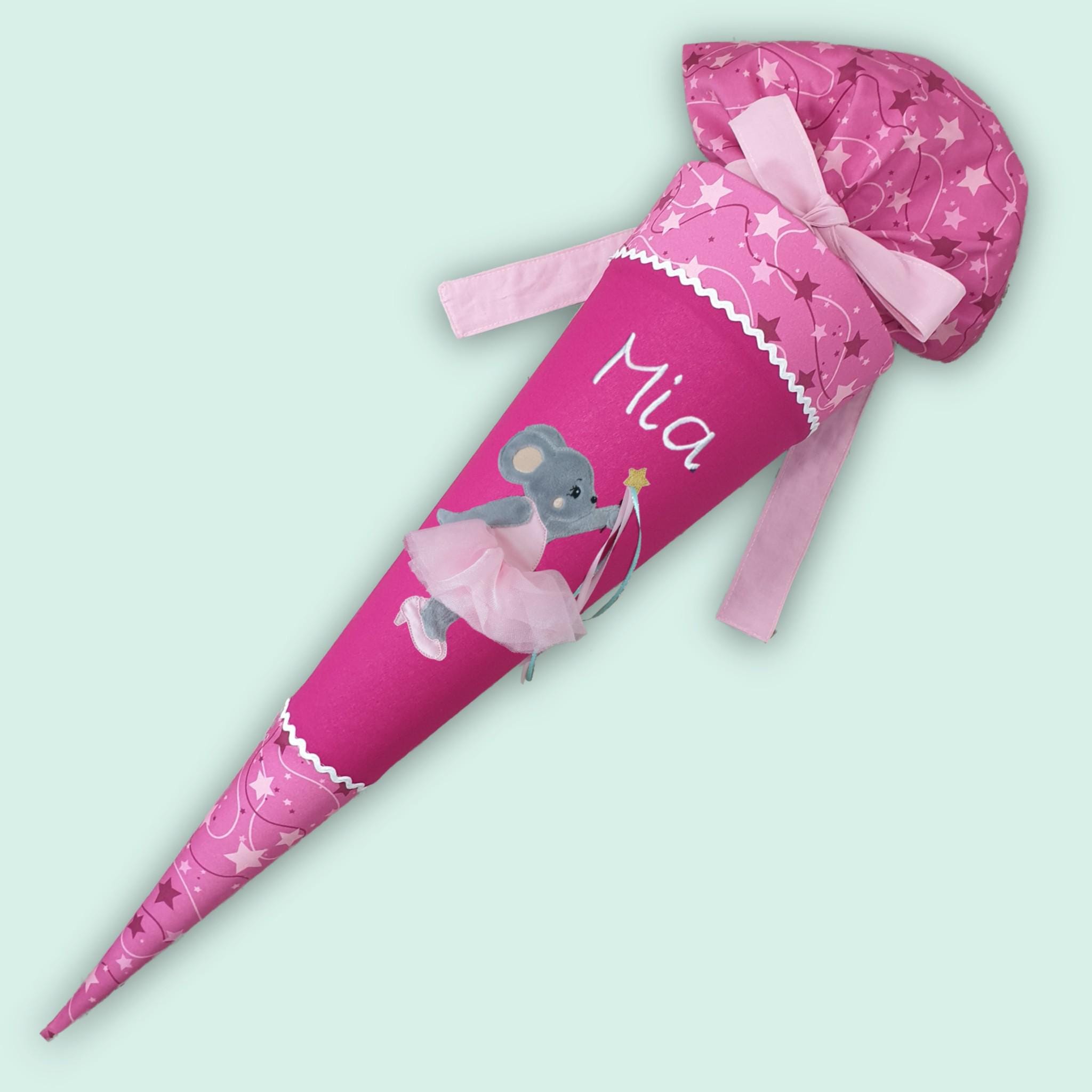 Schultüte mit Maus und Namen farblich auf den Marshmallow Einhorn Schulranzen abgestimmt.