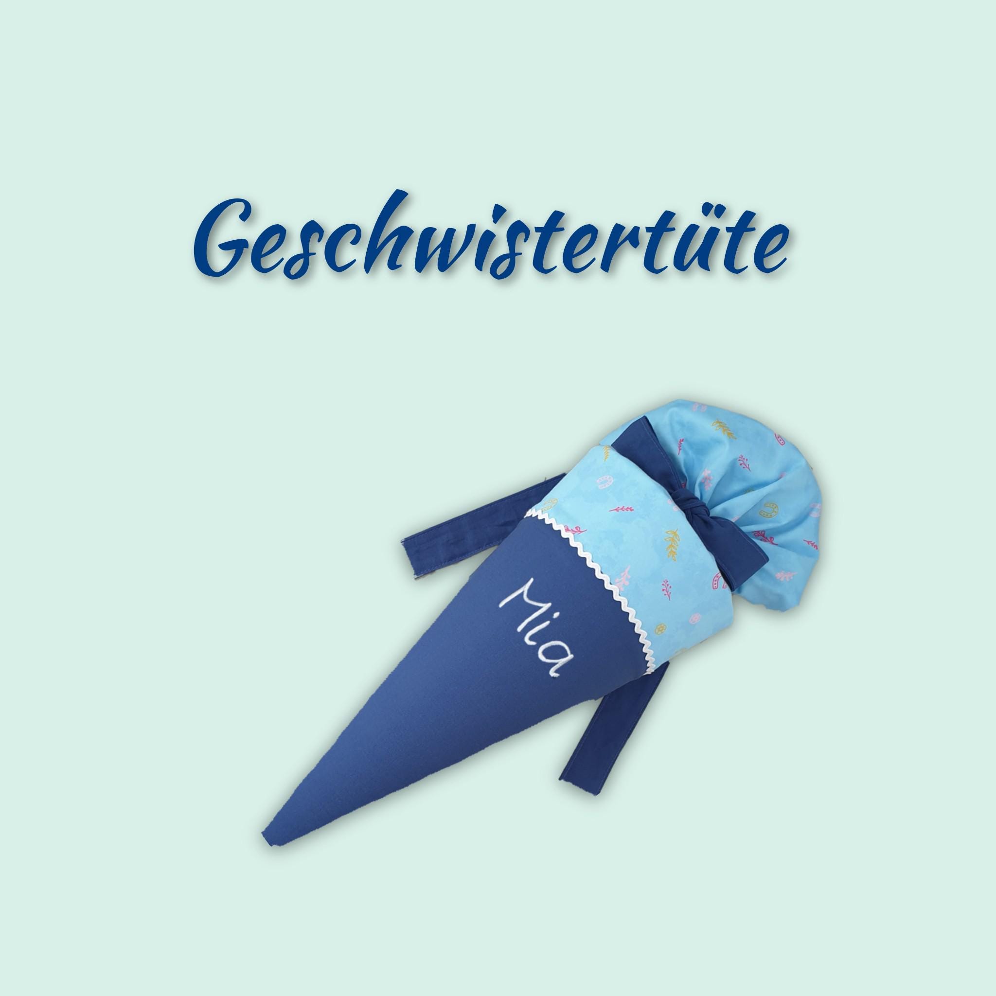 Die Geschwistertüte ist mit Zackenlitze aus Baumwolle verziert und wird mit einem genähten Baumwollband sicher verschlossen.
