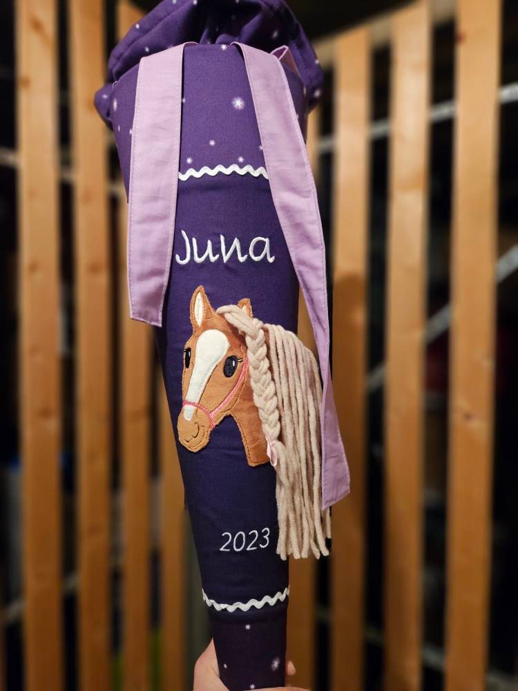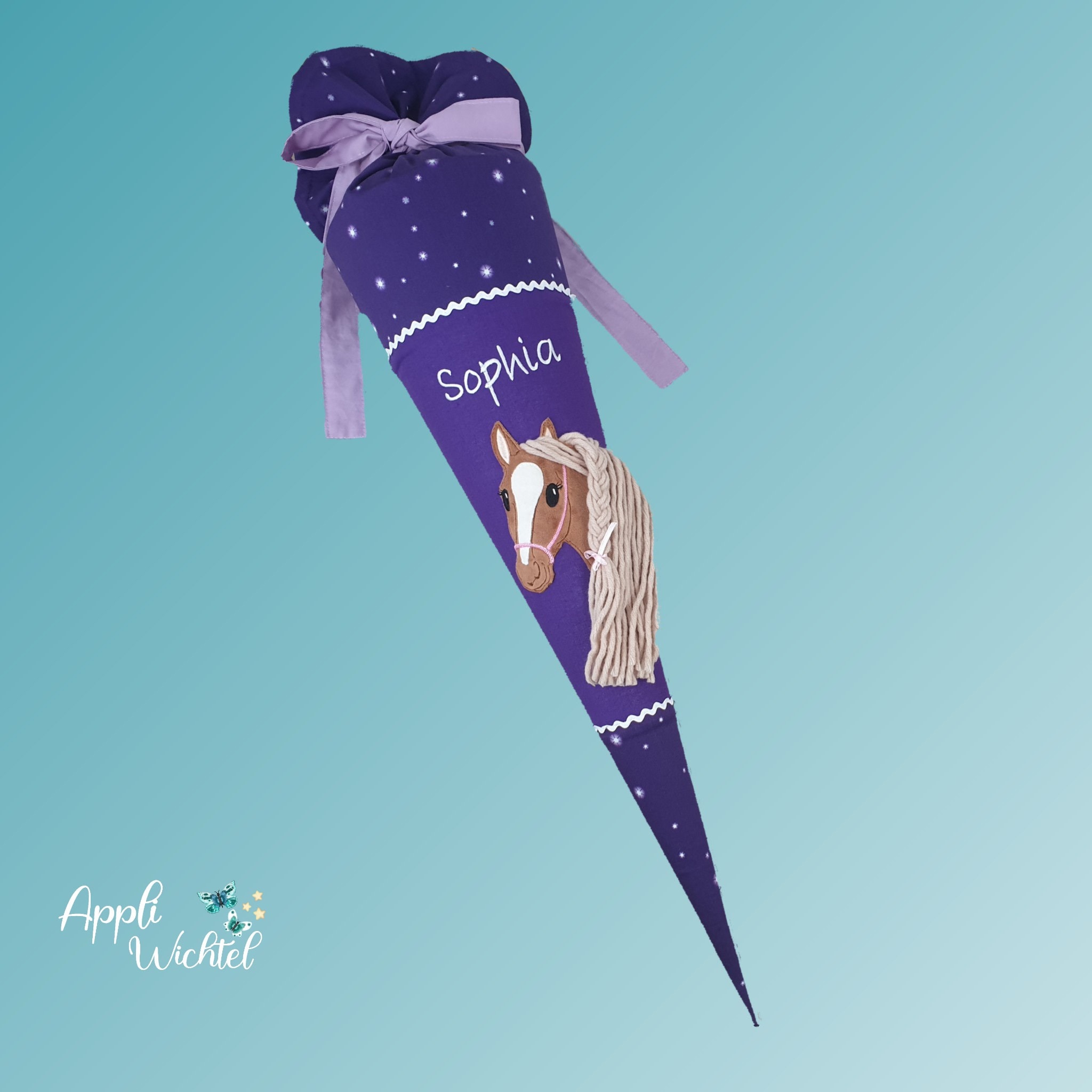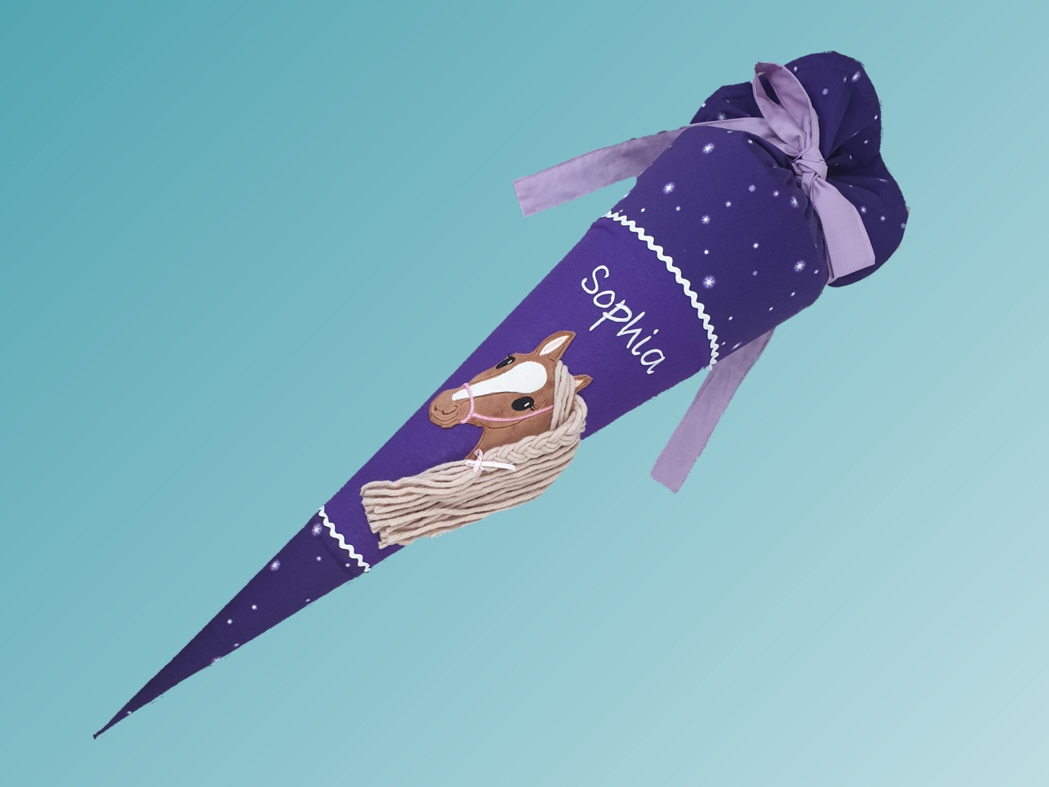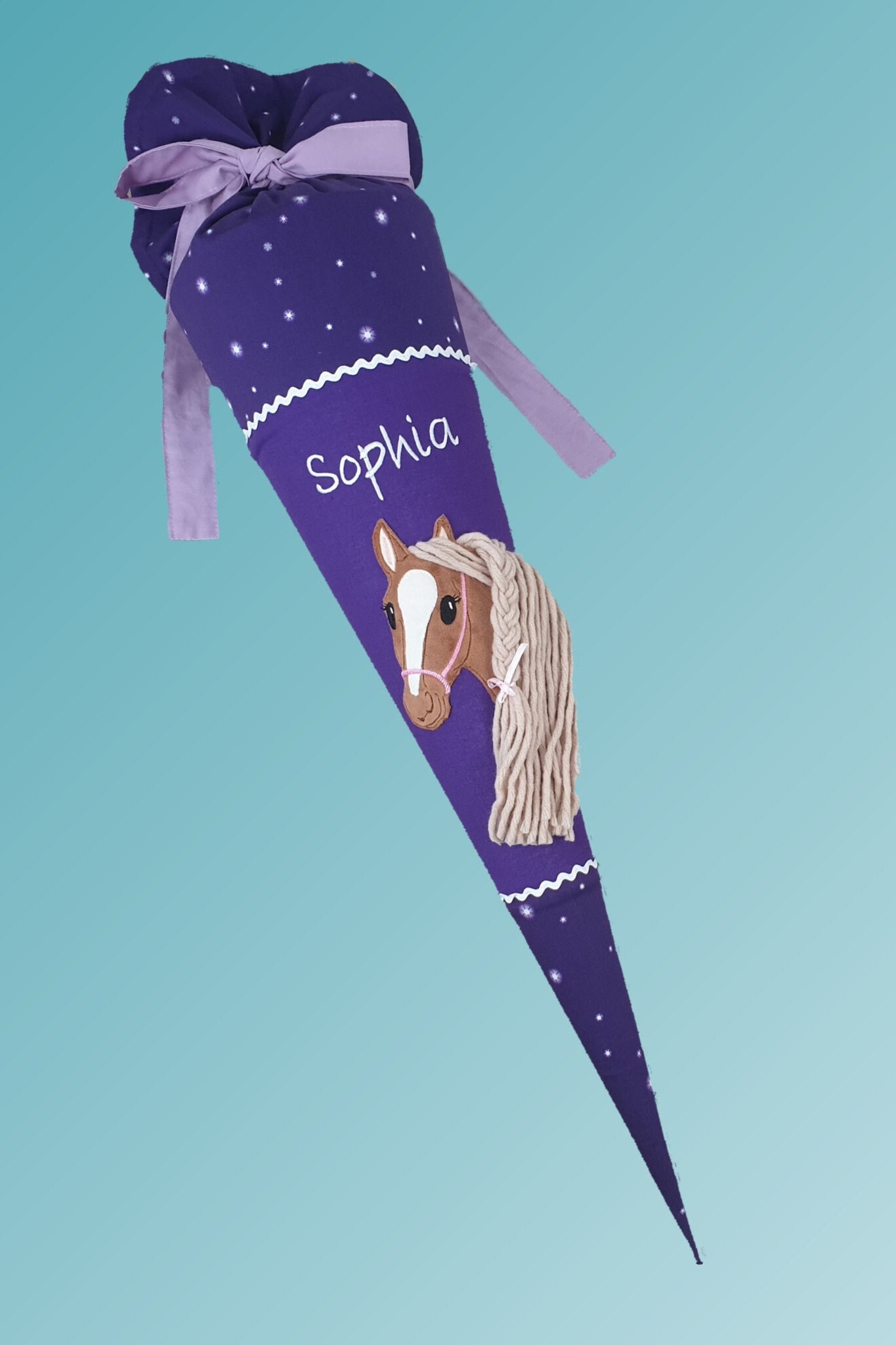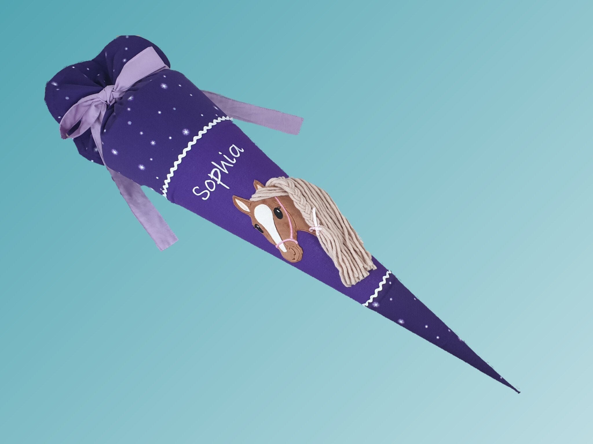 Schultüte mit 3D Pferdekopf und Namen farblich auf den Ergobag Bärgasus Schulranzen abgestimmt.