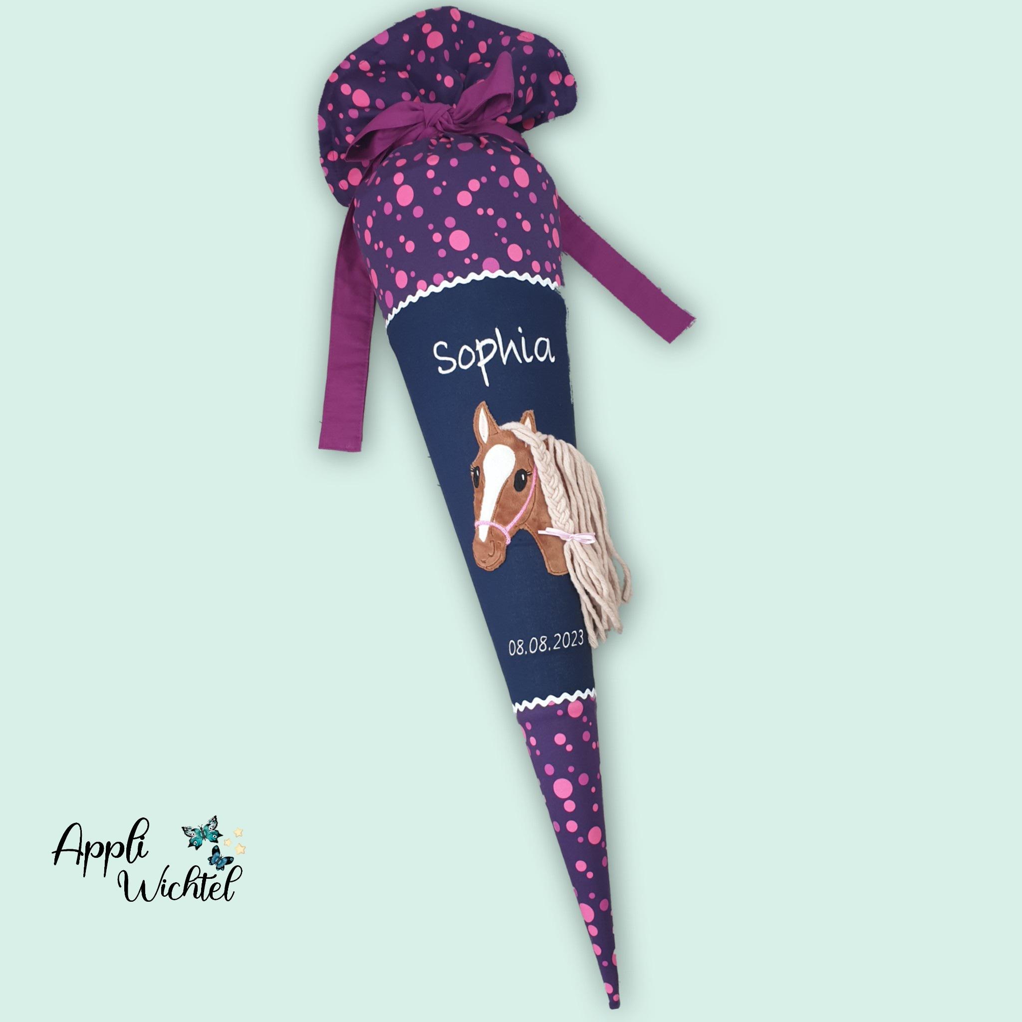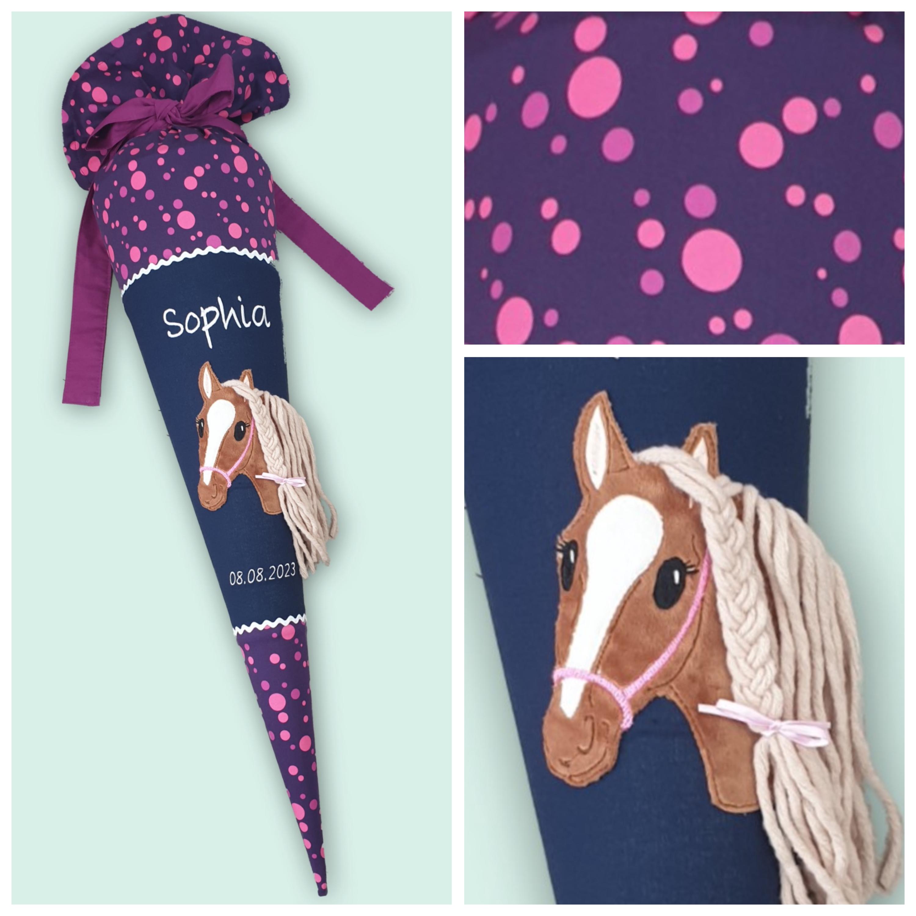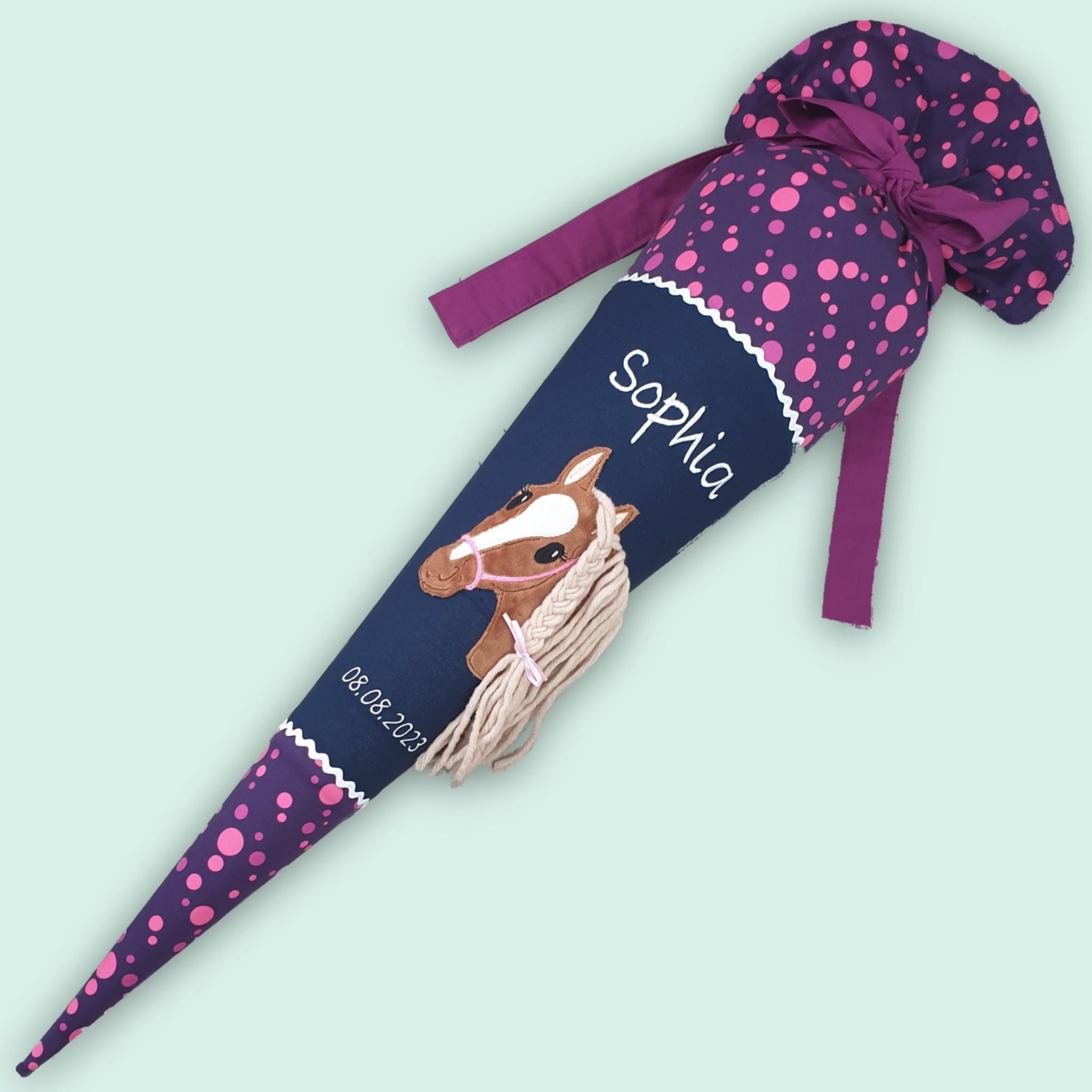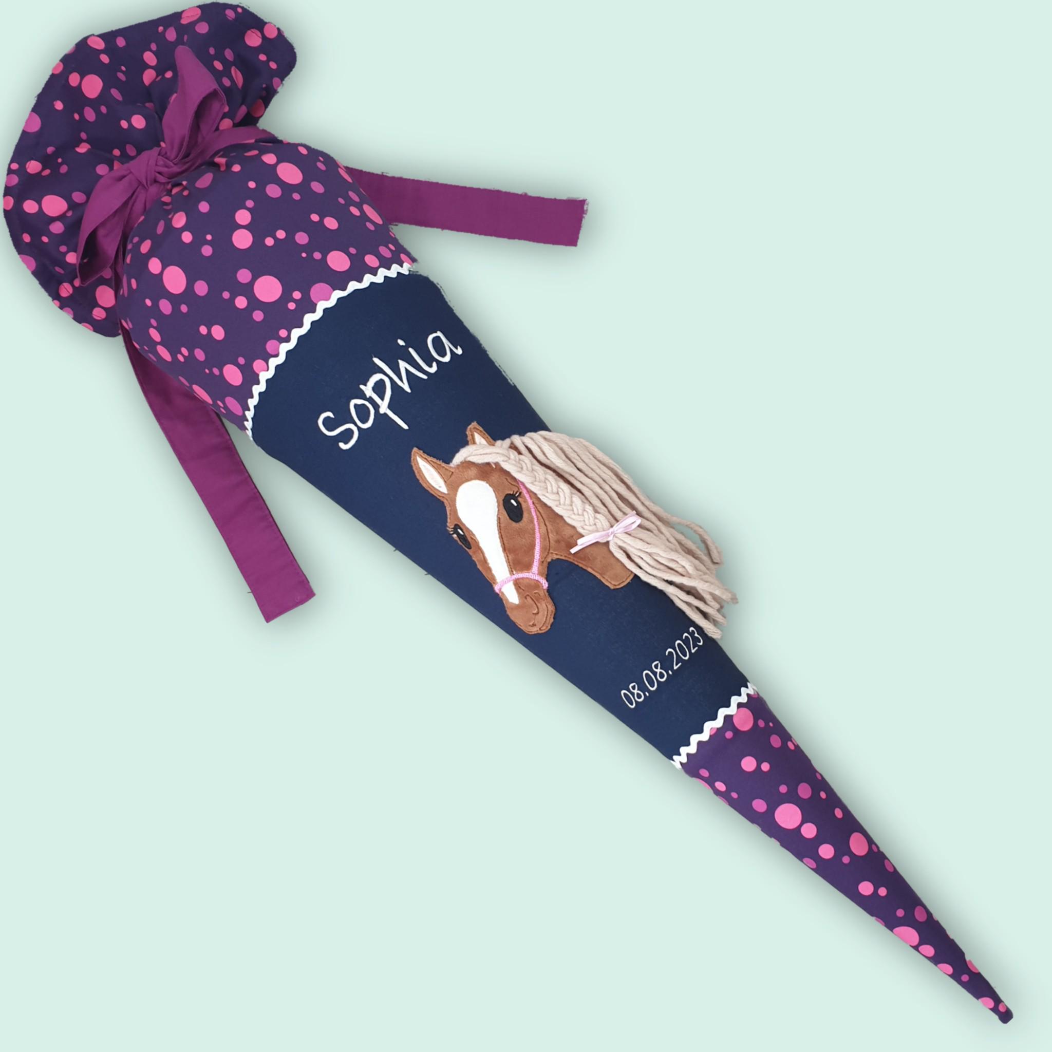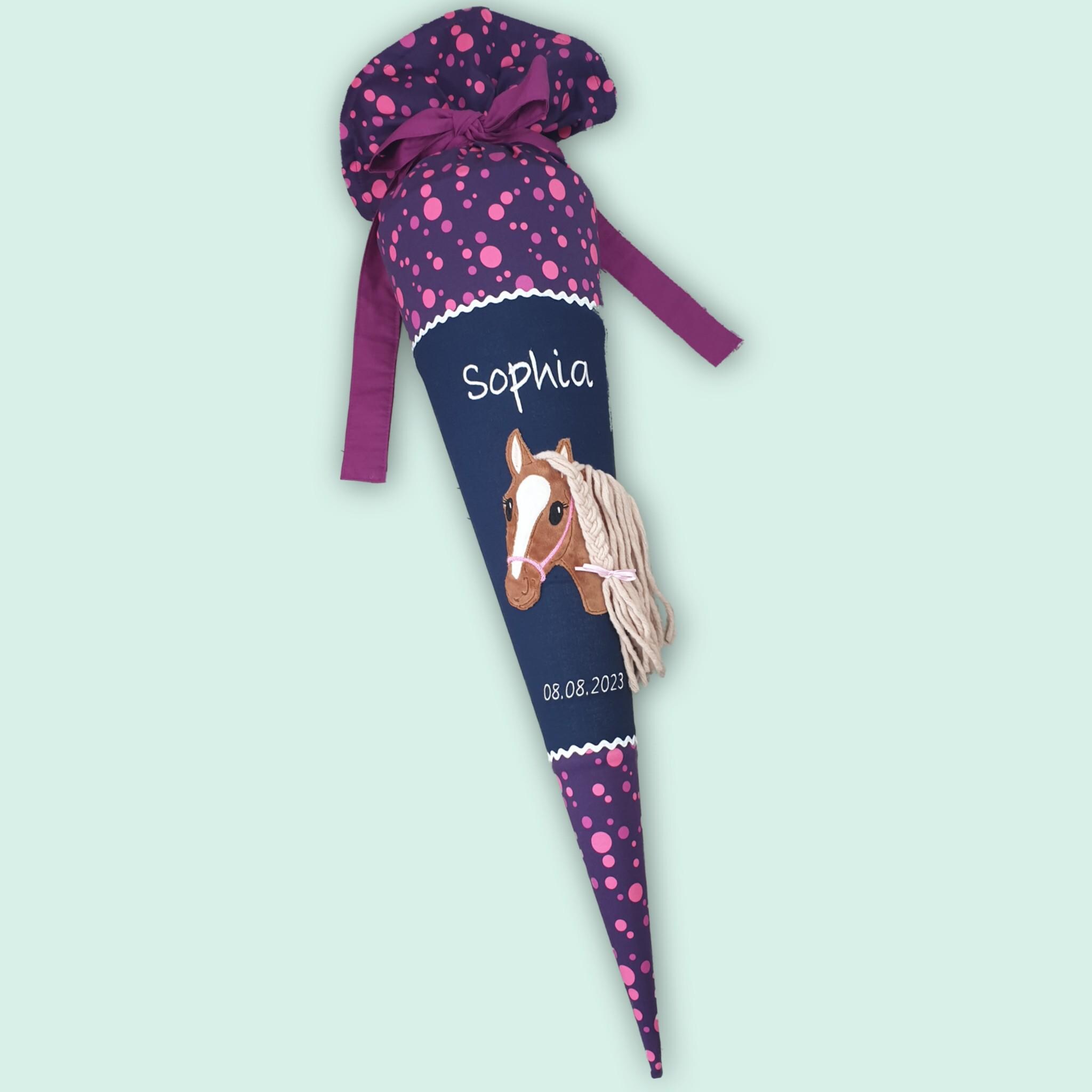 Schultüte mit 3D Pferdekopf und Namen farblich auf den Ergobag Bärmuda Viereck Schulranzen abgestimmt.