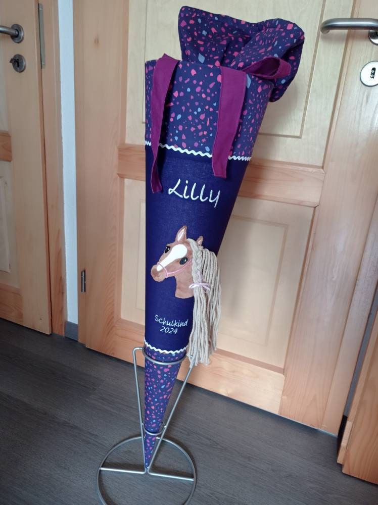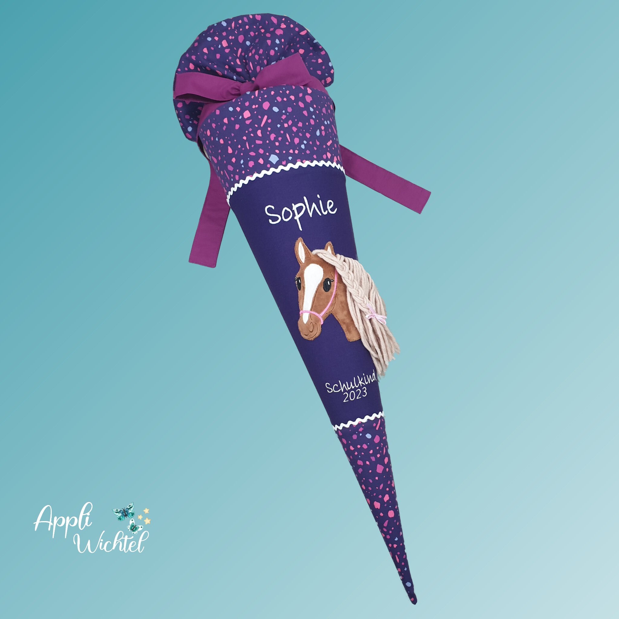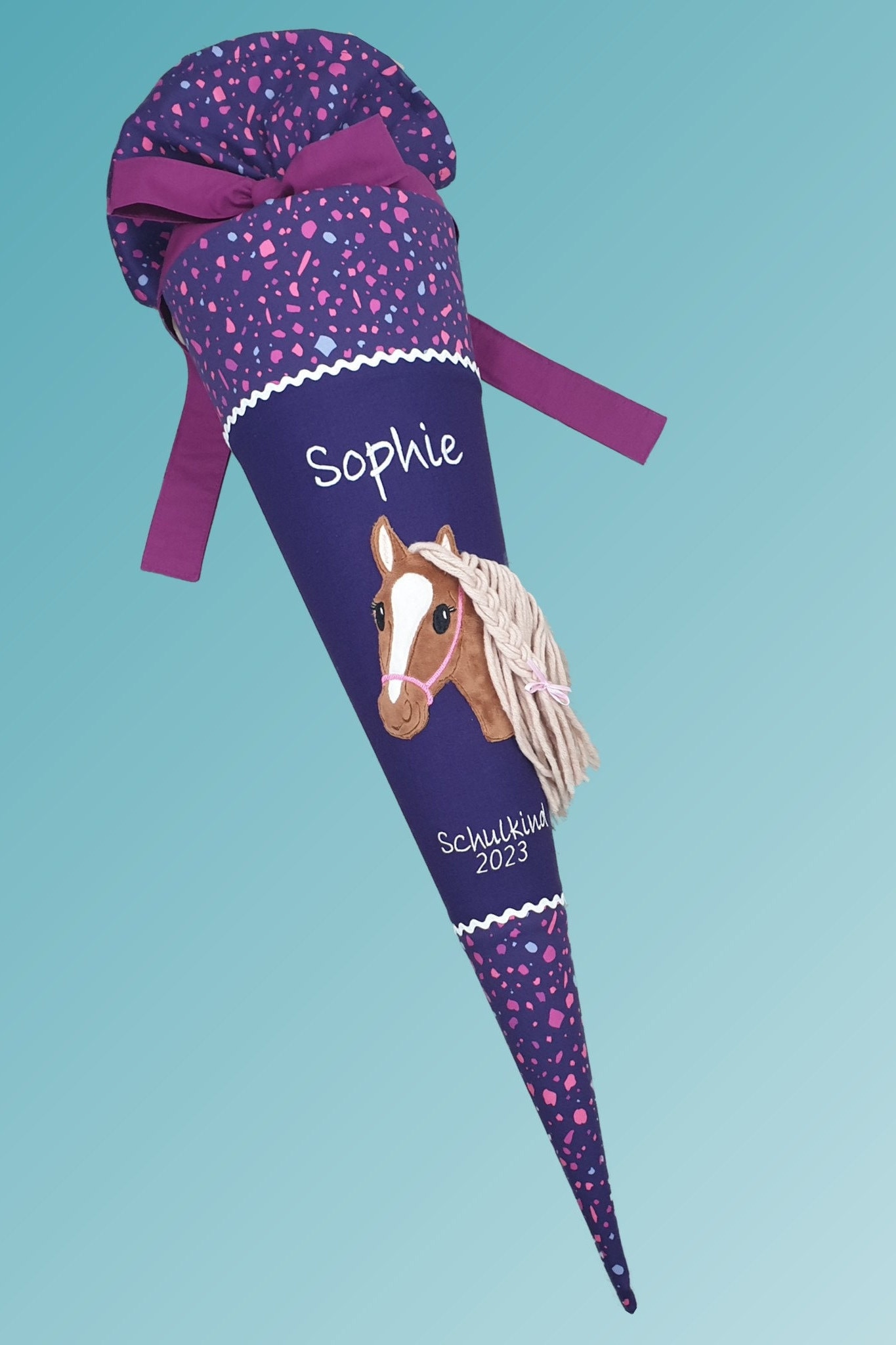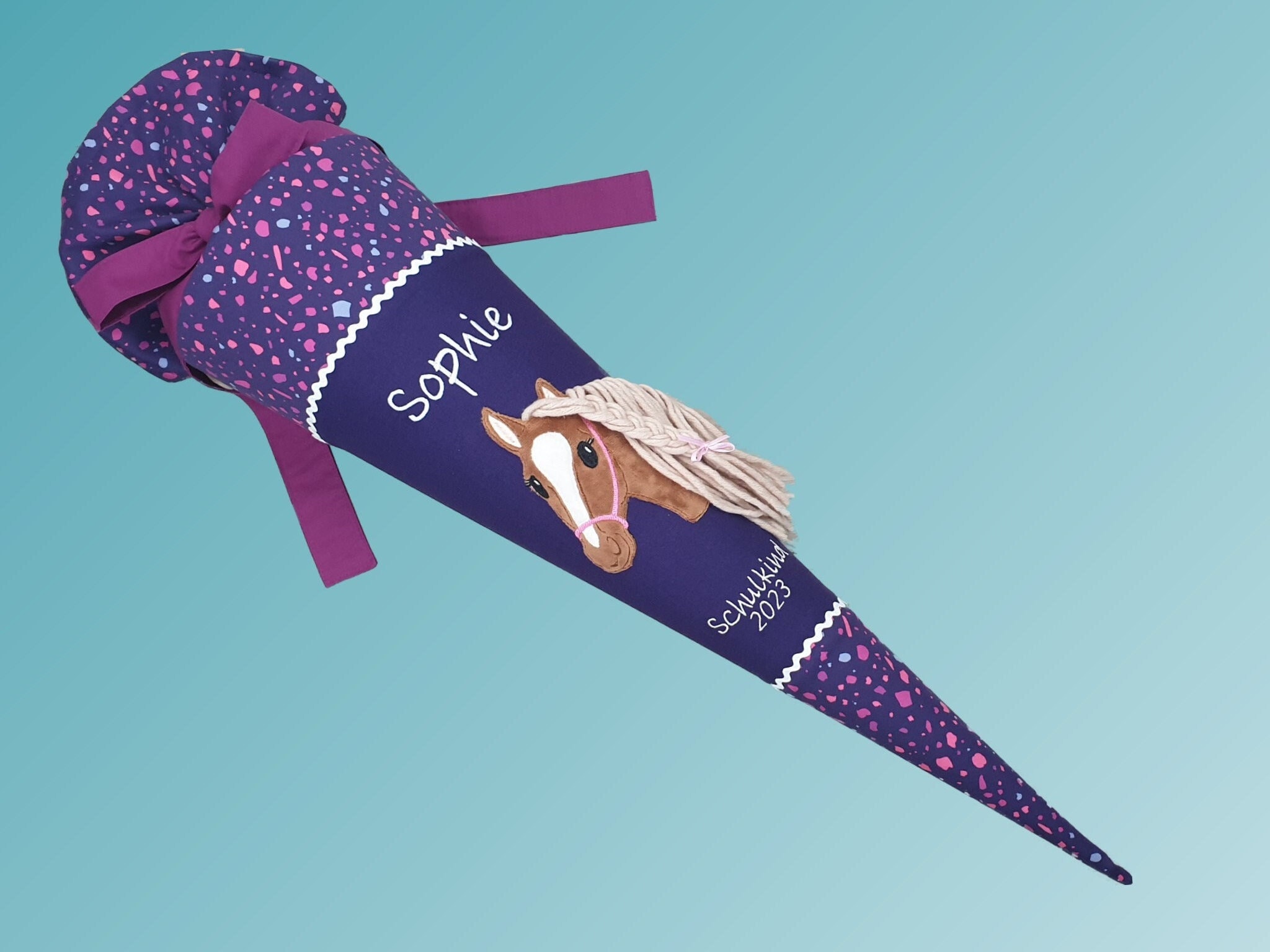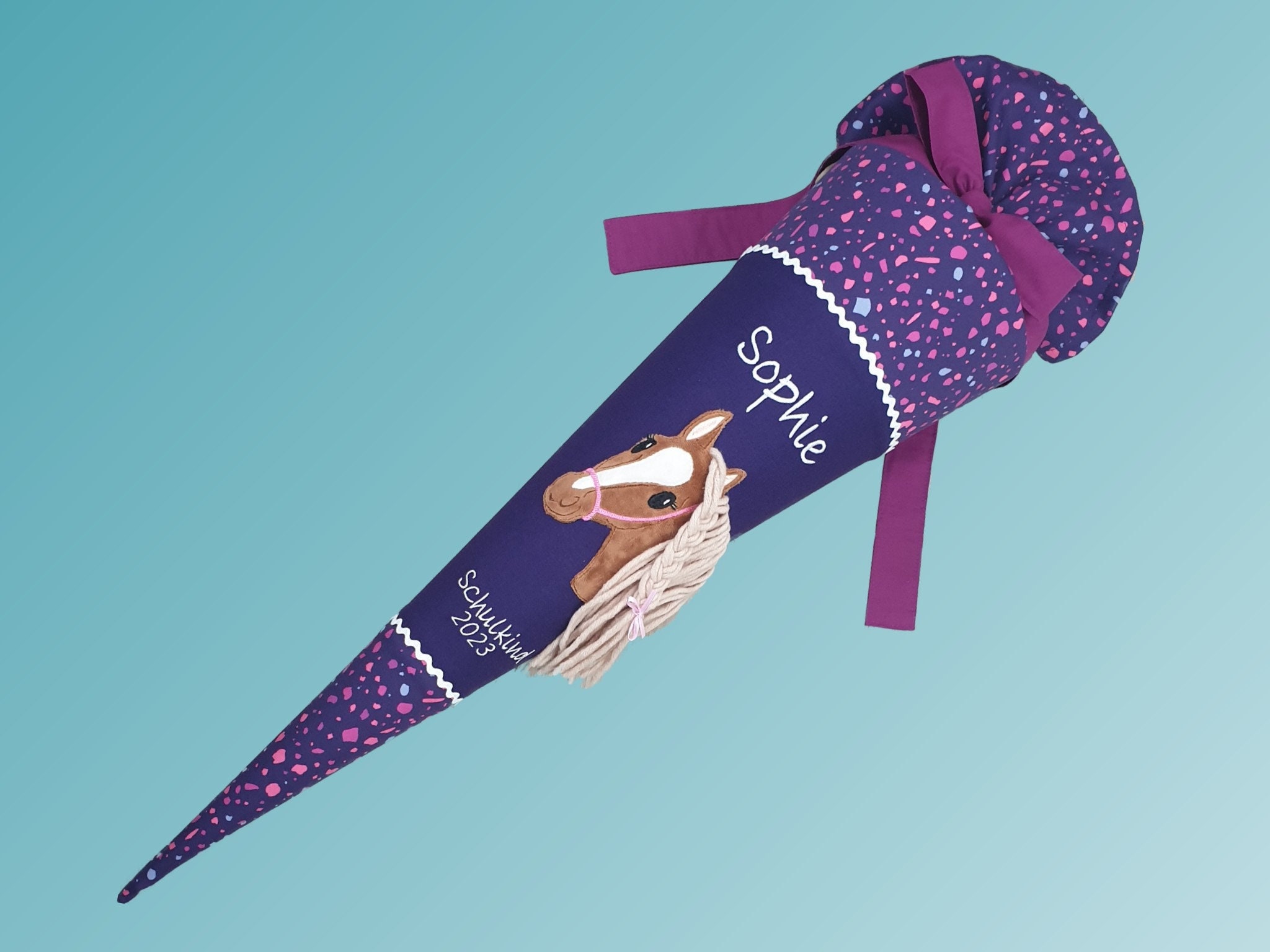 Schultüte mit 3D Pferdekopf und Namen farblich auf den Ergobag PferdeflüstBärer Schulranzen abgestimmt.