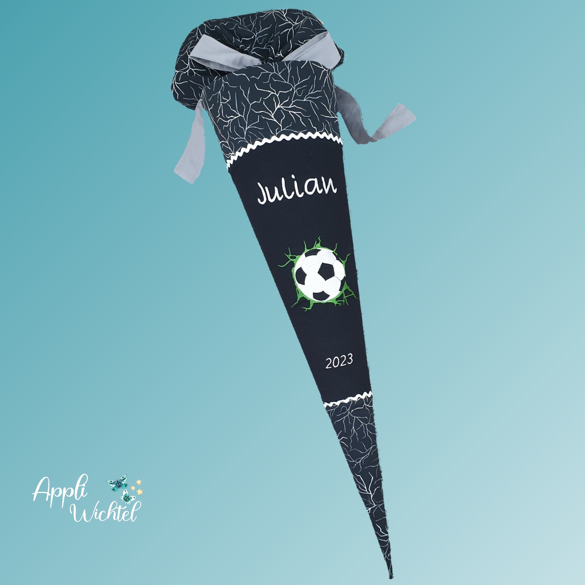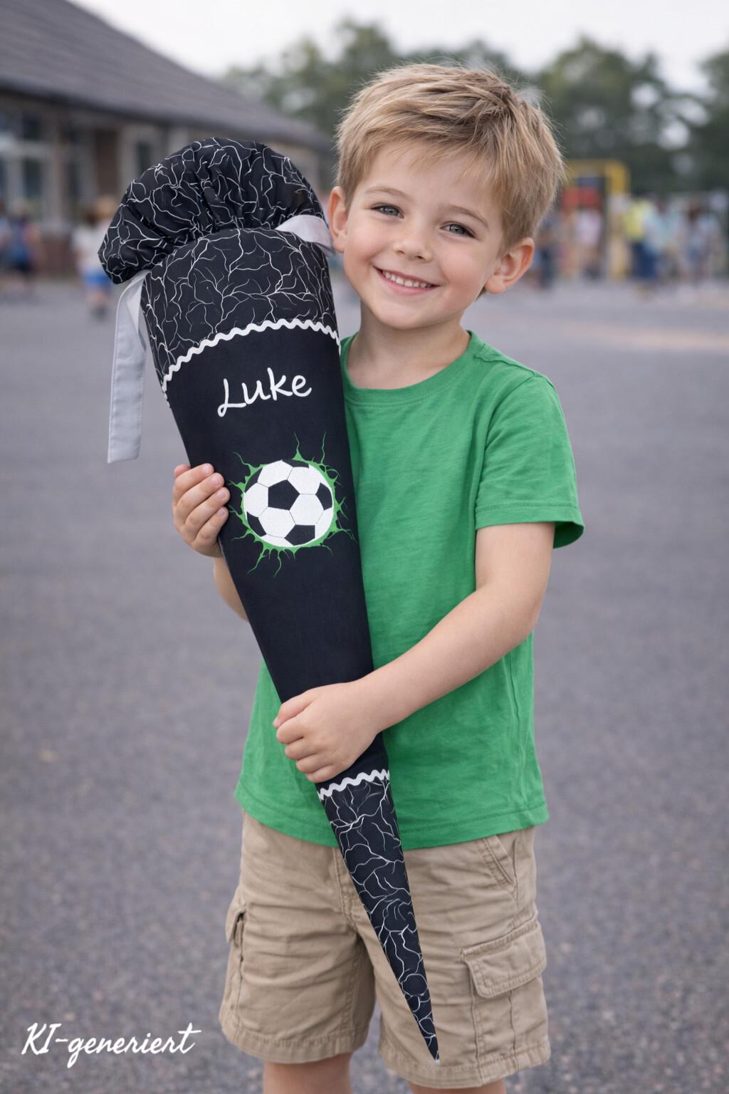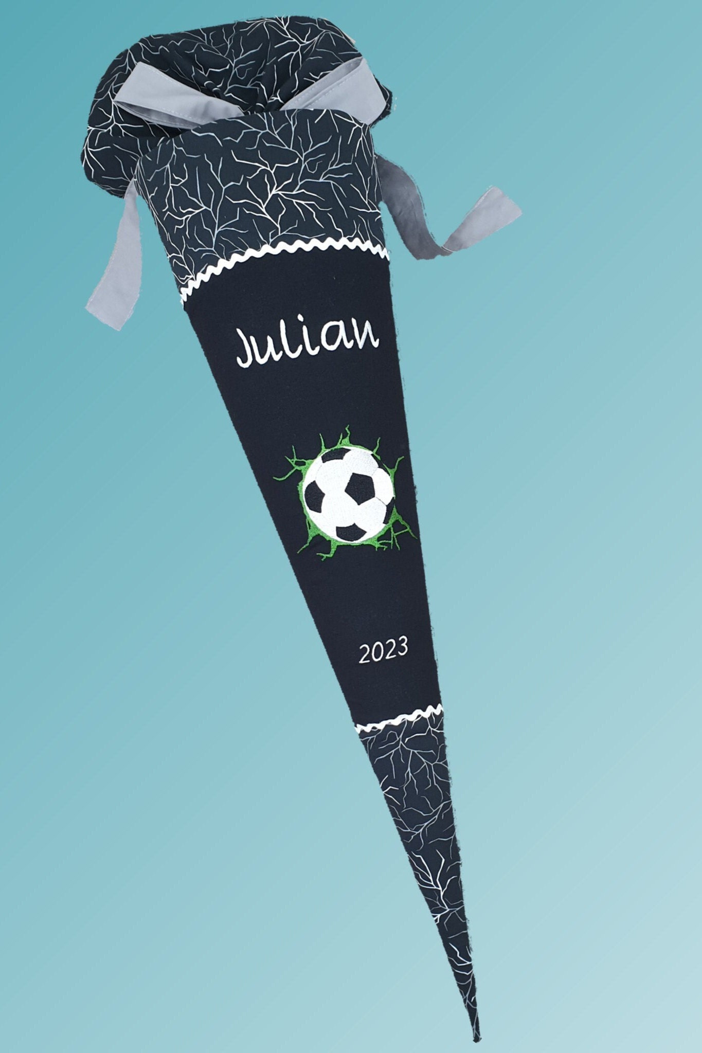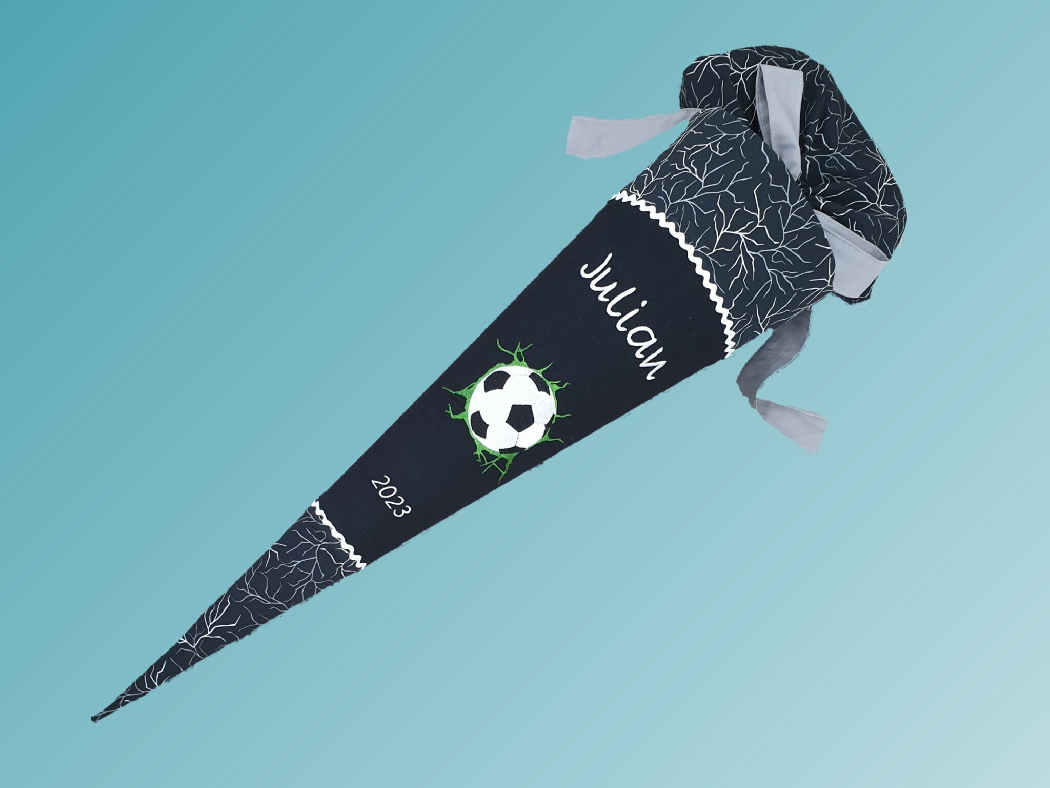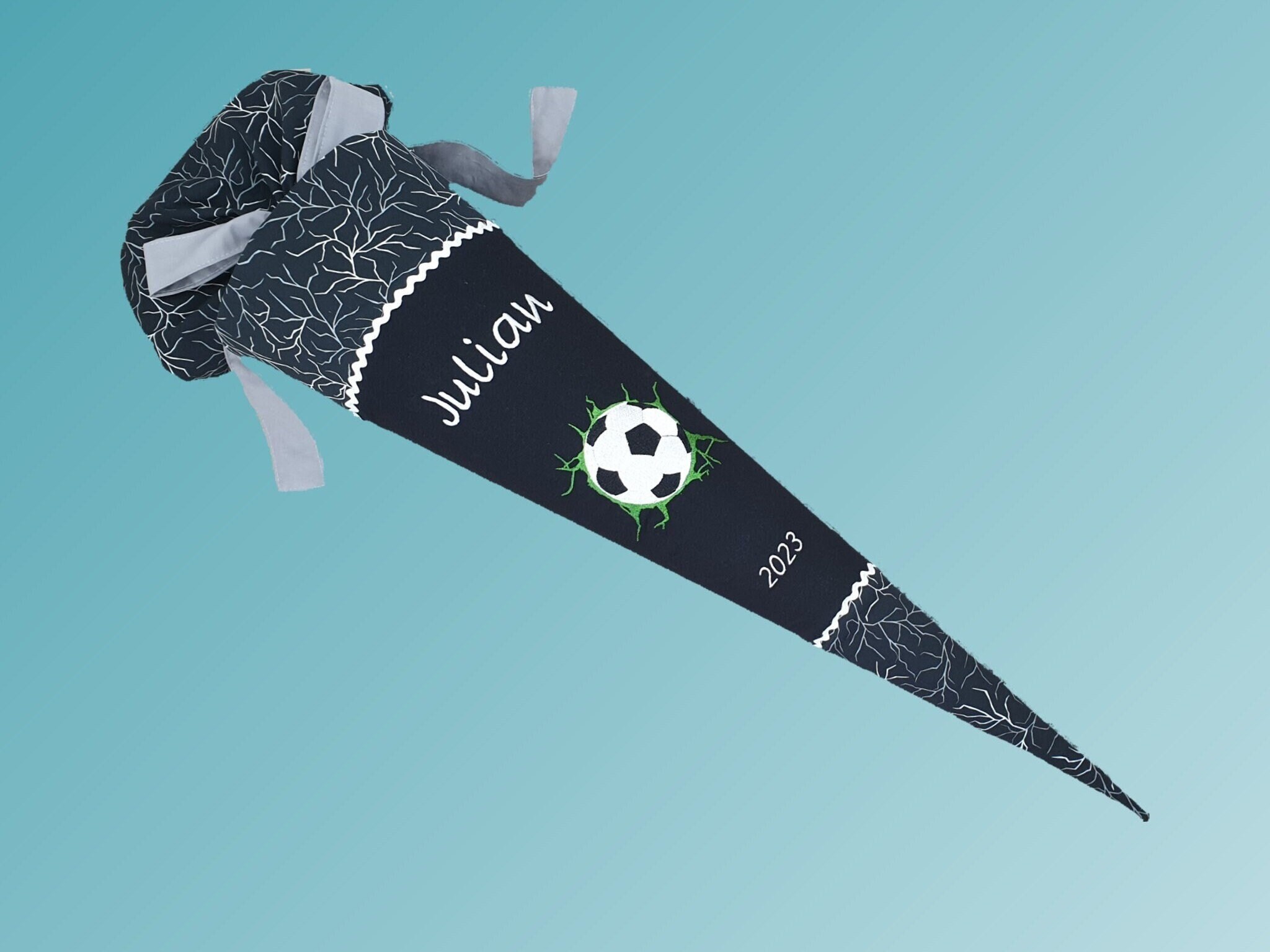 Schultüte mit Fussball und Namen farblich auf den Ergobag Super ReflektBär Glow Schulranzen abgestimmt.