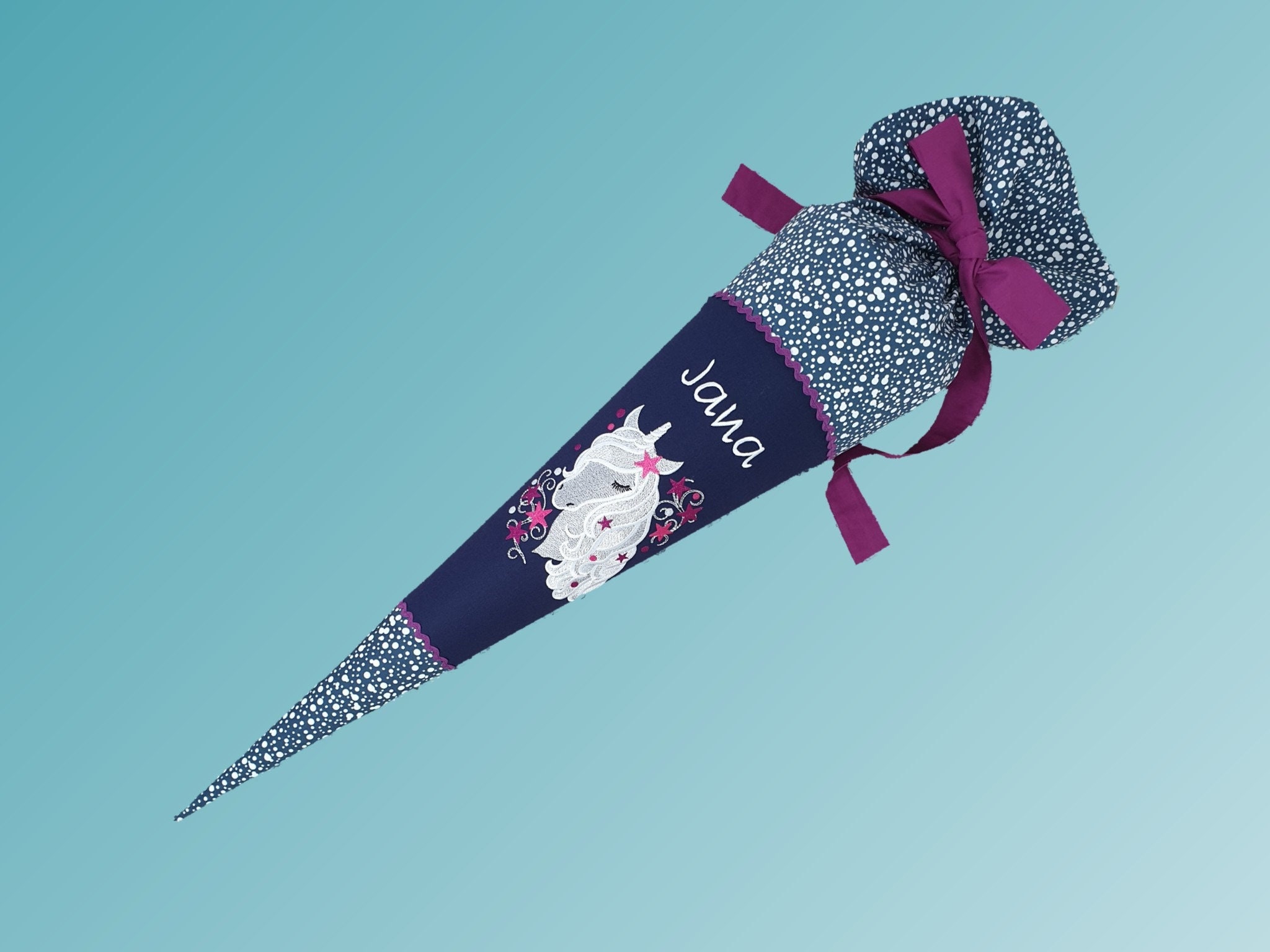 Jede Schultüte wird mit einem gestickten Motiv und dem Namen deines Kindes individuell gestaltet. Auf Wunsch fügen wir auch das Datum des ersten Schultages hinzu.