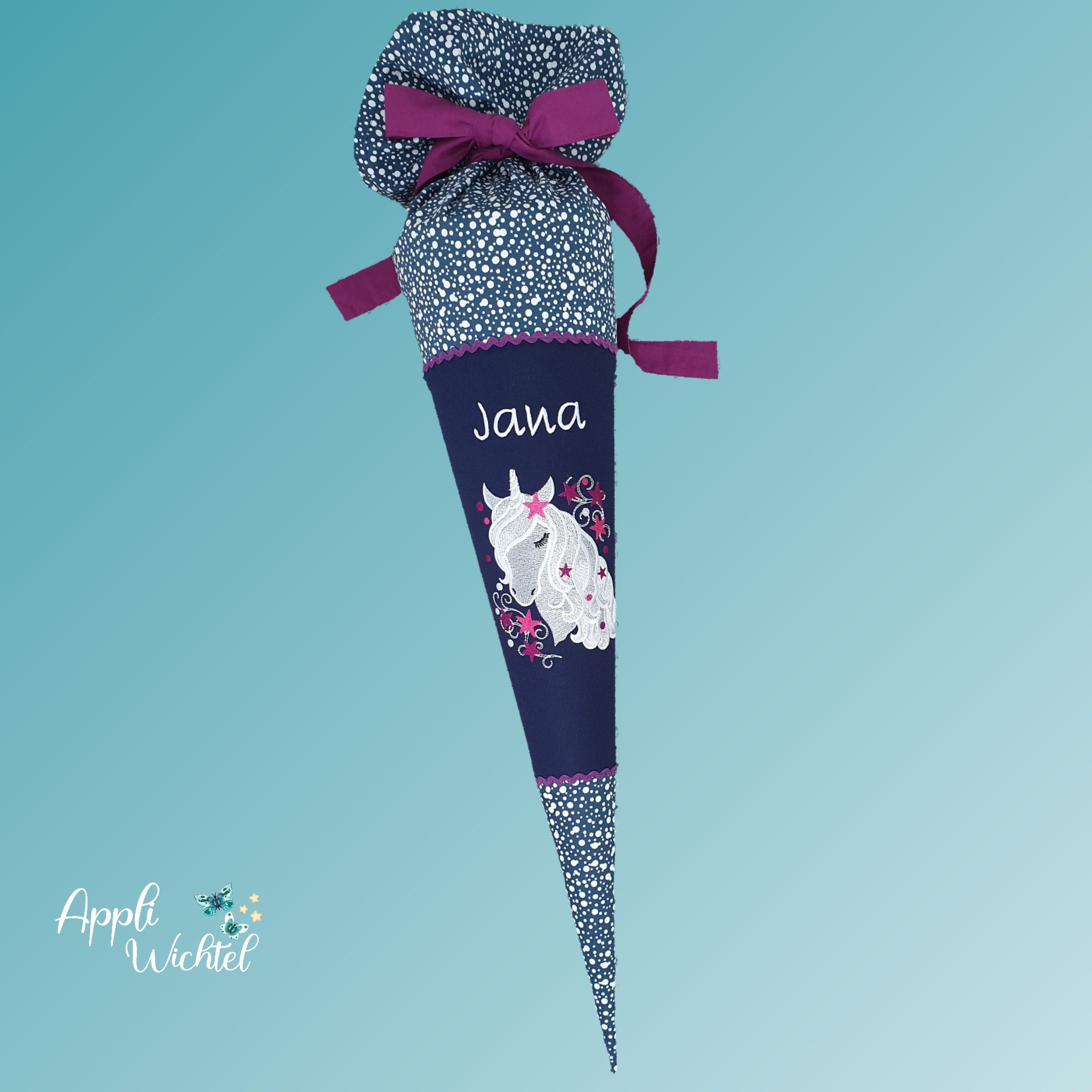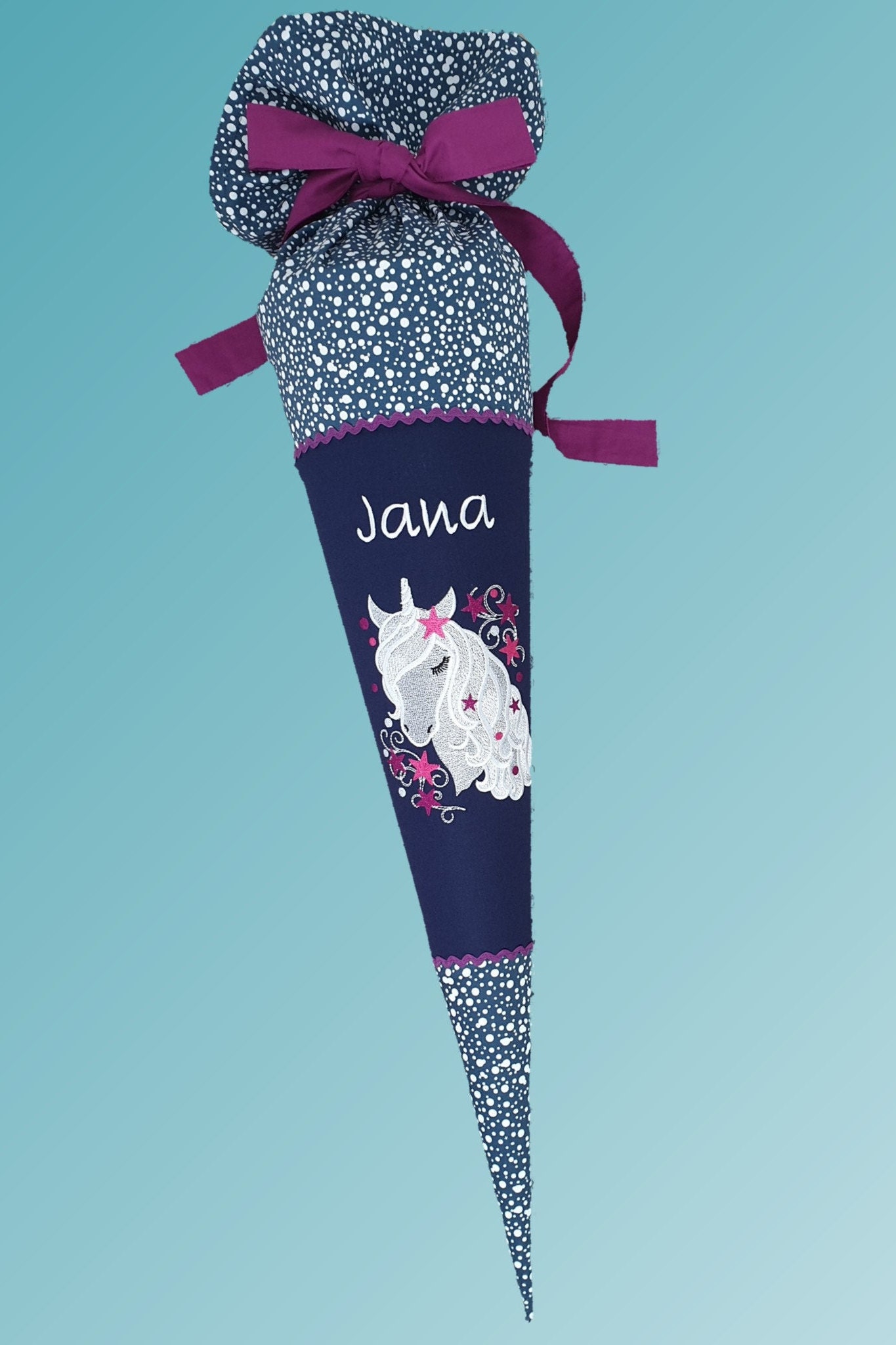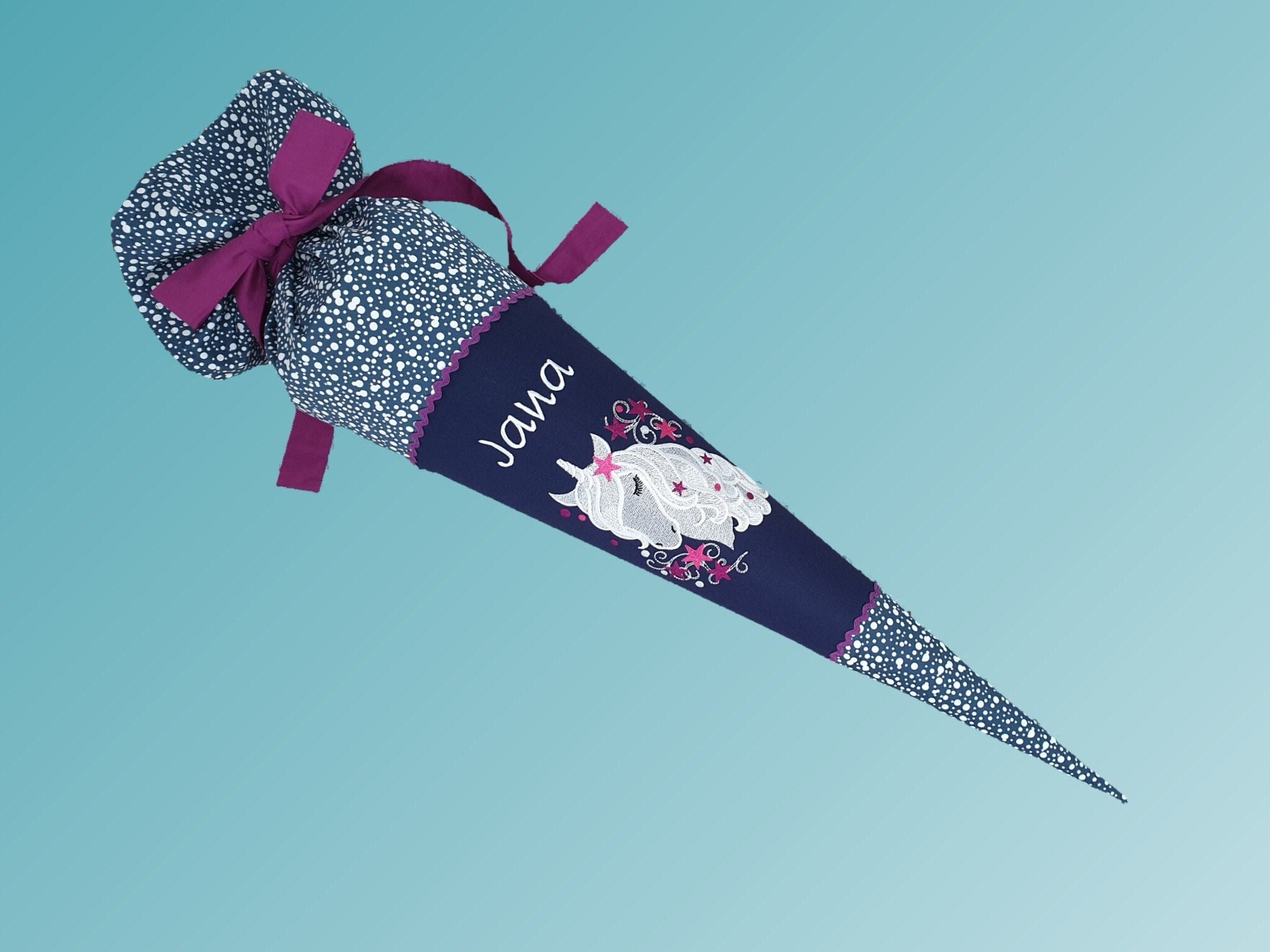 Schultüte mit Einhorn und Namen farblich auf den Ergobag Bärlaxy Schulranzen abgestimmt.